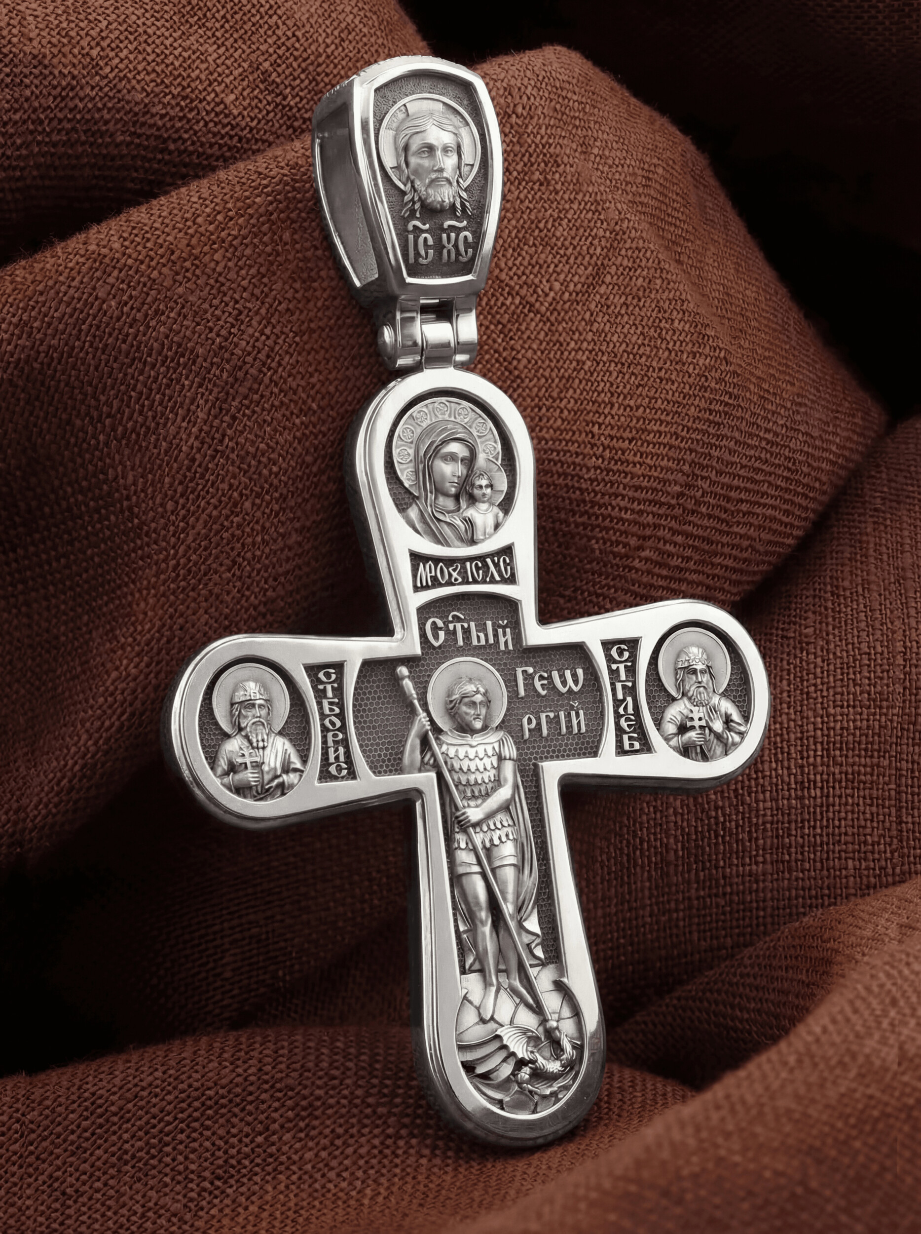 На кулонном кольце помещено изображение Спаса Нерукотворного — образ Спасителя, который Он запечатлел на плате и передал для исцеления больному проказой царю Эдессы. Ему придается победное и защитное значение.