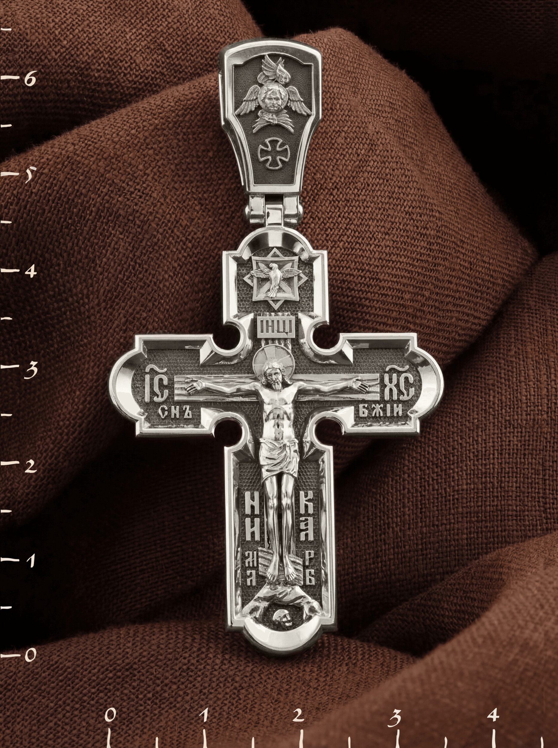 На лицевой стороне креста изображено Распятие Иисуса Христа. Господь представлен свободно покоящимся на кресте с простертыми руками и как бы обнимающим всю Вселенную. Он — Спаситель, искупивший грехи мира, «поправший смертию смерть» и призывающий к Себе «все концы земли». Поэтому рядом с Его образом помещены слова — «НИКА» и «Царь Славы». Эти слова характеризуют Господа как Великого Архиерея, победителя смерти. Верхняя перекладина символизирует титло — табличку, на которой, согласно Евангелию, было начертано: Иисус Назорей Царь Иудейский (IНЦI). Также Распятие сопровождается надписями, олицетворяющими Христа. Это святое имя Христа «IC» (Иисус) «ХС» (Христос), и словосочетание «СЫН БОЖИЙ». Крест стоит на горе камней, символизирующих Голгофу, в основании которой различается череп. Это голова Адама. На кулонном кольце помещено изображение серафима.