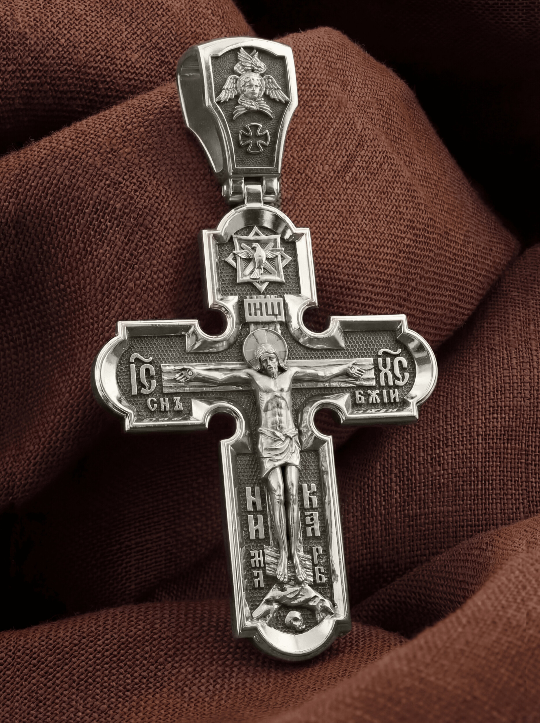 На лицевой стороне креста изображено Распятие Иисуса Христа. Господь представлен свободно покоящимся на кресте с простертыми руками и как бы обнимающим всю Вселенную. Он — Спаситель, искупивший грехи мира, «поправший смертию смерть» и призывающий к Себе «все концы земли». Поэтому рядом с Его образом помещены слова — «НИКА» и «Царь Славы». Эти слова характеризуют Господа как Великого Архиерея, победителя смерти. Верхняя перекладина символизирует титло — табличку, на которой, согласно Евангелию, было начертано: Иисус Назорей Царь Иудейский (IНЦI). Также Распятие сопровождается надписями, олицетворяющими Христа. Это святое имя Христа «IC» (Иисус) «ХС» (Христос), и словосочетание «СЫН БОЖИЙ». Крест стоит на горе камней, символизирующих Голгофу, в основании которой различается череп. Это голова Адама. На кулонном кольце помещено изображение серафима.