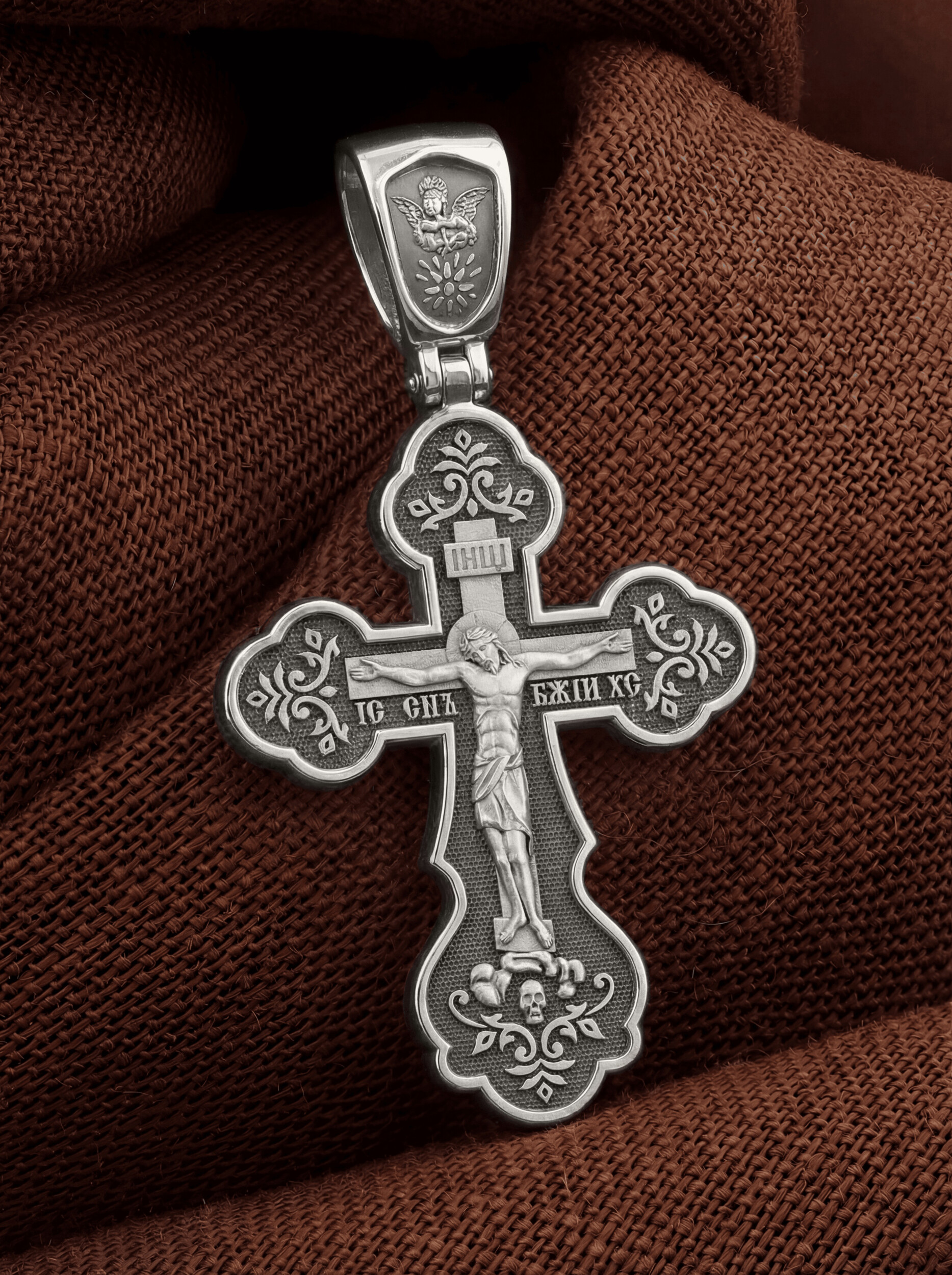 На лицевой стороне креста традиционно изображено Распятие, потому что, это орудие казни Иисус Христос сделал орудием победы над грехом и смертью. Своими страданиями Он искупил грехи человечества, умерев и сошествовав во ад, победил сатану, освободил души праведников от вечной смерти и открыл им небесные врата рая.