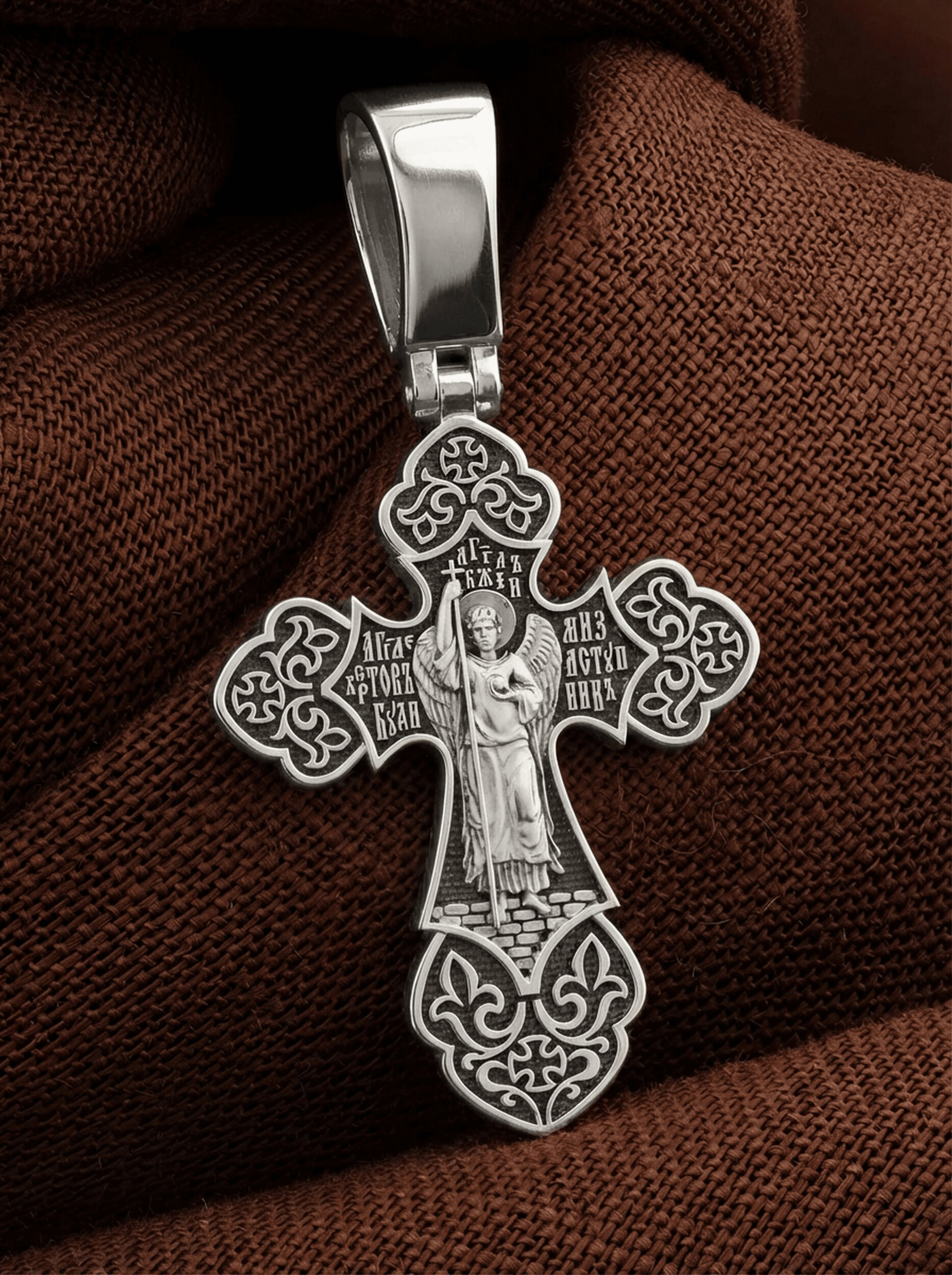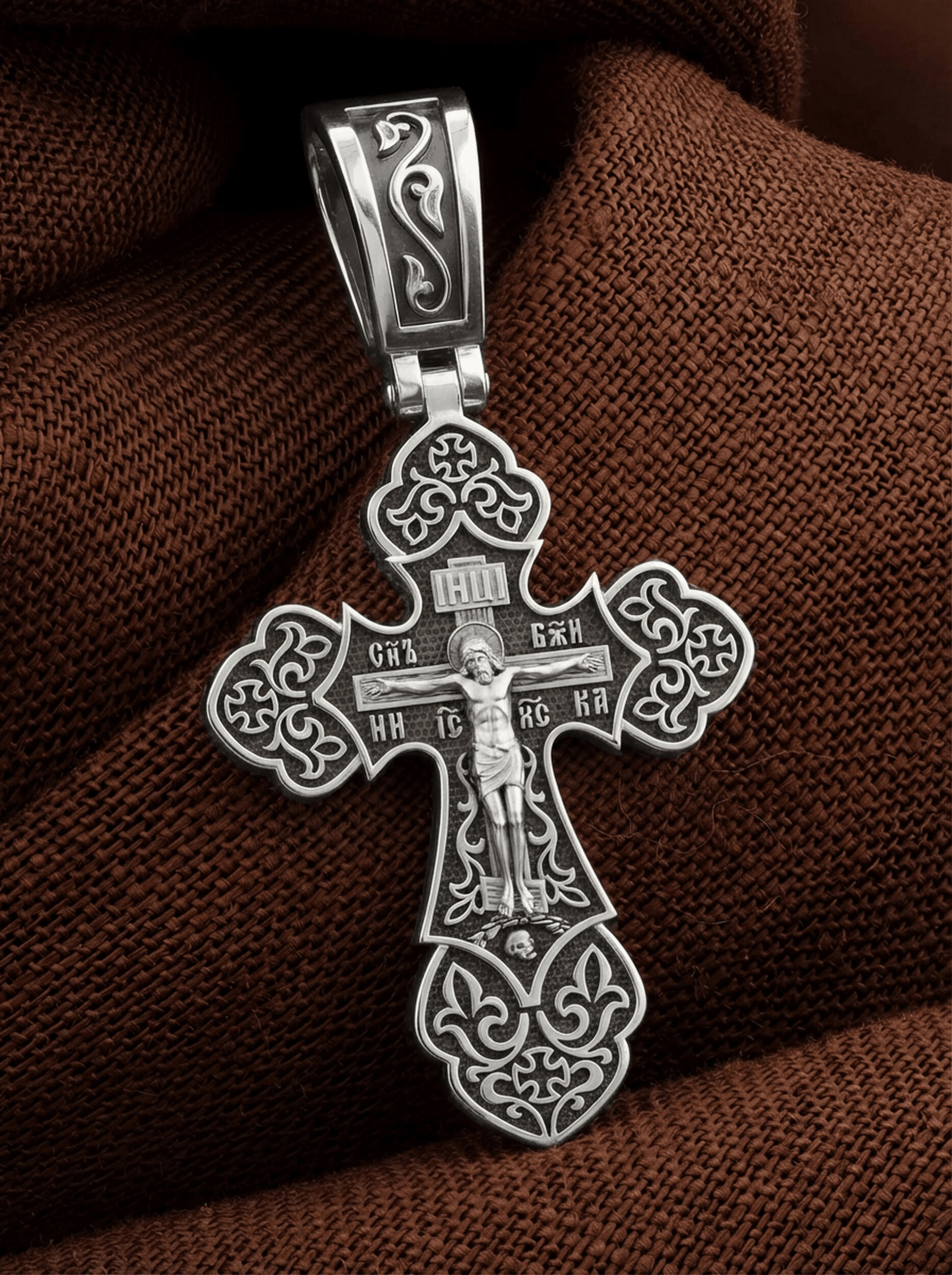 Крест с рельефным изображением Распятия в окружении пышных цветов и ажурного узора, напоминает нам о красоте Райского сада. На лицевой стороне креста изображено Распятие, потому что это орудие казни Иисус Христос сделал орудием победы над грехом и смертью. Своими страданиями Он искупил грехи человечества, умерев и сошествовав во ад, победил сатану, освободил души праведников от вечной смерти и открыл им небесные врата рая. Жертва Христа сделала возможным спасение для каждого человека. На православном кресте Христос не умирает, а свободно простирает руки, ладони Иисуса открыты, будто он хочет обнять все человечество, даря им свою любовь и открывая путь к вечной жизни. Верхняя перекладина символизирует собой табличку с надписью «IHЦI» — Иисус Назарянин Царь Иудейский. Над перекладиной пишется словосочетание «СЫН БОЖИЙ», ниже перекладины добавляется: «НИКА» (греч. — Победитель) и сокращенное имя Спасителя «IC XC» — Иисус Христос. Возвышение, на котором стоит Крест, символизирует гору Голгофу, на которой произошло Распятие. У подножия Креста изображают прах Адама, обозначенный черепом.