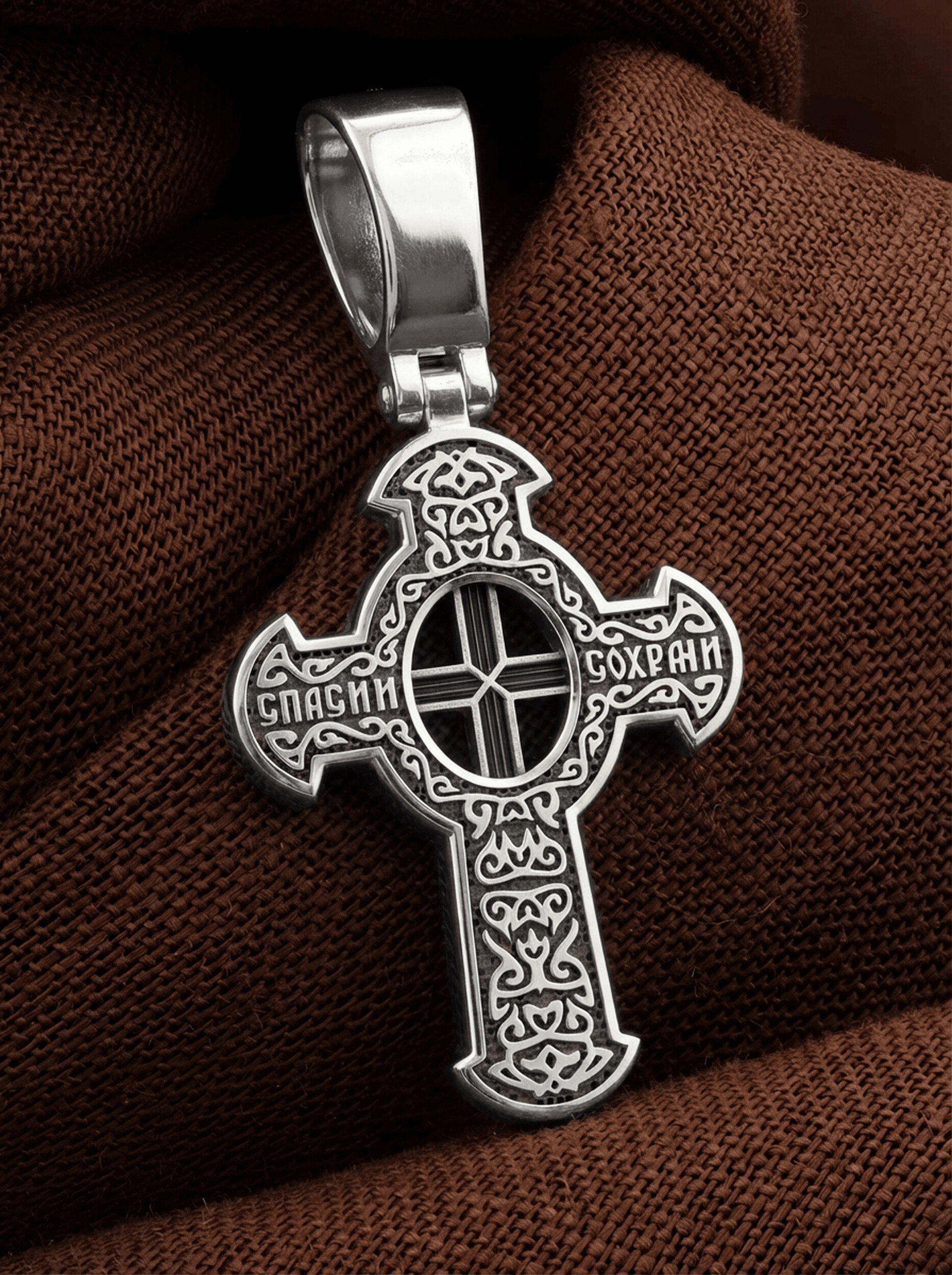 Оборотная сторона креста украшена растительным орнаментом. Помещенный на крест орнамент символизирует жизнедательную силу, животворное тепло креста. В растительный узор, на горизонтальной перекладине, вписано молитвенное славословие: «Спаси и сохрани». Эта надпись означает непрерывную молитву, совершаемую носителем данного креста.