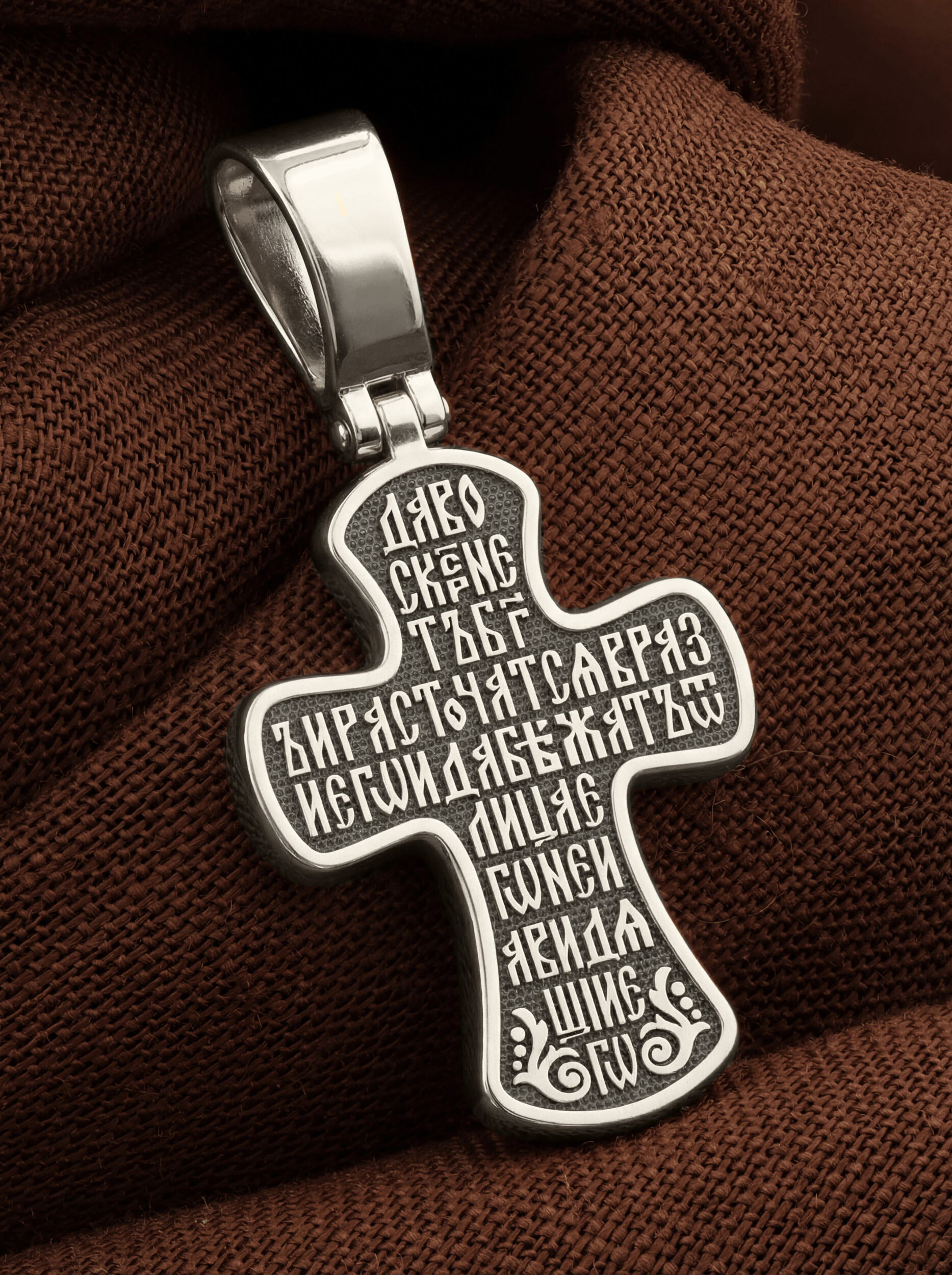 Всю оборотную часть креста занимает начальный стих оградительной молитвы Честному Кресту Господню: «Да воскреснет Бог, и расточатся врази Его, и да бежат от лица Его ненавидящие Его.»