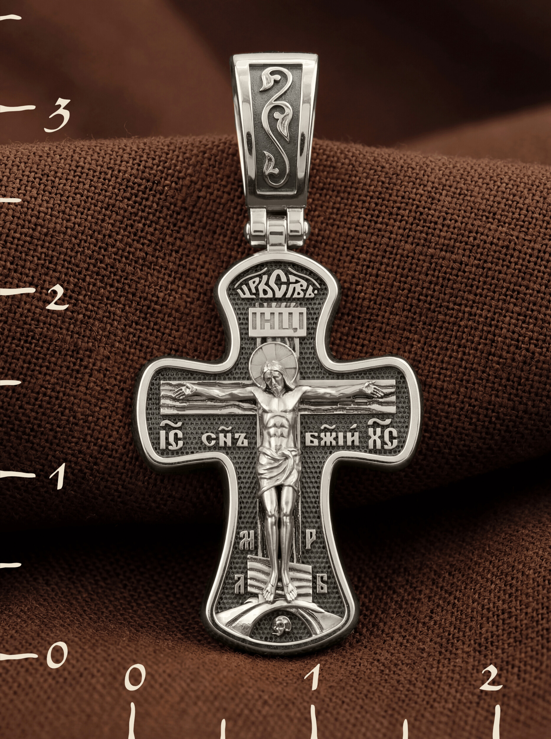 Крест четырехконечный со слегка расширяющимися лопастями. Такая форма креста имеет многочисленные духовные смыслы. Ее устремленная ввысь вертикаль означает справедливость и непреложность Божественных заповедей, прямоту Божией правды и истины, не допускающей никаких нарушений. Эта прямота пересекается поперечной перекладиной, означающей любовь и милость Божию к грешным людям. На лицевой стороне креста изображено Распятие, потому что это орудие казни Иисус Христос сделал орудием победы над грехом и смертью. На лицевой стороне креста изображено Распятие Иисуса Христа. Над титлом видим слова «ЦРЬ СЛВЫ» — Царь Славы. Верхняя перекладина символизирует собой табличку с надписью «IHЦI» — Иисус Назарянин Царь Иудейский. Над перекладиной пишется сокращенно имя Спасителя «IC XC» — Иисус Христос и словосочетание «СНЪ БЖIЙ» — «СЫН БОЖИЙ». Две пары букв на кресте «МЛ» «РБ» означают: Место Лобное Рай Бысть. Возвышение, на котором стоит Крест, символизирует гору Голгофу, на которой произошло Распятие. У подножия Креста изображают прах Адама, обозначенный черепом.