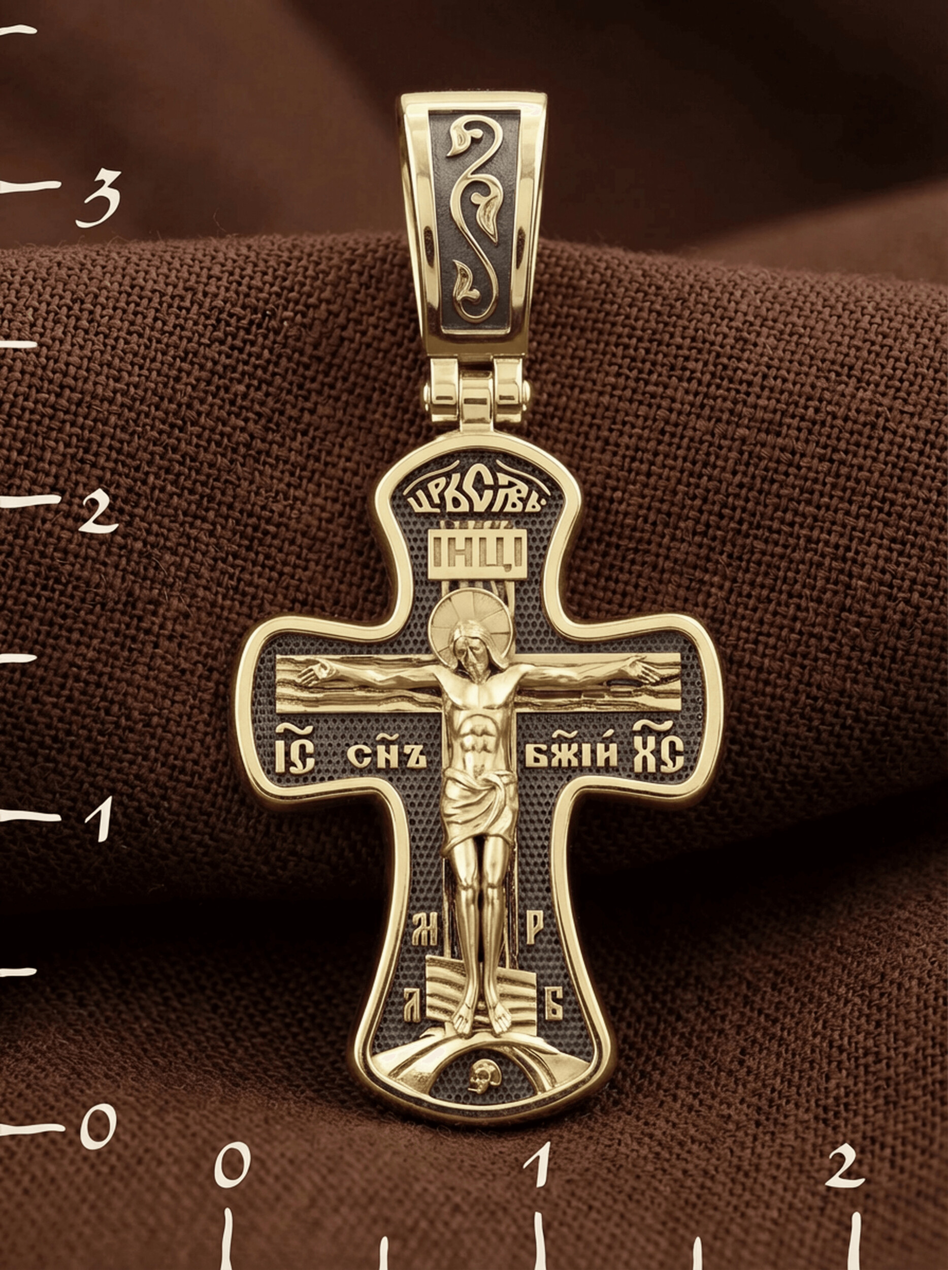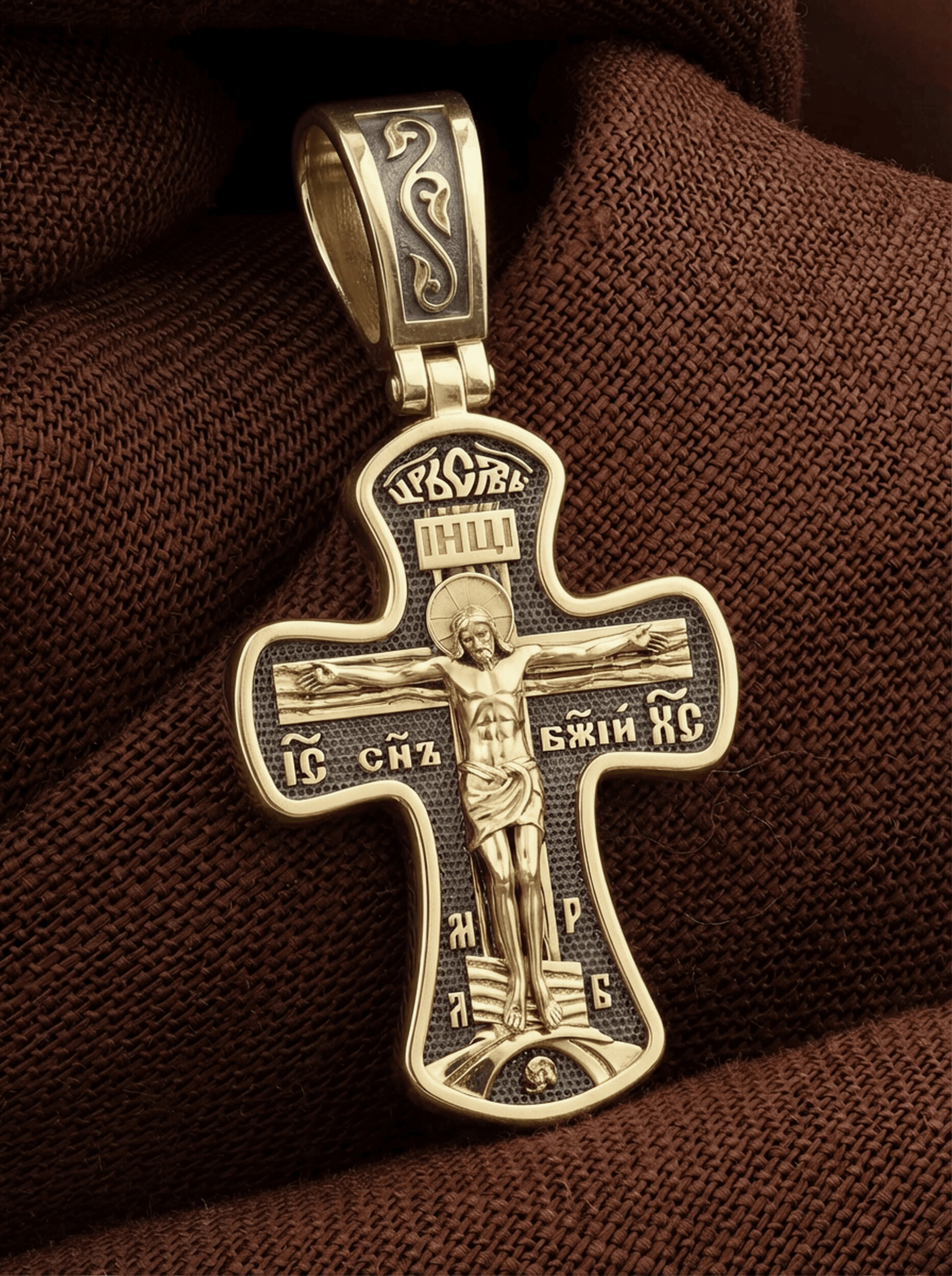 Крест четырехконечный со слегка расширяющимися лопастями. Такая форма креста имеет многочисленные духовные смыслы. Ее устремленная ввысь вертикаль означает справедливость и непреложность Божественных заповедей, прямоту Божией правды и истины, не допускающей никаких нарушений. Эта прямота пересекается поперечной перекладиной, означающей любовь и милость Божию к грешным людям. На лицевой стороне креста изображено Распятие, потому что это орудие казни Иисус Христос сделал орудием победы над грехом и смертью. На лицевой стороне креста изображено Распятие Иисуса Христа. Над титлом видим слова «ЦРЬ СЛВЫ» — Царь Славы. Верхняя перекладина символизирует собой табличку с надписью «IHЦI» — Иисус Назарянин Царь Иудейский. Над перекладиной пишется сокращенно имя Спасителя «IC XC» — Иисус Христос и словосочетание «СНЪ БЖIЙ» — «СЫН БОЖИЙ». Две пары букв на кресте «МЛ» «РБ» означают: Место Лобное Рай Бысть. Возвышение, на котором стоит Крест, символизирует гору Голгофу, на которой произошло Распятие. У подножия Креста изображают прах Адама, обозначенный черепом.