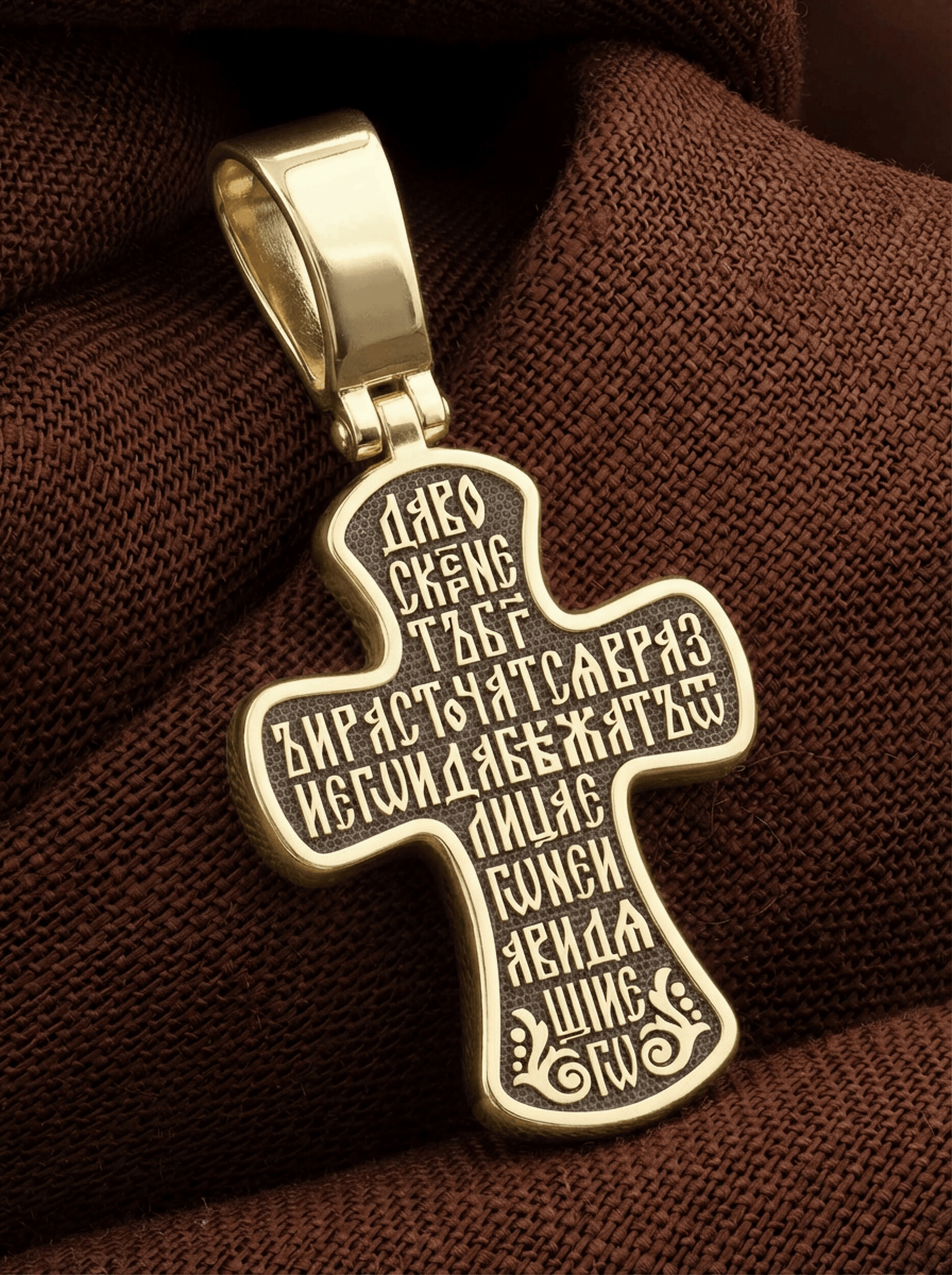 Всю оборотную часть креста занимает начальный стих оградительной молитвы Честному Кресту Господню: «Да воскреснет Бог, и расточатся врази Его, и да бежат от лица Его ненавидящие Его.»