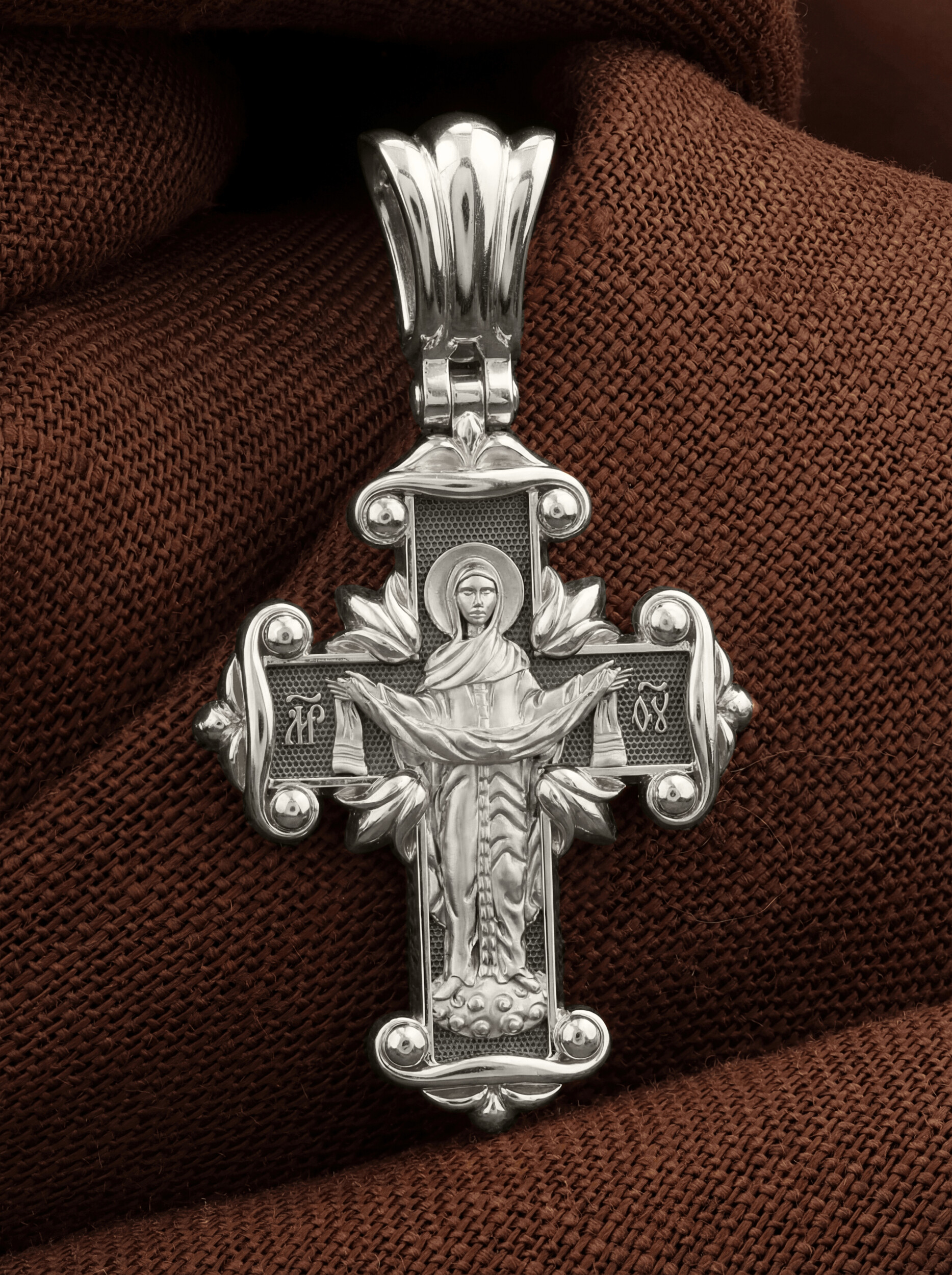 На оборотной стороне креста изображена икона Божией Матери «Покров Пресвятой Богородицы». Праздник Покрова Пресвятой Богородицы пришел на Русь в XII веке из Византии и стал одним из самых почитаемых. В 910 году Византийской Империи угрожали нападением сарацины. Не видя ниоткуда помощи, в те дни греки во множестве стекались в Константинополь, во Влахернский храм, в котором хранились риза Богоматери и Ее головной покров, и молились. 1 (14) октября 910 года Святому Андрею Юродивому и его ученику Епифанию было видение Покрова Божией Матери. Пресвятая Богородица, в окружении Святых, явилась над алтарем Храма и слезно молилась. По окончании молитвы сняла с Себя блистающее великое и страшное покрывало, которое носила на Пречистой главе Своей и, держа его с великой торжественностью, распростерла над всем стоящим народом. Вскоре враги без всякого кровопролития отступили от города. Богородица простирает Свой молитвенный покров над всеми православными христианами и умоляет Сына своего о даровании вечного спасения каждому человеку.