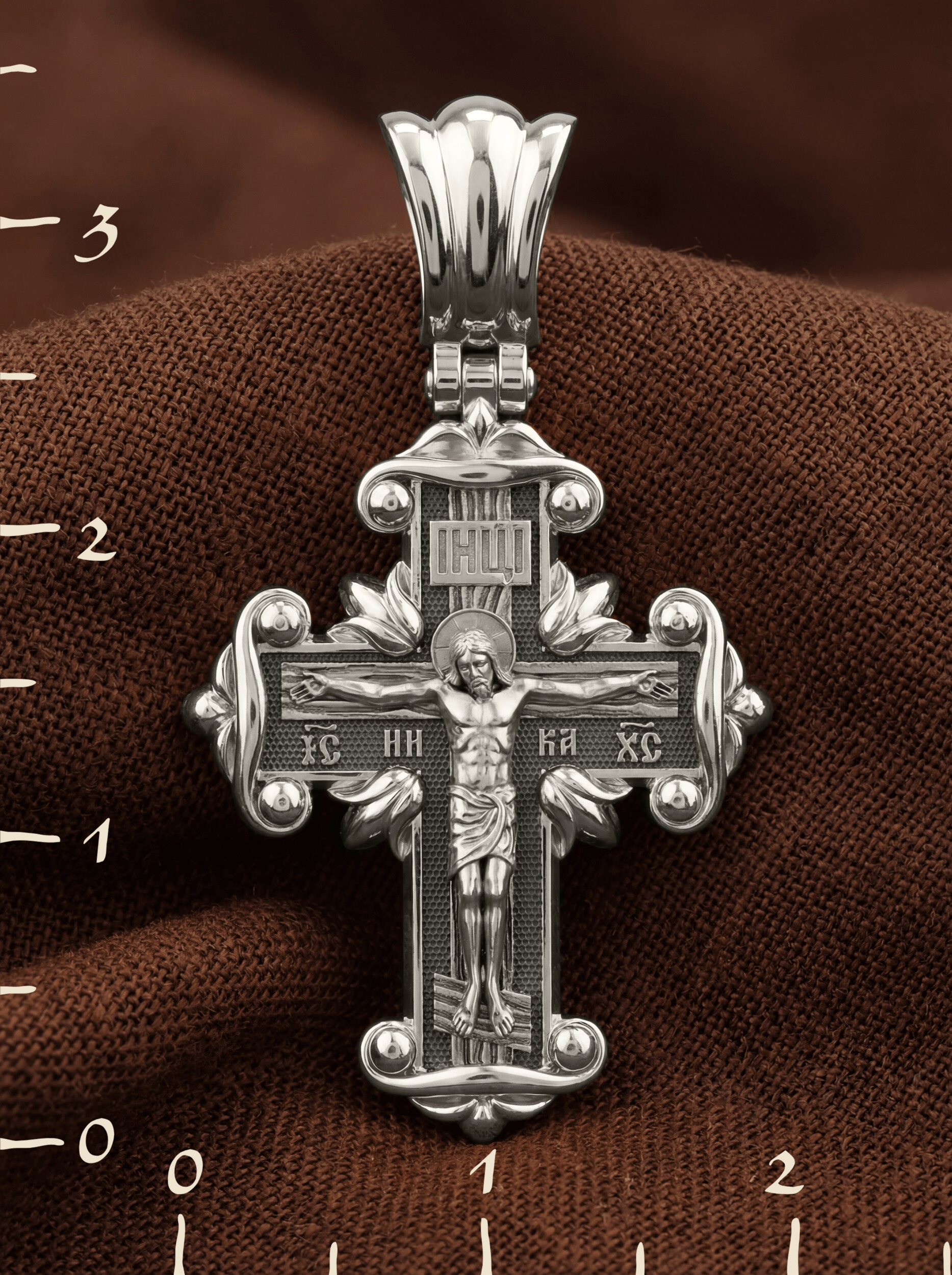 На лицевой стороне креста изображено Распятие Господа и Спасителя нашего Иисуса Христа, отдавшего Себя на смерть, для искупления грехов мира. Крест является символом жертвенной любви Всеблагого Бога к падшим людям, всепобеждающим духовным оружием христиан, основанием и средоточием церковной жизни. Господь сказал: кто хочет идти за Мною, отвергнись себя, и возьми крест свой, и следуй за Мною. (Мк. 8: 34). На верхней табличке, выше головы Иисуса, расположена надпись, составленная Понтием Пилатом — «IНЦI». Она означает «Иисус Назорей, Царь Иудейский». Надпись «IC» «ХC», означает Иисус Христос, помещается на разных сторонах поперечной перекладины креста. Рядом — слово «НИКА», что означает «победитель». На православном кресте Христос не умирает, а свободно простирает руки, ладони Иисуса открыты, будто он хочет обнять все человечество, даря им свою любовь и открывая путь к вечной жизни.
