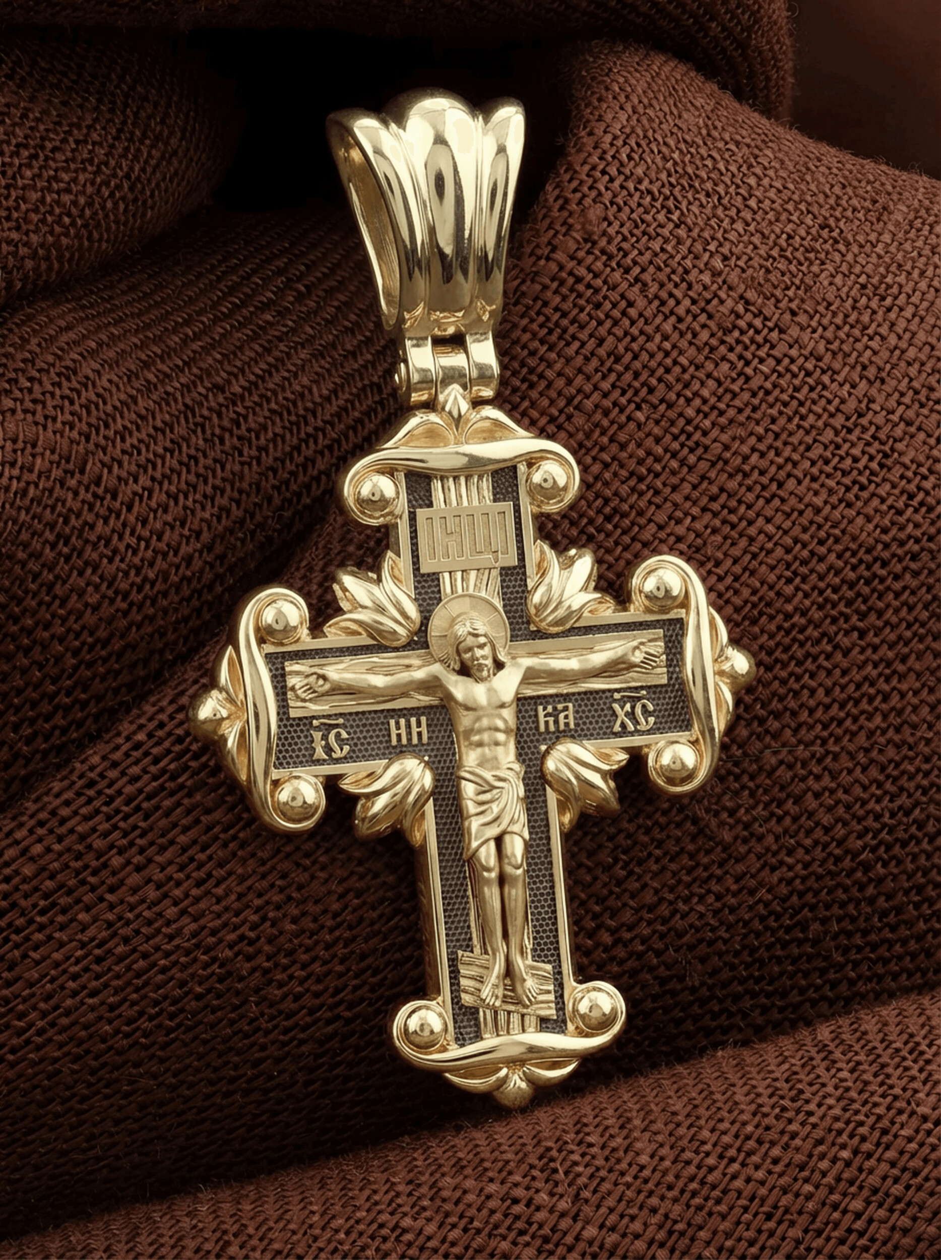 На лицевой стороне креста изображено Распятие Господа и Спасителя нашего Иисуса Христа, отдавшего Себя на смерть, для искупления грехов мира. Крест является символом жертвенной любви Всеблагого Бога к падшим людям, всепобеждающим духовным оружием христиан, основанием и средоточием церковной жизни. Господь сказал: кто хочет идти за Мною, отвергнись себя, и возьми крест свой, и следуй за Мною. (Мк. 8: 34). На верхней табличке, выше головы Иисуса, расположена надпись, составленная Понтием Пилатом — «IНЦI». Она означает «Иисус Назорей, Царь Иудейский». Надпись «IC» «ХC», означает Иисус Христос, помещается на разных сторонах поперечной перекладины креста. Рядом — слово «НИКА», что означает «победитель». На православном кресте Христос не умирает, а свободно простирает руки, ладони Иисуса открыты, будто он хочет обнять все человечество, даря им свою любовь и открывая путь к вечной жизни.