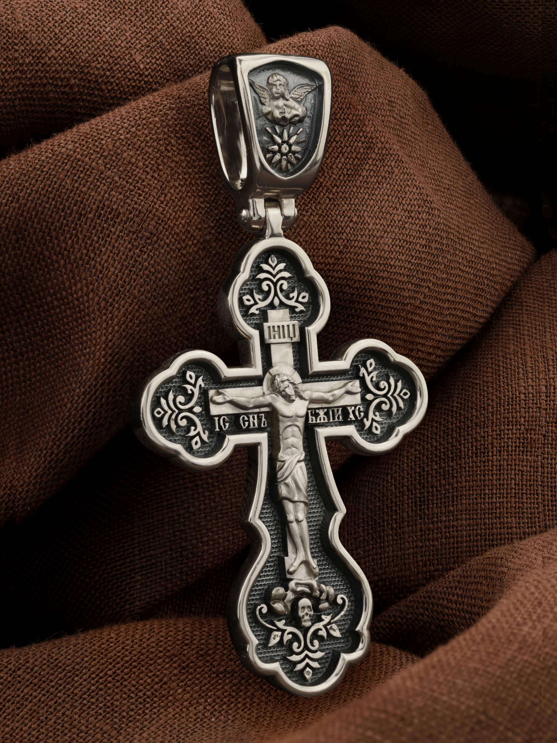 На лицевой стороне креста изображено Распятие Господа и Спасителя нашего Иисуса Христа. Христос, подвергнутый на кресте мучительной казни, своими страданиями искупил нас от древнего греха и даровал нам жизнь вечную. Крест означает своей вертикальной прямой линией справедливость и непреложность Божественных заповедей, прямоту Божией правды и истины, не допускающей никаких нарушений. Эта прямота пересекается главной поперечной перекладиной, означающей любовь и милость Божию к падшим и падающим грешникам, ради которой и был принесен в жертву Сам Господь, взявший на Себя грехи всех людей. На верхней табличке, выше головы Иисуса, расположена надпись, составленная Понтием Пилатом — «IНЦI». Она означает «Иисус Назорей, Царь Иудейский». Надпись «IС ХС» означает Иисус Христос и словосочетание «СЫН БОЖИЙ», что означает божественную природу Иисуса Христа, помещается на разных сторонах поперечной перекладины креста. Крест стоит на горе камней, символизирующих Голгофу. Под подножием Креста изображена покоящаяся голова (череп) Адама, грехи которого Христос омыл Своею Кровью. Христос в Своей Божественной любви, над которой смерть не властна и которая, страдая, и не страдает в обычном смысле, простирает к людям со Креста Свои объятия, в которые призывается и привлекается весь мир. Поэтому Тело Его не висит, а торжественно покоится на Кресте. Здесь Христос, распятый и умерший, удивительным образом жив в самой смерти Своей. На кулонном кольце изображен Ангел Херувим. Херувимы сияют всегда светом Богопознания, ведением таин и глубин премудрости Божией, сами просвещаемые и других просвещающие.