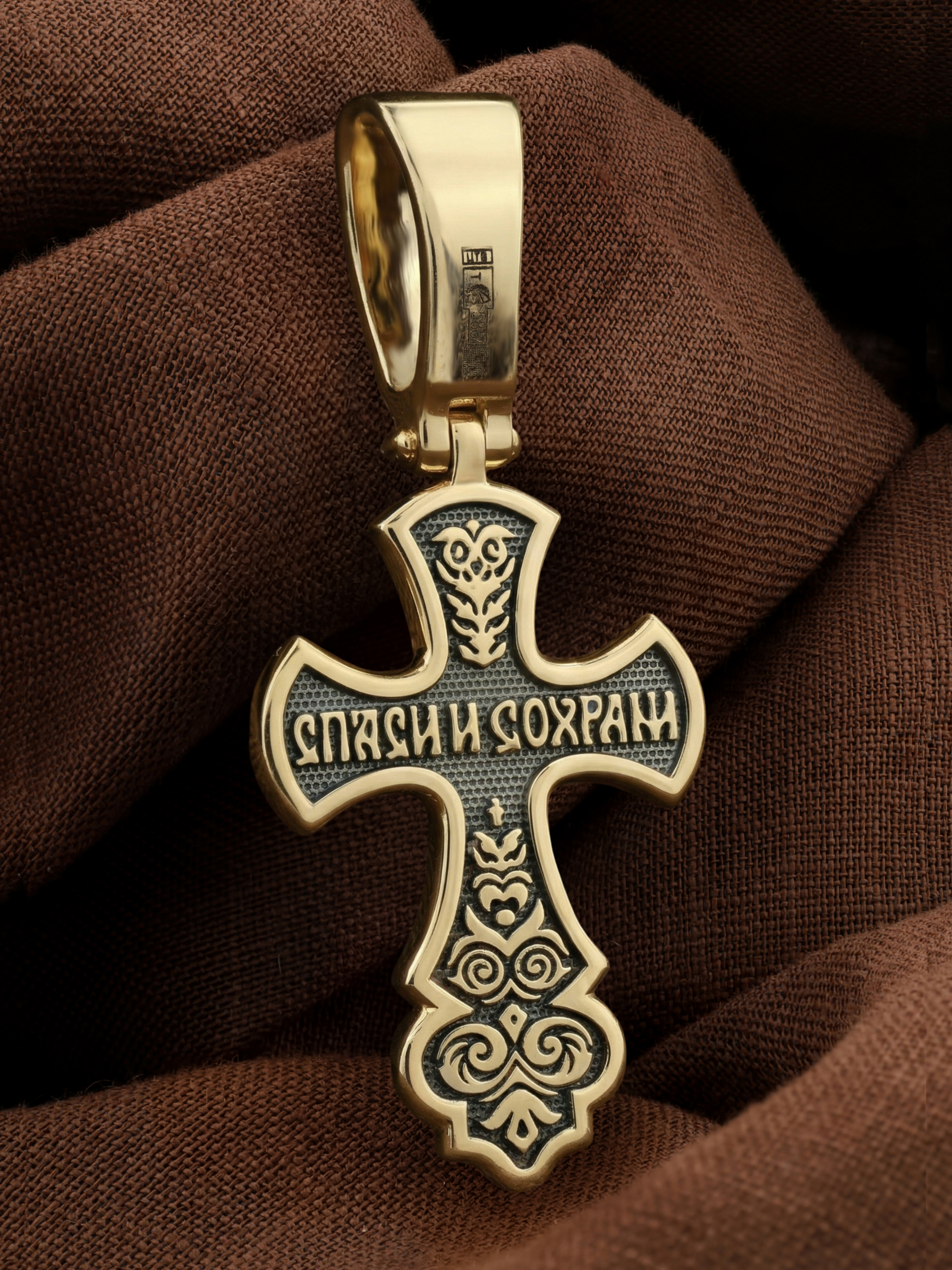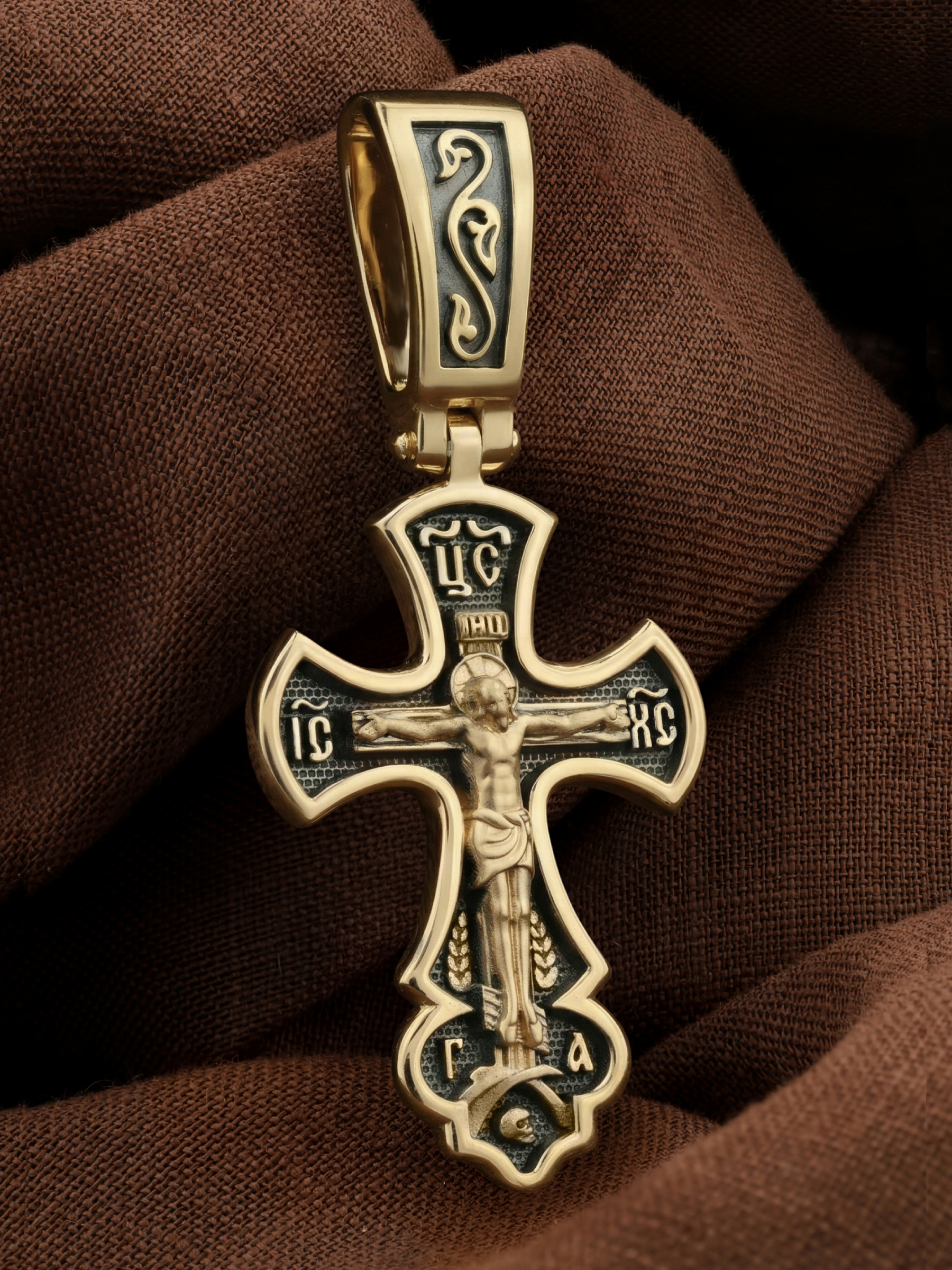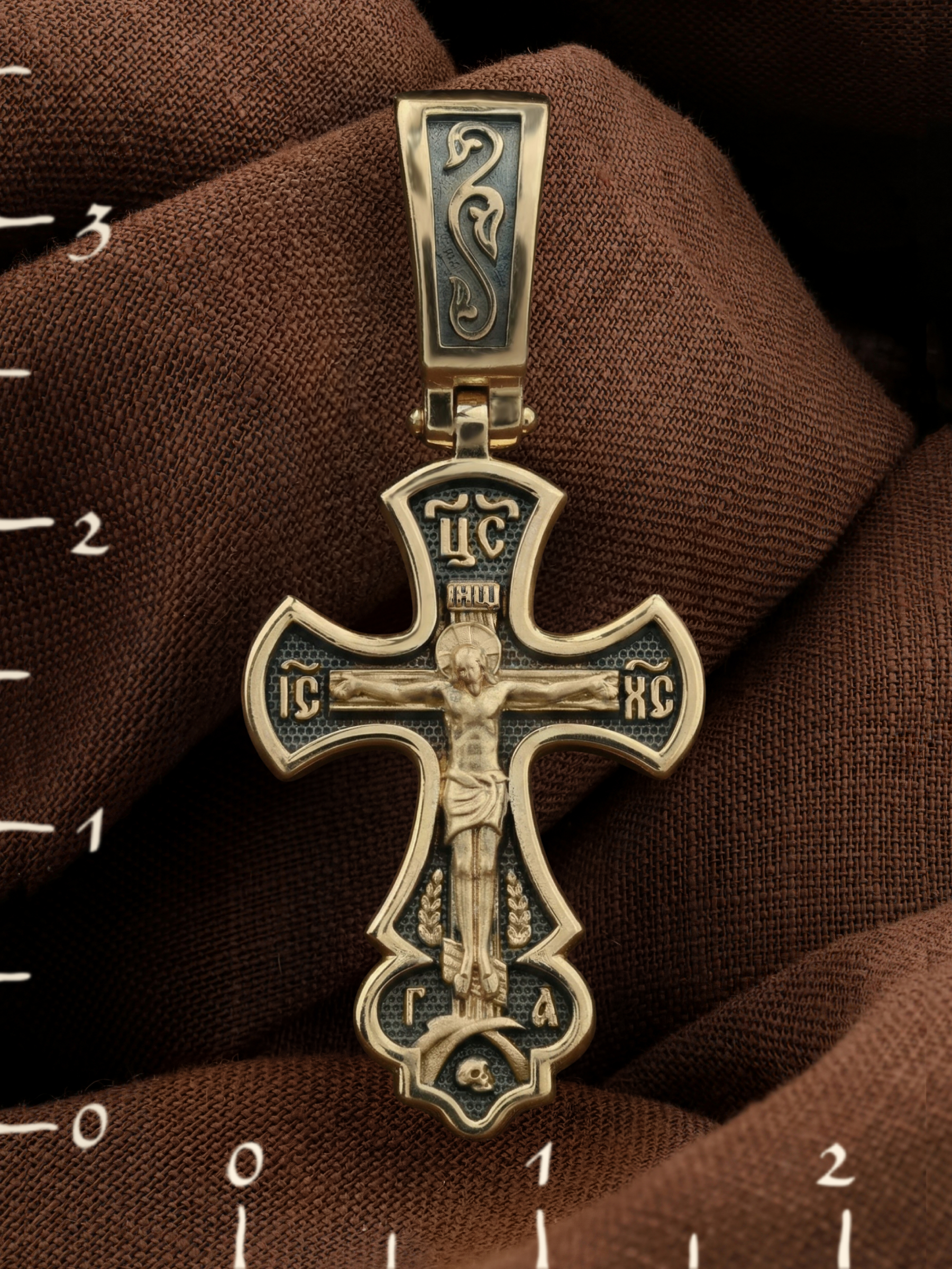 На лицевой стороне креста изображено Распятие, потому что это орудие казни Иисус Христос сделал орудием победы над грехом и смертью. Своими страданиями Он искупил грехи человечества, умерев и сошествовав во ад, победил сатану, освободил души праведников от вечной смерти и открыл им небесные врата рая. Жертва Христа сделала возможным спасение для каждого человека. На православном кресте Христос не умирает, а свободно простирает руки, ладони Иисуса открыты, будто он хочет обнять все человечество, даря им свою любовь и открывая путь к вечной жизни. Над титлом видим буквы «Ц» «С» — Царь Славы. Верхняя перекладина символизирует собой табличку с надписью «IHЦI» — Иисус Назарянин Царь Иудейский. По бокам поперечной перекладины сокращенно написано святое имя Христа «IС ХС». Буквы «Г» и «А» обозначают «Голова Адама». Возвышение, на котором стоит Крест, символизирует гору Голгофу, на которой произошло Распятие. У подножия Креста изображают прах Адама, обозначенный черепом.