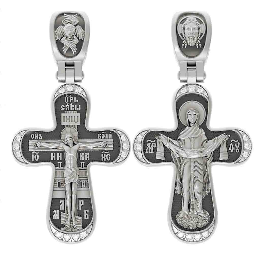На обороте креста изображена икона Покрова Пресвятой Богородицы. Праздник Покрова Божией Матери является воспоминанием чуда, которое произошло во Влахнернской церкви 1 (14) октября 910 года: Пресвятая Богородица явилась верующим над алтарем храма и распростерла над ними Свое покрывало. В этот день Божья Матерь открыла людям, что Она является Ходатаицей за них перед Богом. Богородица простирает Свой молитвенный покров над всеми православными христианами и умоляет Сына Своего о даровании вечного спасения каждому человеку. На кулонном кольце помещено изображение Спаса Нерукотворного — образ Спасителя, который Он запечатлел на плате и передал для исцеления больному проказой царю Эдессы. Ему придается победное и защитное значение.