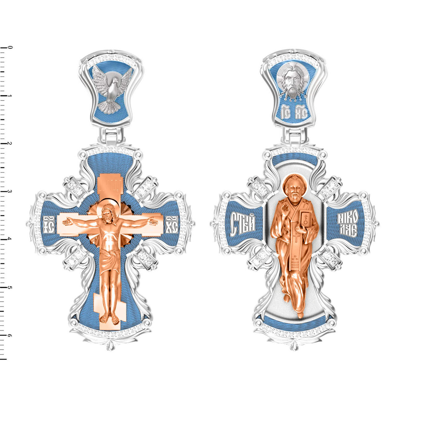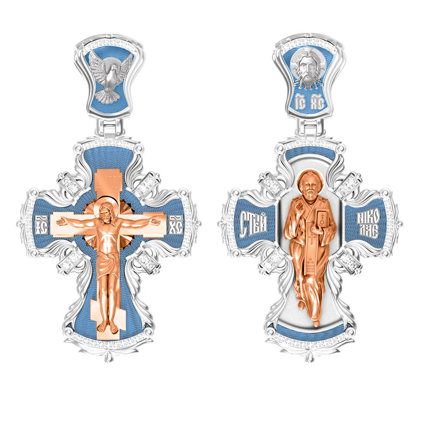 Оборотную сторону креста возглавляет икона святителя Николая Чудотворца, самого почитаемого святого не только в России, но и во всем мире. Николай Чудотворец, помощник в делах, защитник путешествующих, покровитель учащихся, утешитель обиженных и нуждающихся, целитель самых страшных и тяжелых недугов, предстатель и молитвенник за людей перед Богом. На кулонном кольце помещено изображение Спаса Нерукотворного — образ Спасителя, который Он запечатлел на плате и передал для исцеления больному проказой царю Эдессы.