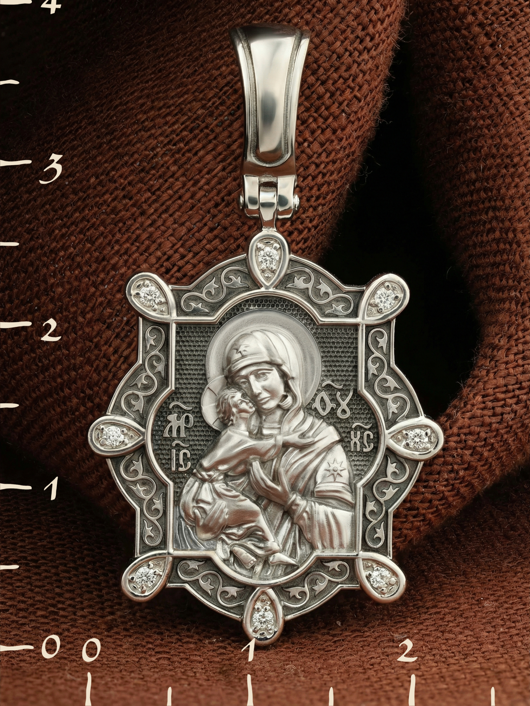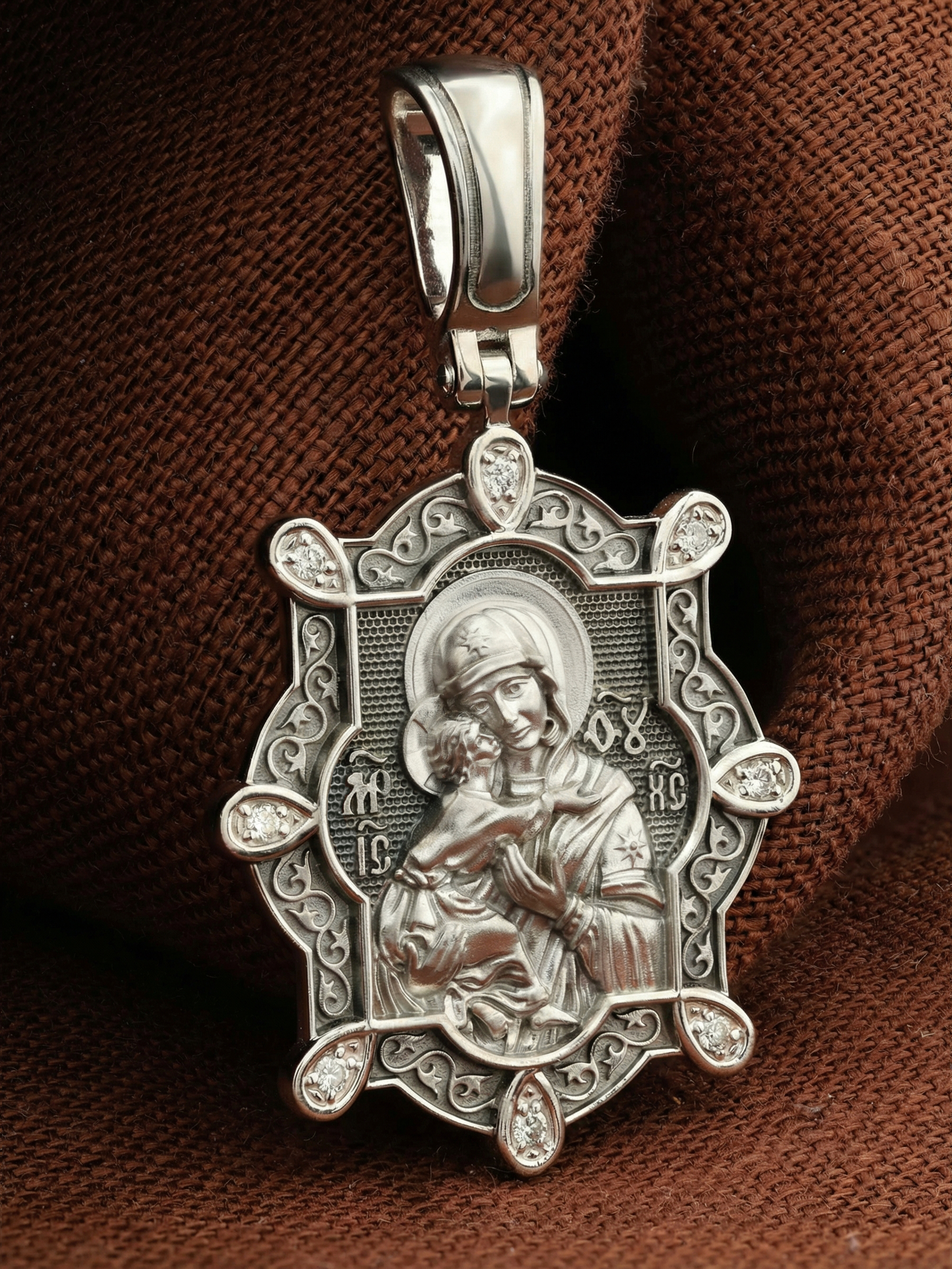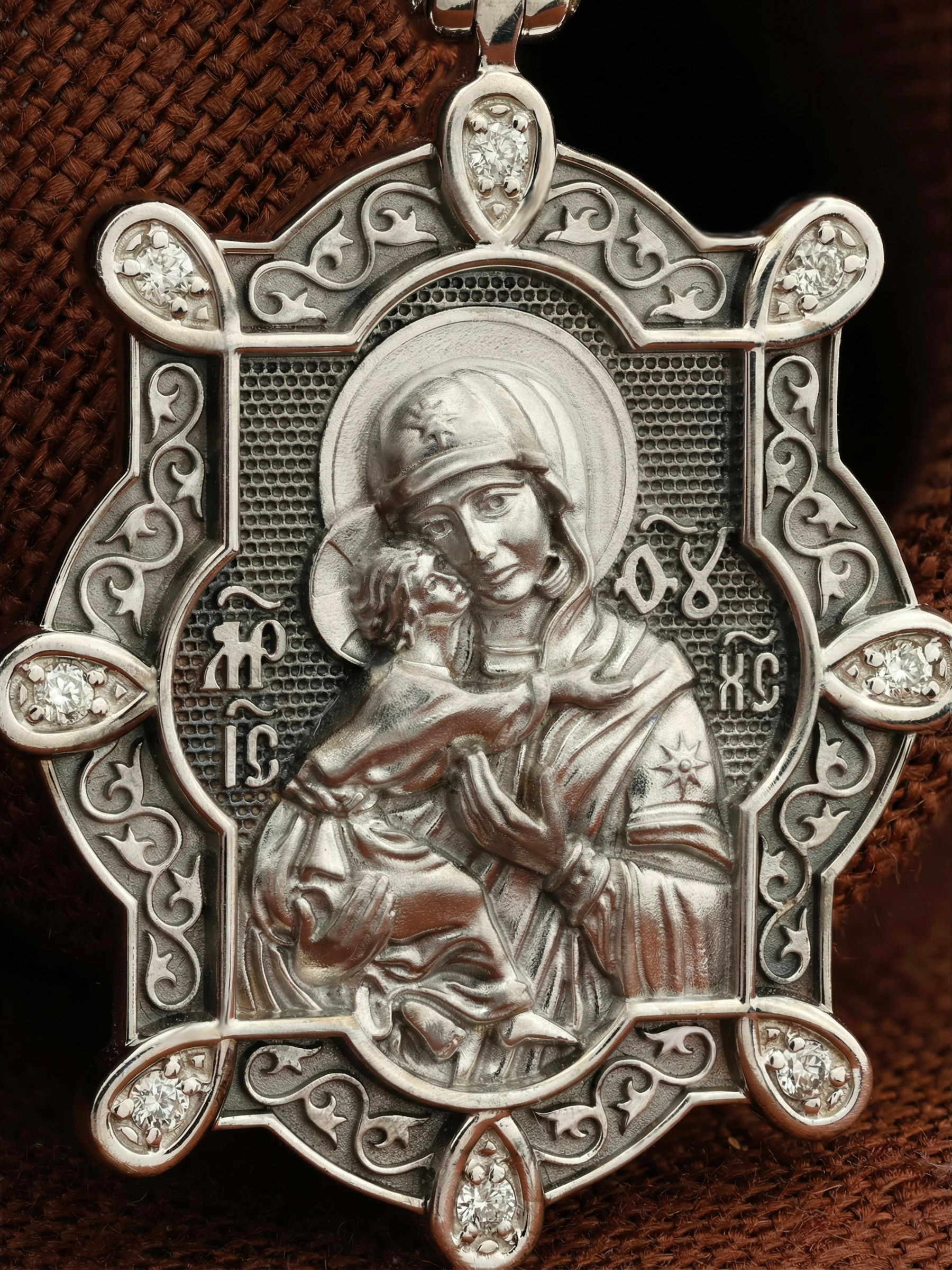 Лицевую сторону возглавляет Владимирская икона Божией Матери. По преданию, она была написана на доске трапезного стола из дома Иисуса Христа. На Русь икона была привезена в начале XII века и с тех пор почитается как главная святыня нашего Отечества. Перед ней молитвенно просят Богородицу об исцелении от телесных недугов, в частности, заболеваний сердца и сердечно-сосудистой системы. За помощью к Владимирской иконе Божией Матери обращаются во время бедствий, когда нуждаются в защите от врагов.