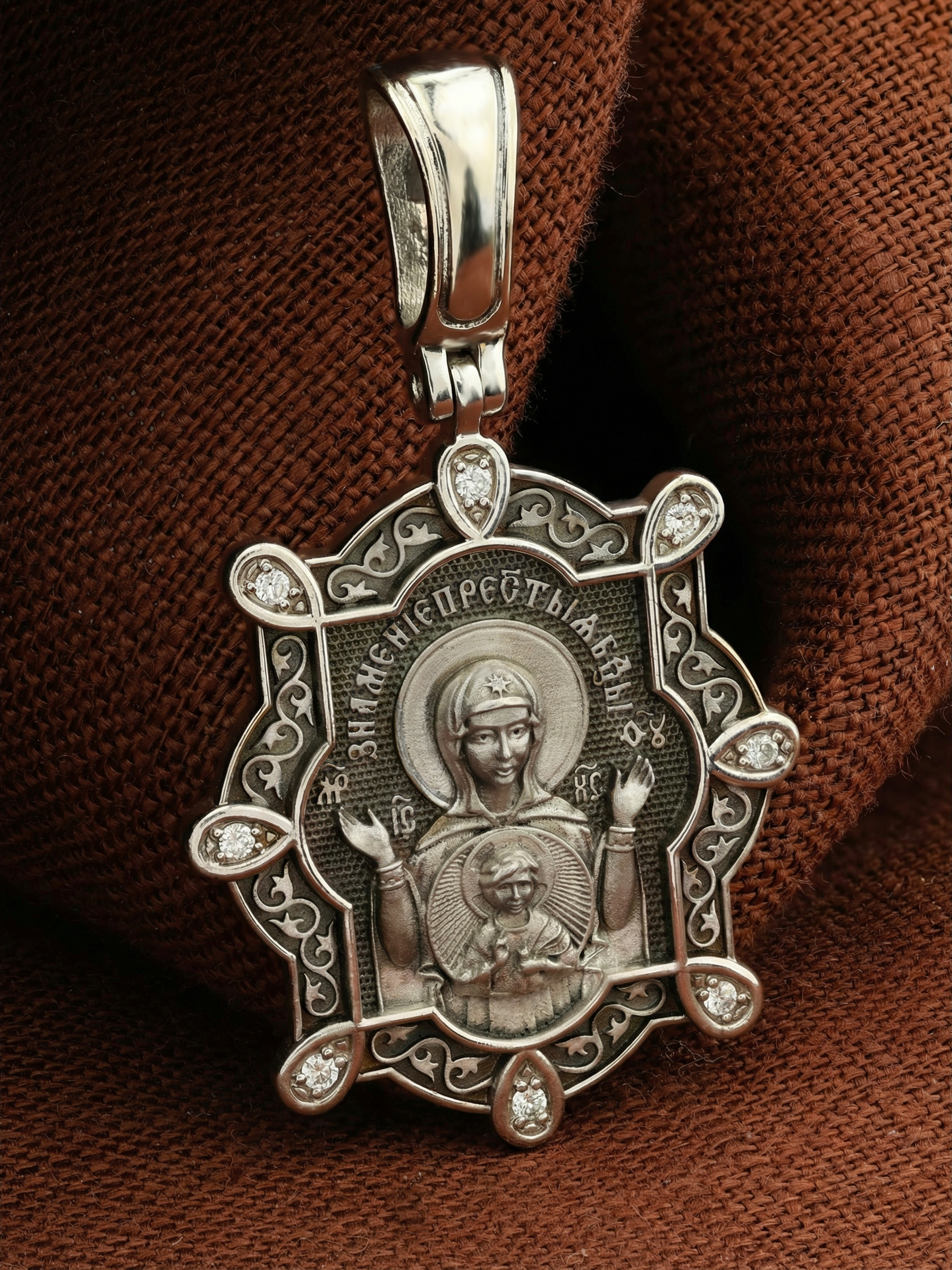 В центр образка помещен образ Божией Матери «Знамение», прославившийся многими чудесами в Новгороде в XII веке. Икона эта чтится как одна из самых великих святынь Русской земли. Молитвенно воздетые руки Богородицы означают заступничество за людей пред Богом. Рядом с Ней, на фоне круглого щита, — благословляющий Божественный Младенец — Спас-Эммануил.