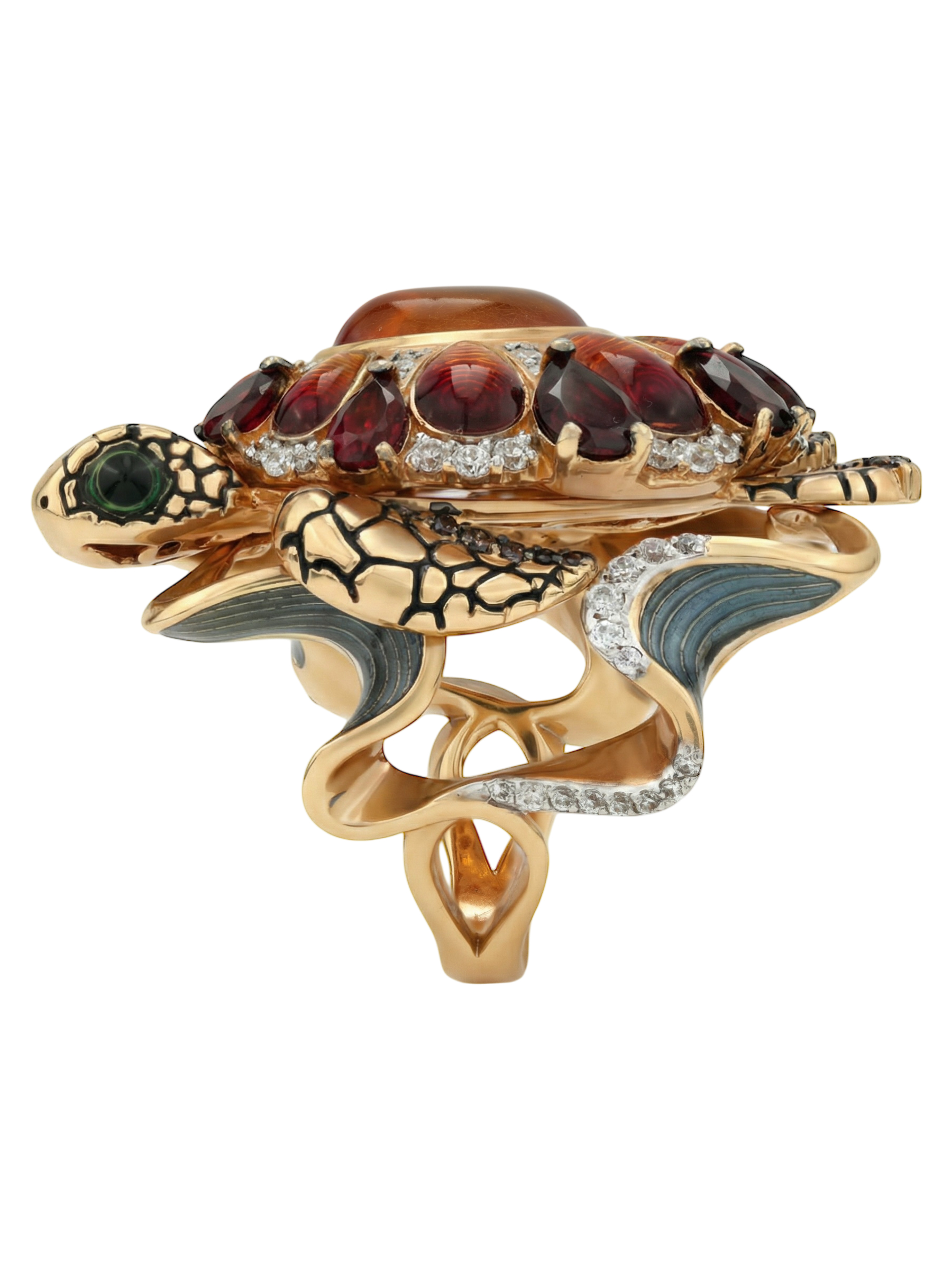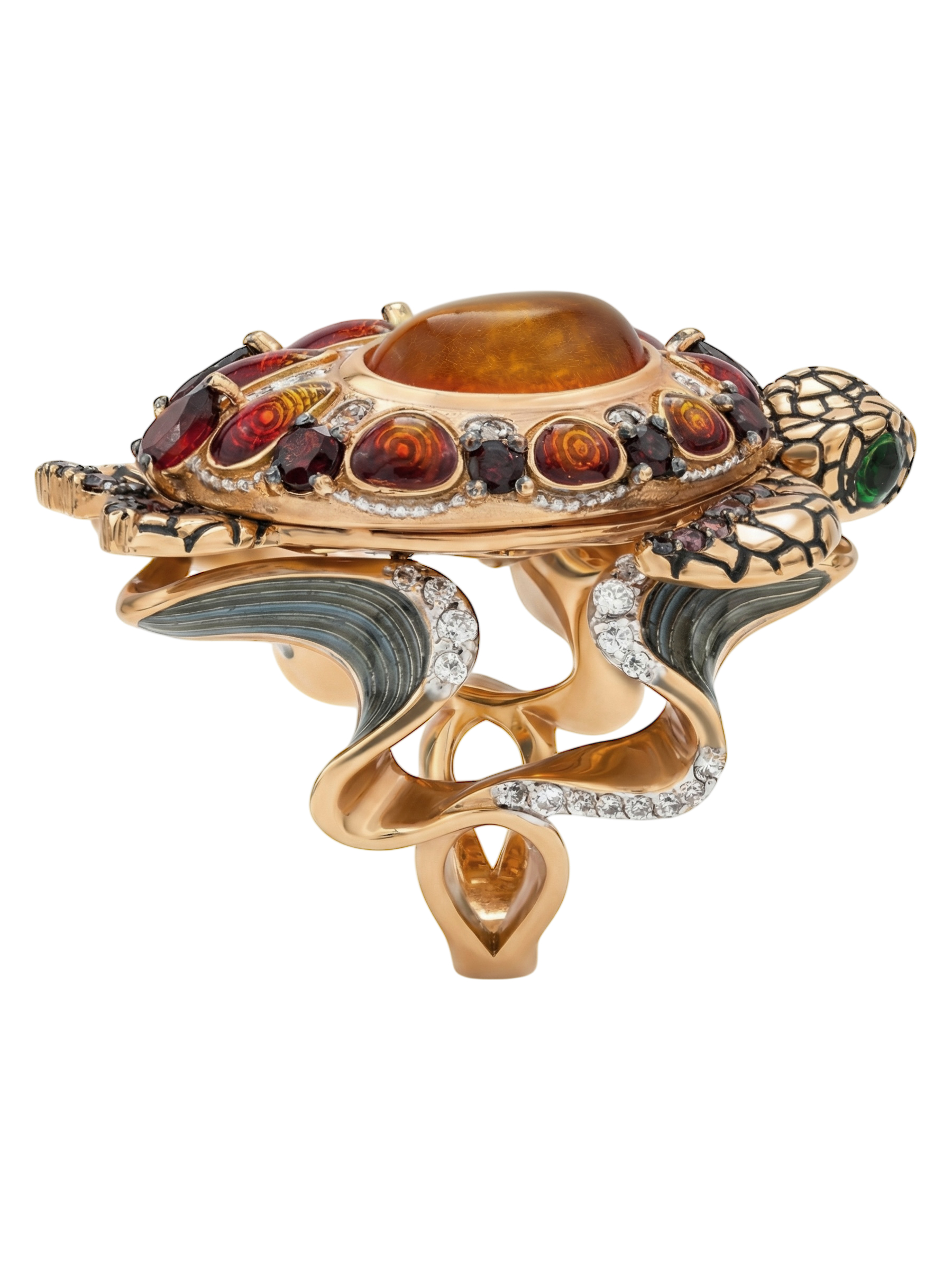 Кольцо из золота c эмалью, фианитом, гранатом и янтарём