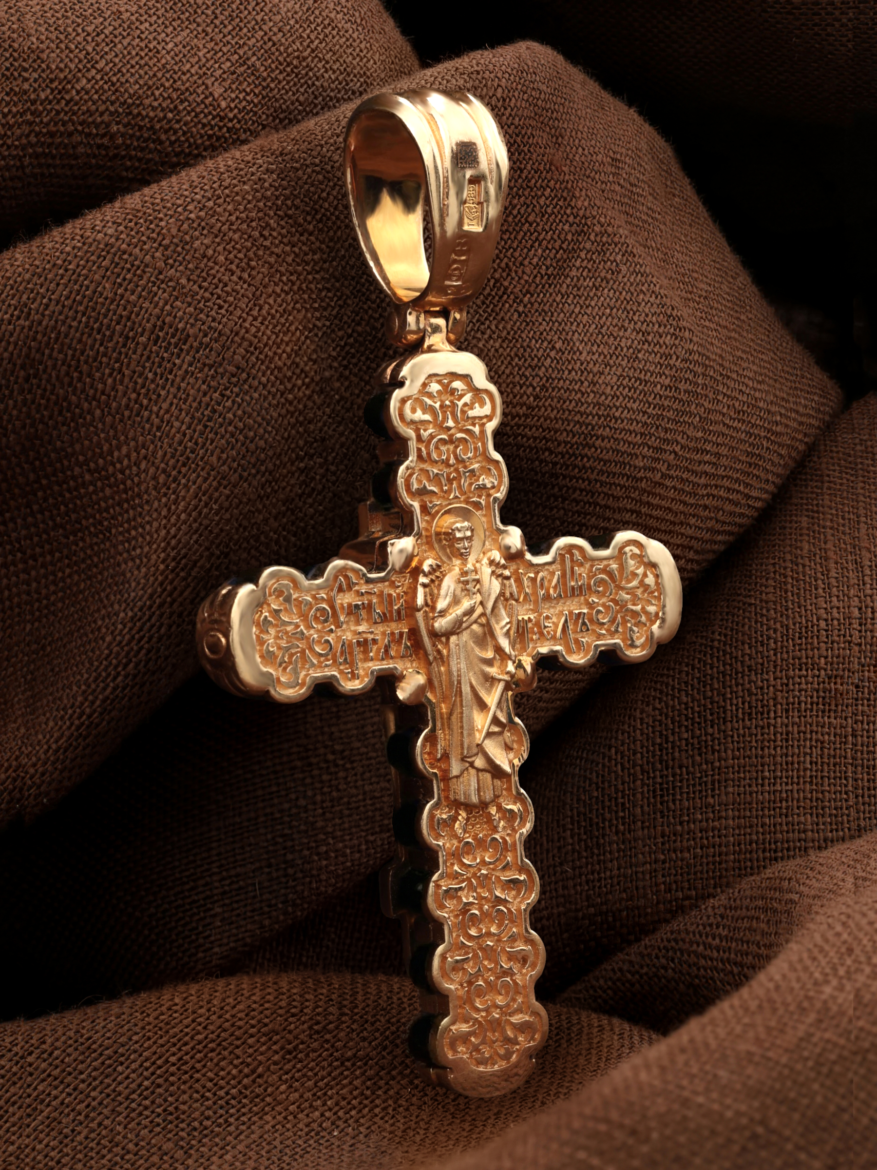 На оборотной стороне креста изображен святой Ангел-Хранитель в виде прекрасного юноши держащего в правой руке крест, а в левой — сферу. Ангел-Хранитель — это Ангел приставляемый Богом к человеку при крещении для охраны и помощи в добрых делах. Невидимо пребывая при нас постоянно, он, руководствуя нас ко спасению, не только по нашему желанию таинственно наставляет нас на все доброе и полезное, не только возносит наши молитвы к Богу, но еще и сам от себя охраняют и защищают нас от врагов видимых и невидимых, ходатайствует за нас пред Богом.
