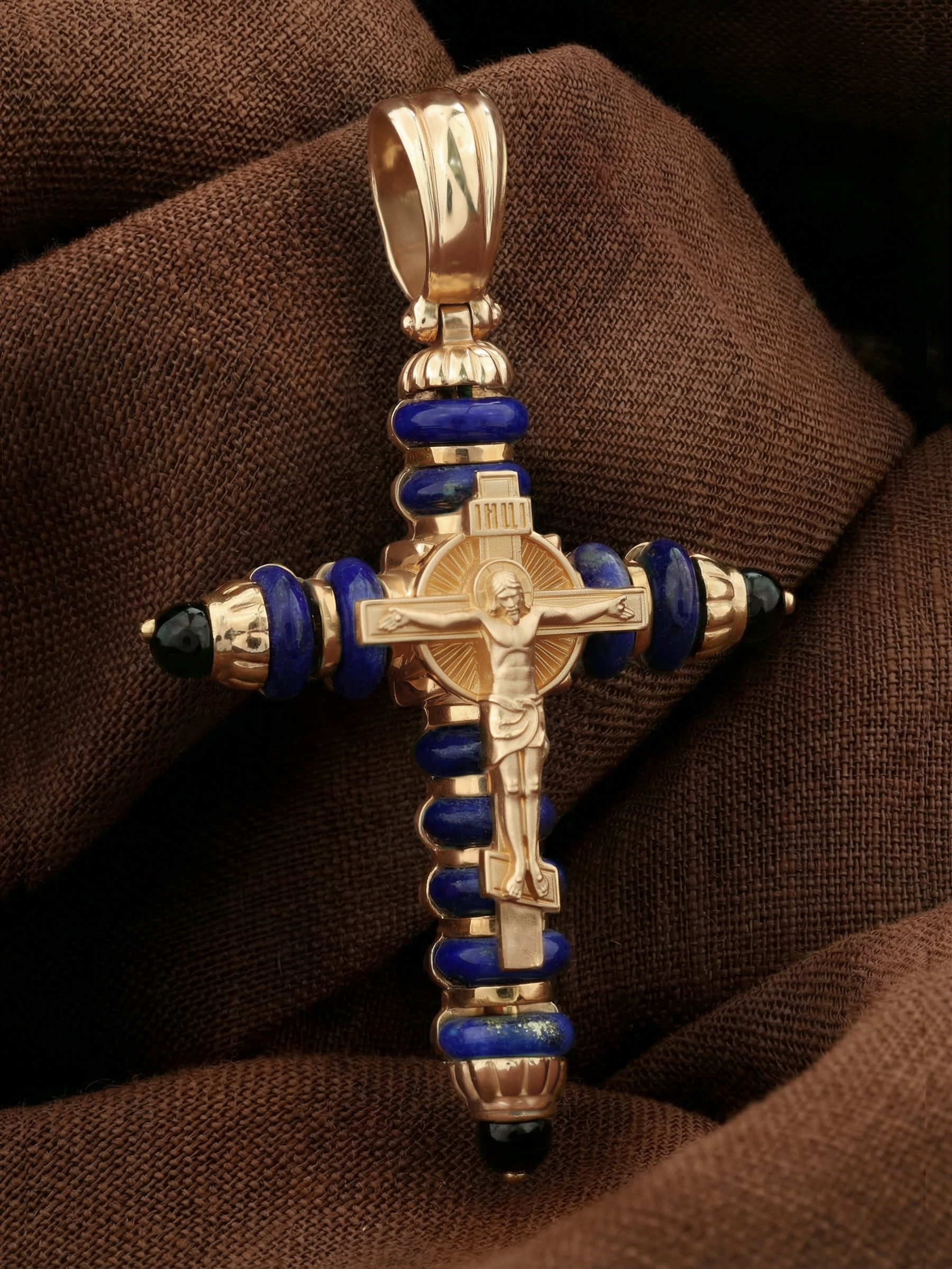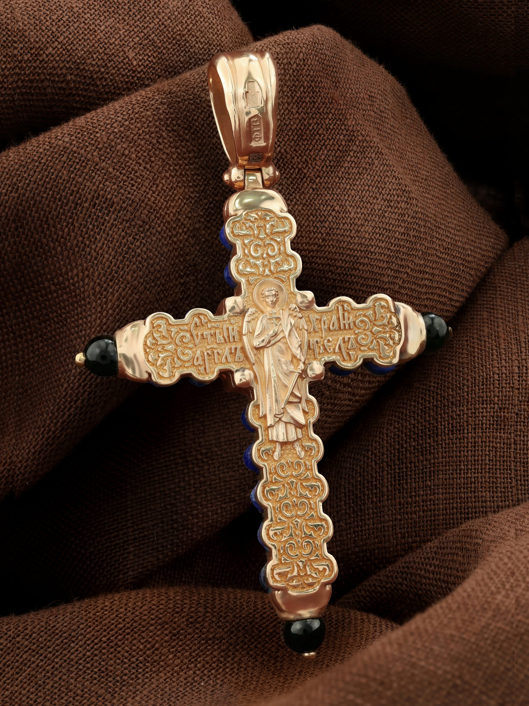 На лицевой стороне креста изображено Распятие Господа и Спасителя нашего Иисуса Христа, отдавшего Себя на смерть для искупления грехов мира. Крест является символом жертвенной любви Всеблагого Бога к падшим людям, всепобеждающим духовным оружием христиан, основанием и средоточием церковной жизни. Над вершиной Распятия помещена надпись «Царь Славы». На верхней перекладине расположена надпись «IНЦI». Она символизирует титло — табличку, на которой, согласно Евангелию, было начертано: Иисус Назорей, Царь Иудейский. Надпись «IC» «ХC»», означает Иисус Христос, помещаются на разных сторонах поперечной перекладины креста. Ниже помещена надпись «НИКА», что означает «победитель».