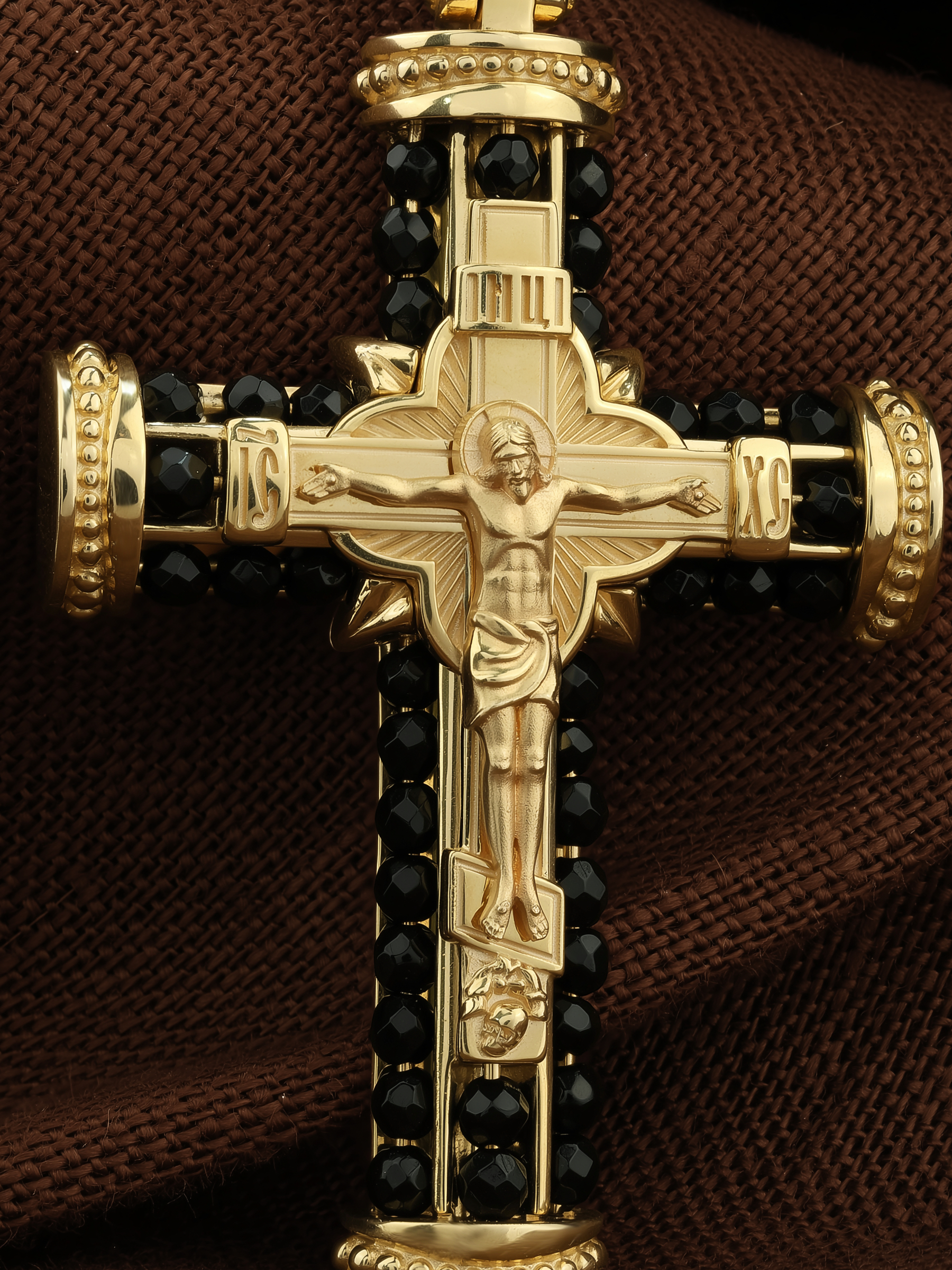 На лицевой стороне креста изображено Распятие Господа и Спасителя нашего Иисуса Христа. Своими крестными страданиями Господь смыл наши грехи, покрыл наш долг перед Богом или, на языке Писания, нас «искупил». В Голгофе сокрыта непостижимая тайна бесконечной правды и любви Бога. Крест стал символом победы добра над злом, жизни над смертью, напоминанием бесконечной Божьей любви, предметом радости. Воплотившийся Сын Божий Своею кровью освятил крест и сделал его проводником Своей благодати, источником освящения верующих. На верхней табличке, выше головы Иисуса, расположена надпись, составленная Понтием Пилатом — «IНЦI». Она означает «Иисус Назорей, Царь Иудейский». Надпись «IC» «ХC», означает Иисус Христос, помещаются на разных сторонах поперечной перекладины креста. Христос в Своей Божественной любви, над которой смерть не властна и которая, страдая, и не страдает в обычном смысле, простирает к людям со Креста Свои объятия, в которые призывается и привлекается весь мир. Поэтому Тело Его не висит, а торжественно покоится на Кресте.