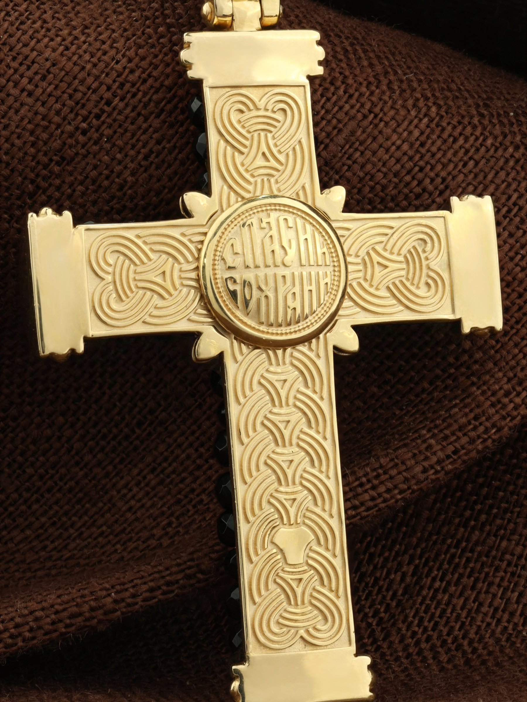 В центрально части оборотной стороны креста написана молитва: «Спаси и сохрани».