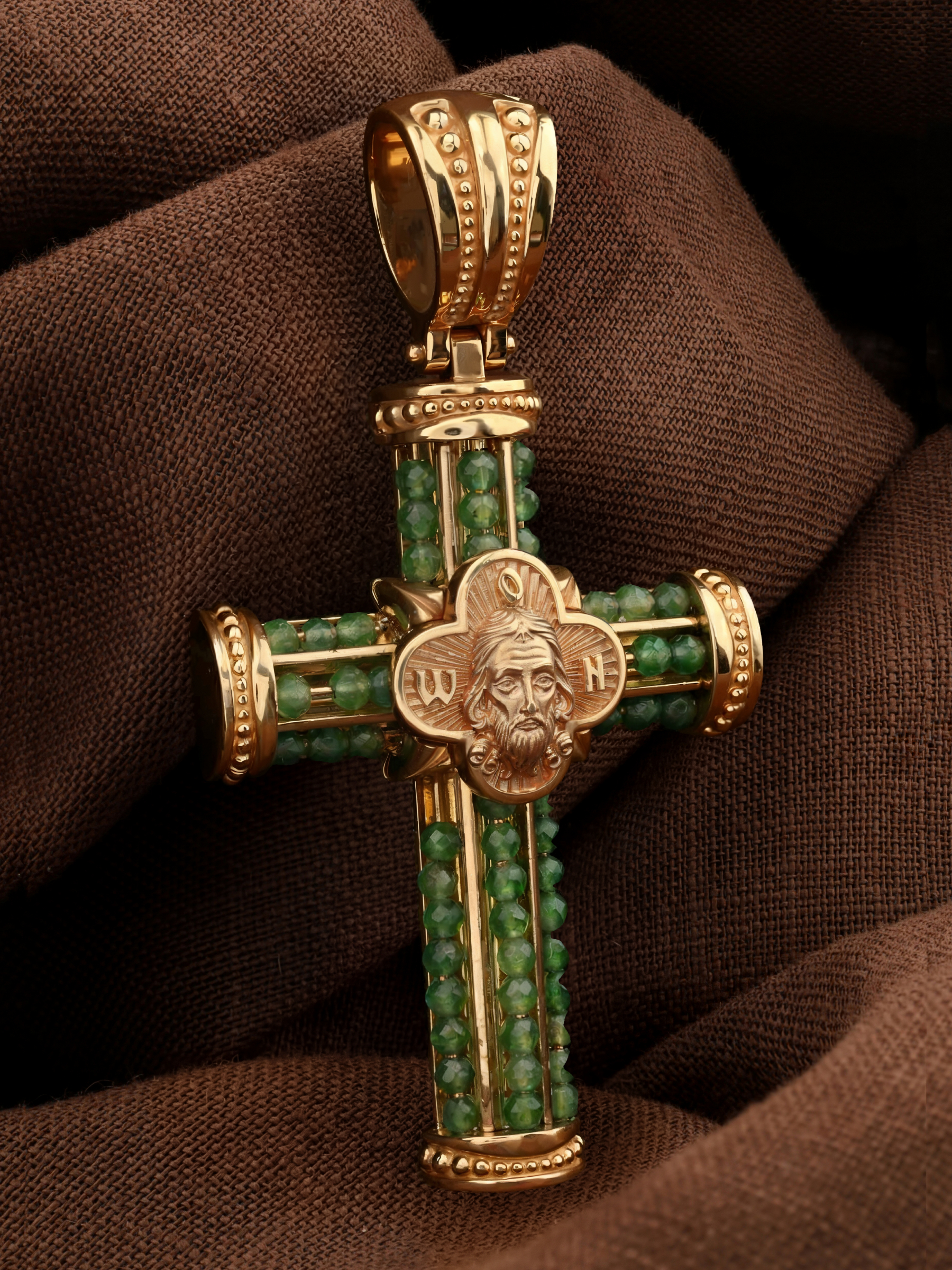 В центральной части лицевой стороны креста изображен Спас Нерукотворный — образ Господа и Спасителя нашего Иисуса Христа, чудесно отпечатавшийся на плате, котором Христос вытер свой лик. Согласно Преданию, изложенному в Четьи Минее, Авгарь V Ухама, больной проказой, послал ко Христу своего архивария Ханнана (Ананию) с письмо, в котором просил Христа прийти в Едессу и исцелить его. Ханнан же был художником, и Авгарь поручил ему, если Спаситель не сможет прийти, то написать хотя бы Его образ и принести ему. Видя, что Ханнан хочет сделать Его портрет, Христос потребовал воды, умылся, вытер Свой лик платом, и на этом плате отпечатался Его образ. Спаситель передал этот плат Ханнану с повелением отнести с ответным письмом пославшему его. Получив портрет, Авгарь исцелился от главного своего недуга, но лицо его оставалось еще поврежденным. После Пятидесятницы в Едессу пошёл святой апостол Фаддей, один из 70-ти, закончил исцеление Авгаря и обратил его в христианство. Авгарь прикрепил образ к доске и поместил в нише над городскими воротами, убрав оттуда находившегося там идола.