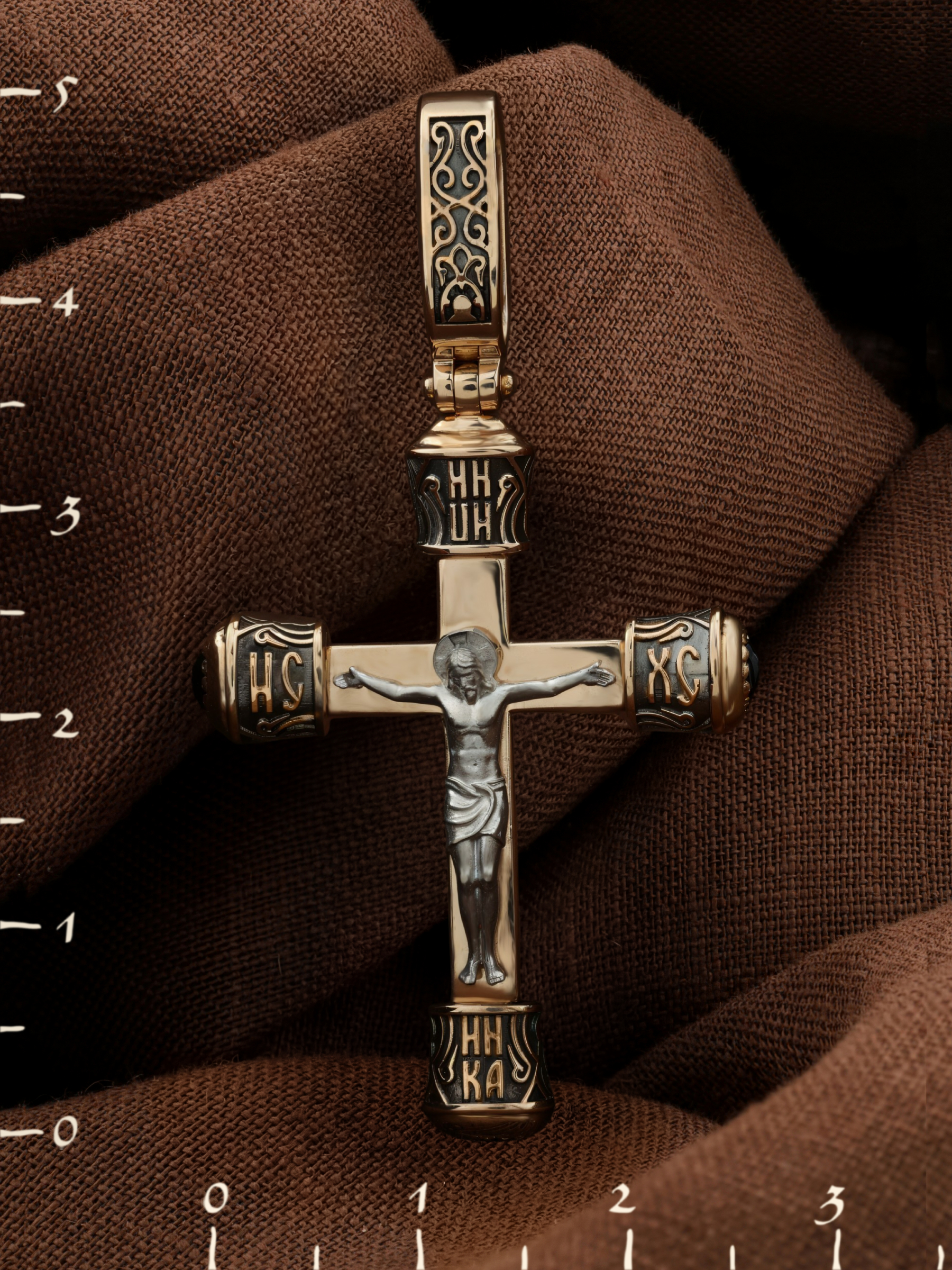 На лицевой стороне креста изображено Распятие Господа и Спасителя нашего Иисуса Христа. В Голгофе сокрыта непостижимая тайна бесконечной правды и любви Бога. Крест стал символом победы добра над злом, жизни над смертью, напоминанием бесконечной Божьей любви, предметом радости. Воплотившийся Сын Божий Своею кровью освятил крест и сделал его проводником Своей благодати, источником освящения верующих. Над распятием расположена надпись, составленная Понтием Пилатом — «ИНЦИ». Она означает «Иисус Назорей, Царь Иудейский». Надпись «ИС» «ХС» означает Иисус Христос и помещается на разных сторонах поперечной перекладины креста. В нижней части креста расположена «НИКА», что означает «победитель». На православном кресте Христос не умирает, а свободно простирает руки, ладони Иисуса открыты, будто он хочет обнять все человечество, даря им свою любовь и открывая путь к вечной жизни.