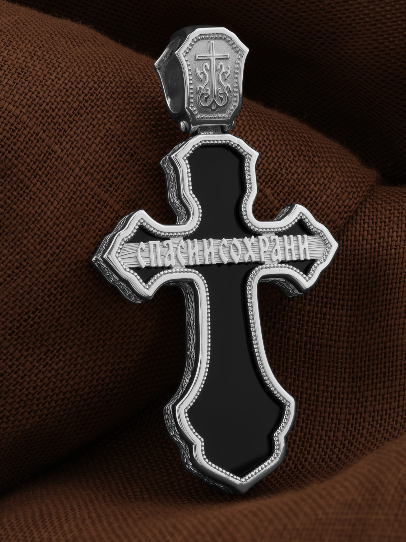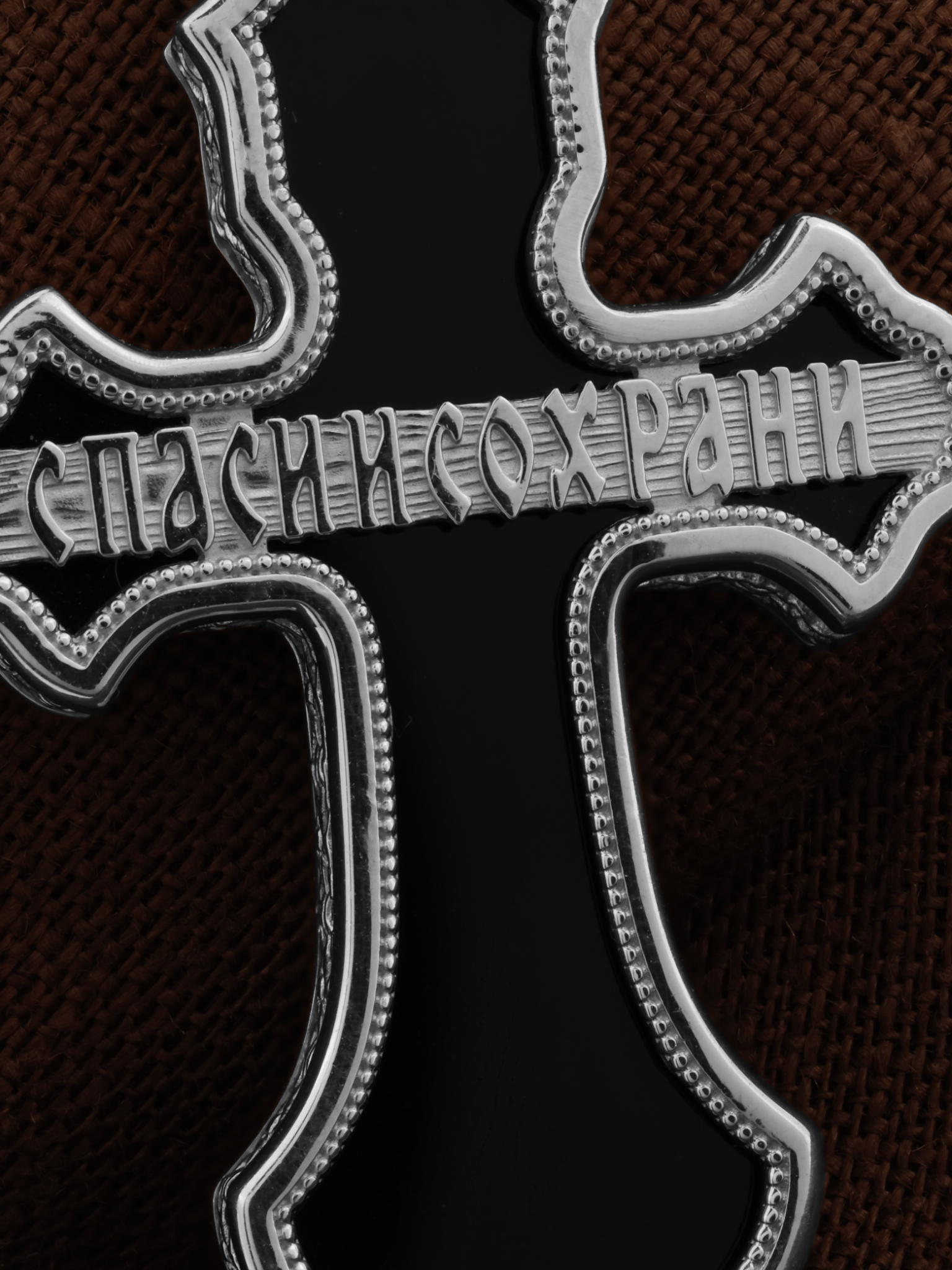 На оборотной стороне креста отображена молитва: «Спаси и сохрани».