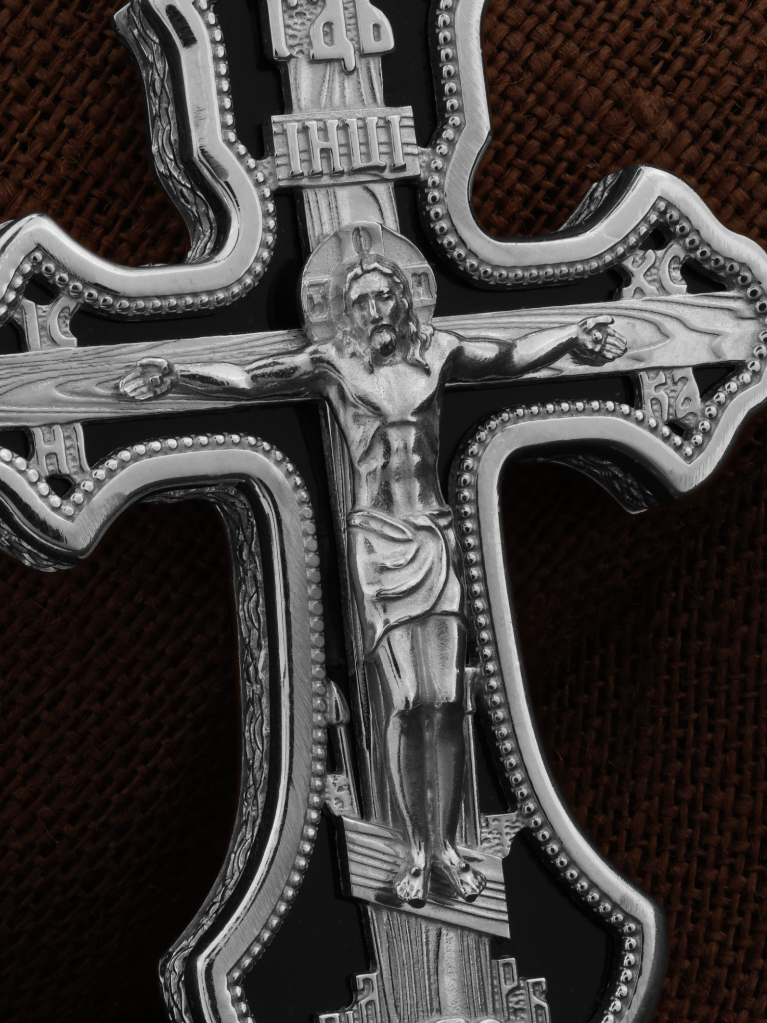 На лицевой стороне креста изображено Распятие Господа и Спасителя нашего Иисуса Христа. Христос, подвергнутый на кресте мучительной казни, своими страданиями искупил нас от древнего греха и даровал нам жизнь вечную. Без Распятия не было бы Воскресения Христова, и поэтому Крест из орудия казни обратился в святыню, в которой действует Благодать Божия. Распятие сопровождается каноническими надписями. Над Распятием размещена надпись «ГДЬ», что означает Господь. Верхняя перекладина символизирует титло — табличку, на которой, согласно Евангелию, расположена надпись, составленная Понтием Пилатом на трех языках — «IНЦI». Она означает «Иисус Назорей, Царь Иудейский». Надписи «IC» «ХC», что означает Иисус Христос, и «НИКА», что означает «победитель», помещаются на разных сторонах поперечной перекладины креста. Вдоль креста изображены копие сотника Лонгина и трость с губкой и буквы «К» и «Т». Надпись «МЛРБ» — «место лобное рай бысть», что означает место лобное стало раем, размещены в нижней части креста. Крест стоит на горе камней, символизирующих Голгофу. В ее основании различается череп — это голова Адама. На кулонном кольце изображен Нерукотворный образ Господа и Спасителя нашего Иисуса Христа, чудесно отпечатавшийся на плате, которым Христос вытер свой лик.