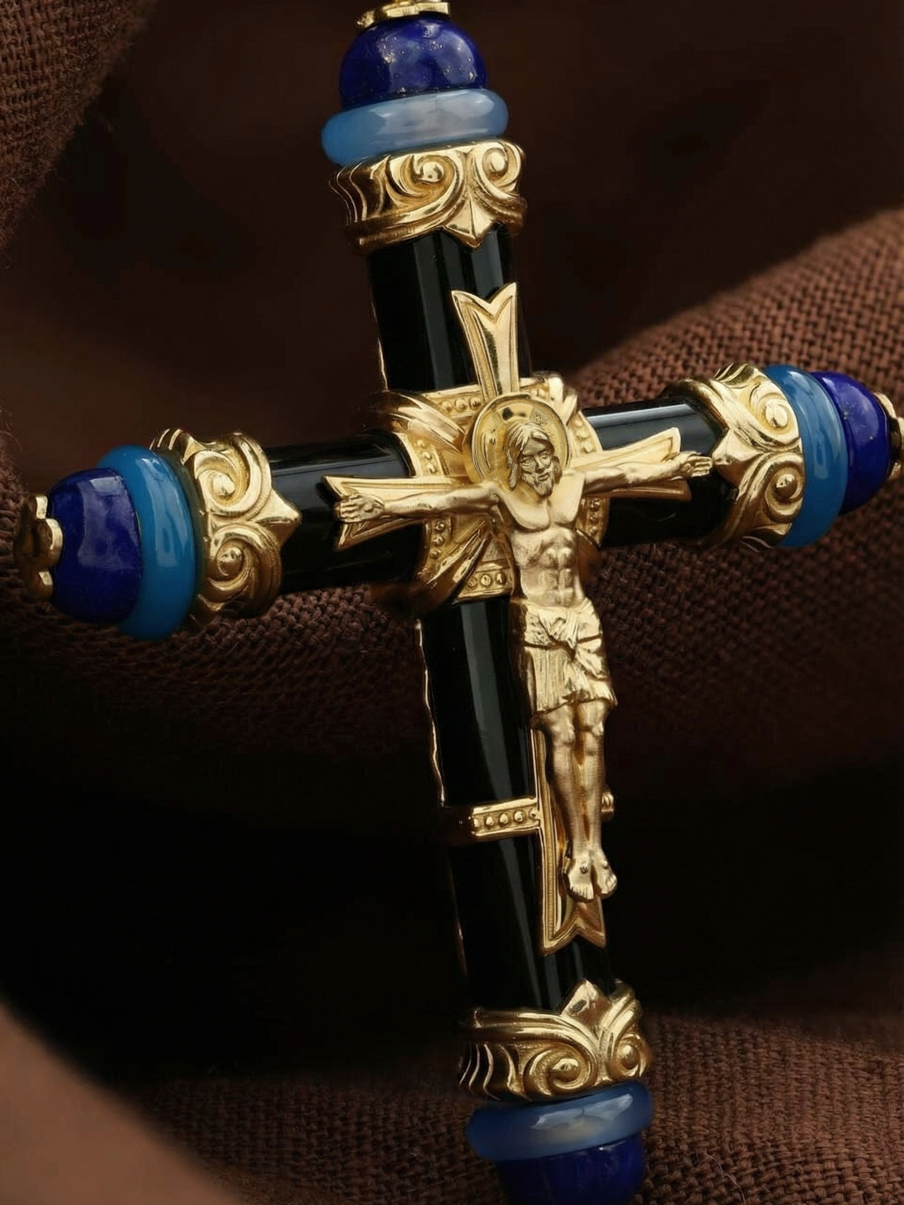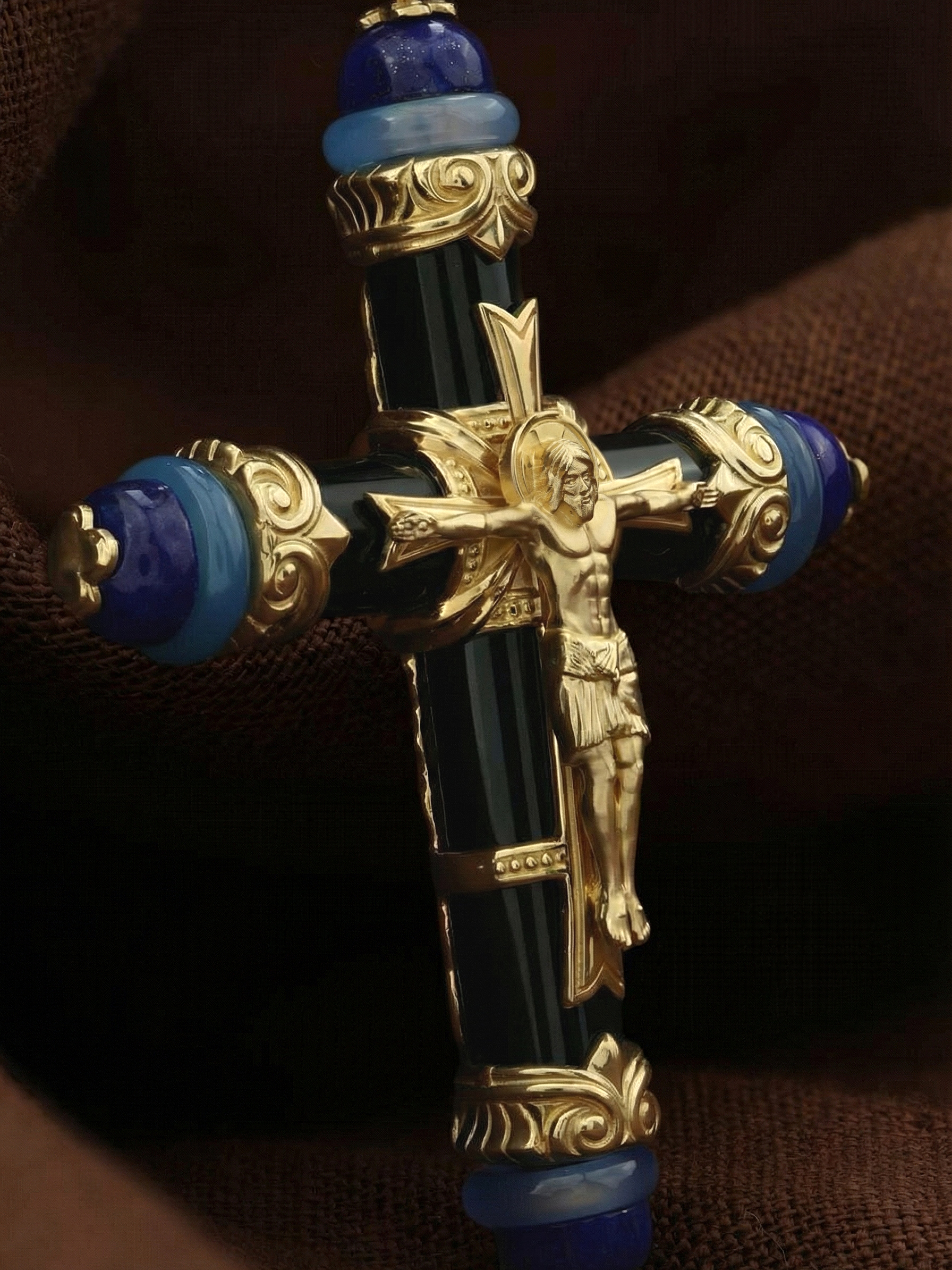 Крест из лимонного золота c ониксом, агатом и лазуритом