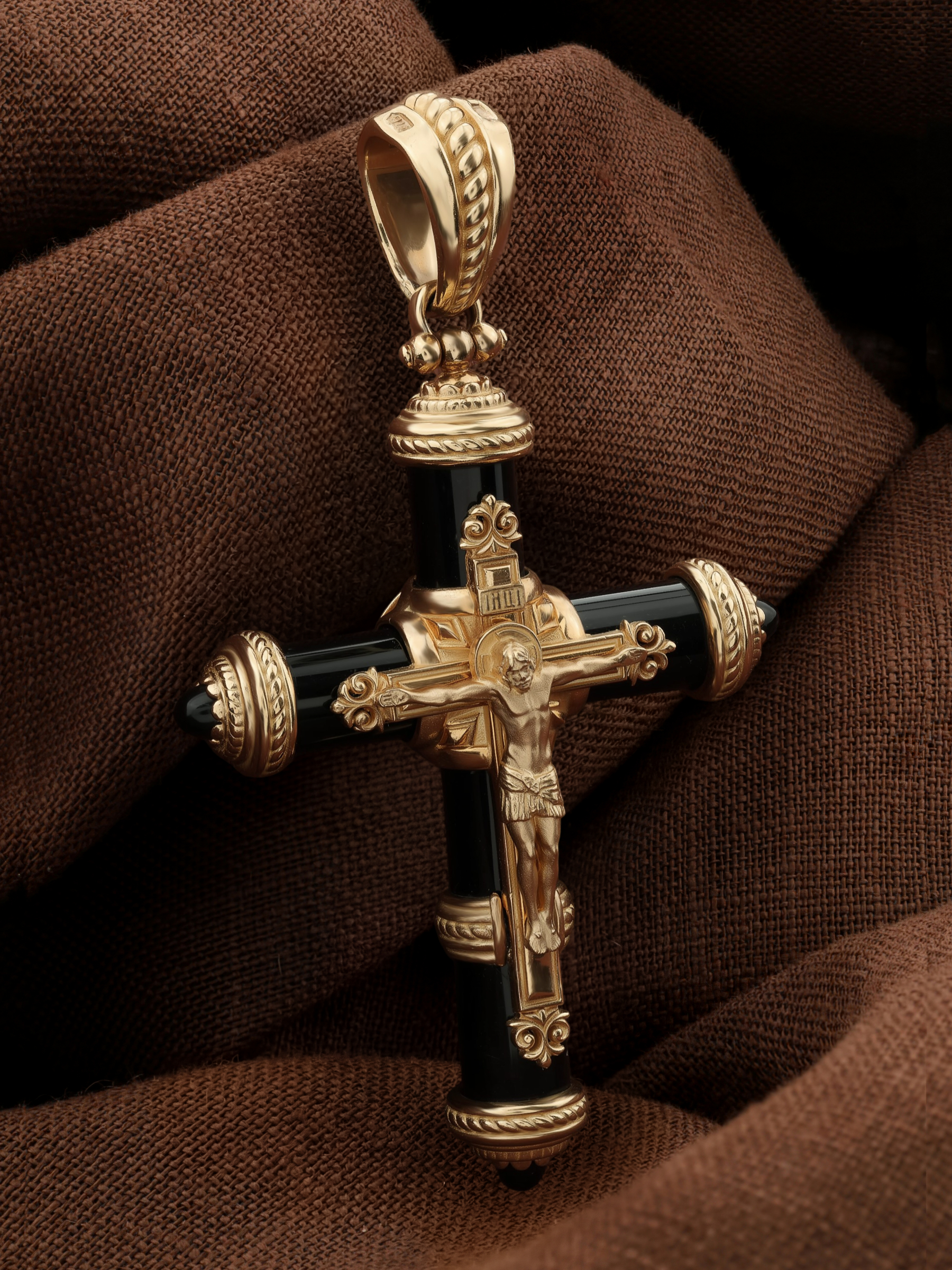 На лицевой стороне креста изображено Распятие Господа и Спасителя нашего Иисуса Христа. Своими крестными страданиями Господь смыл наши грехи, покрыл наш долг перед Богом или, на языке Писания, нас «искупил». В Голгофе сокрыта непостижимая тайна бесконечной правды и любви Бога. Крест стал символом победы добра над злом, жизни над смертью, напоминанием бесконечной Божьей любви, предметом радости. Воплотившийся Сын Божий Своею кровью освятил крест и сделал его проводником Своей благодати, источником освящения верующих. На верхней табличке, выше головы Иисуса, расположена надпись, составленная Понтием Пилатом — «IНЦI». Она означает «Иисус Назорей, Царь Иудейский». Надпись «IC» «ХC», означает Иисус Христос, помещаются на разных сторонах поперечной перекладины креста. Христос в Своей Божественной любви, над которой смерть не властна и которая, страдая, и не страдает в обычном смысле, простирает к людям со Креста Свои объятия, в которые призывается и привлекается весь мир. Поэтому Тело Его не висит, а торжественно покоится на Кресте.