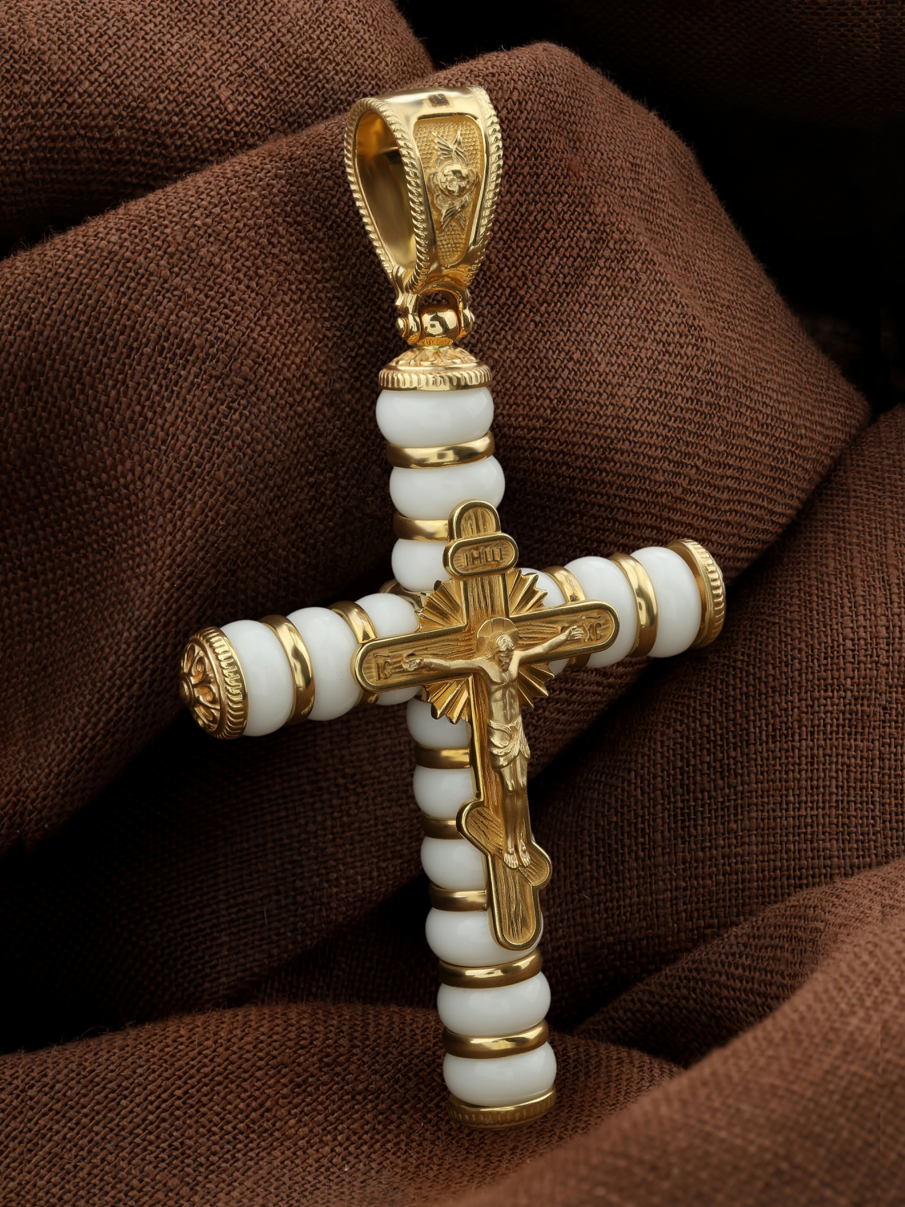 На лицевой стороне креста изображено Распятие Господа и Спасителя нашего Иисуса Христа. Своими крестными страданиями Господь смыл наши грехи, покрыл наш долг перед Богом или, на языке Писания, нас «искупил». В Голгофе сокрыта непостижимая тайна бесконечной правды и любви Бога. Крест стал символом победы добра над злом, жизни над смертью, напоминанием бесконечной Божьей любви, предметом радости. Воплотившийся Сын Божий Своею кровью освятил крест и сделал его проводником Своей благодати, источником освящения верующих. Господь сказал: кто хочет идти за Мною, отвергнись себя, и возьми крест свой, и следуй за Мною. (Мк. 8: 34). На верхней табличке, выше головы Иисуса, расположена надпись, составленная Понтием Пилатом — «IНЦI». Она означает «Иисус Назорей, Царь Иудейский». Надпись «IC» «ХC», означает Иисус Христос, помещается на разных сторонах поперечной перекладины креста. На православном кресте Христос не умирает, а свободно простирает руки, ладони Иисуса открыты, будто он хочет обнять все человечество, даря им свою любовь и открывая путь к вечной жизни. На кулонном кольце изображен шестикрылый Ангел Серафим.