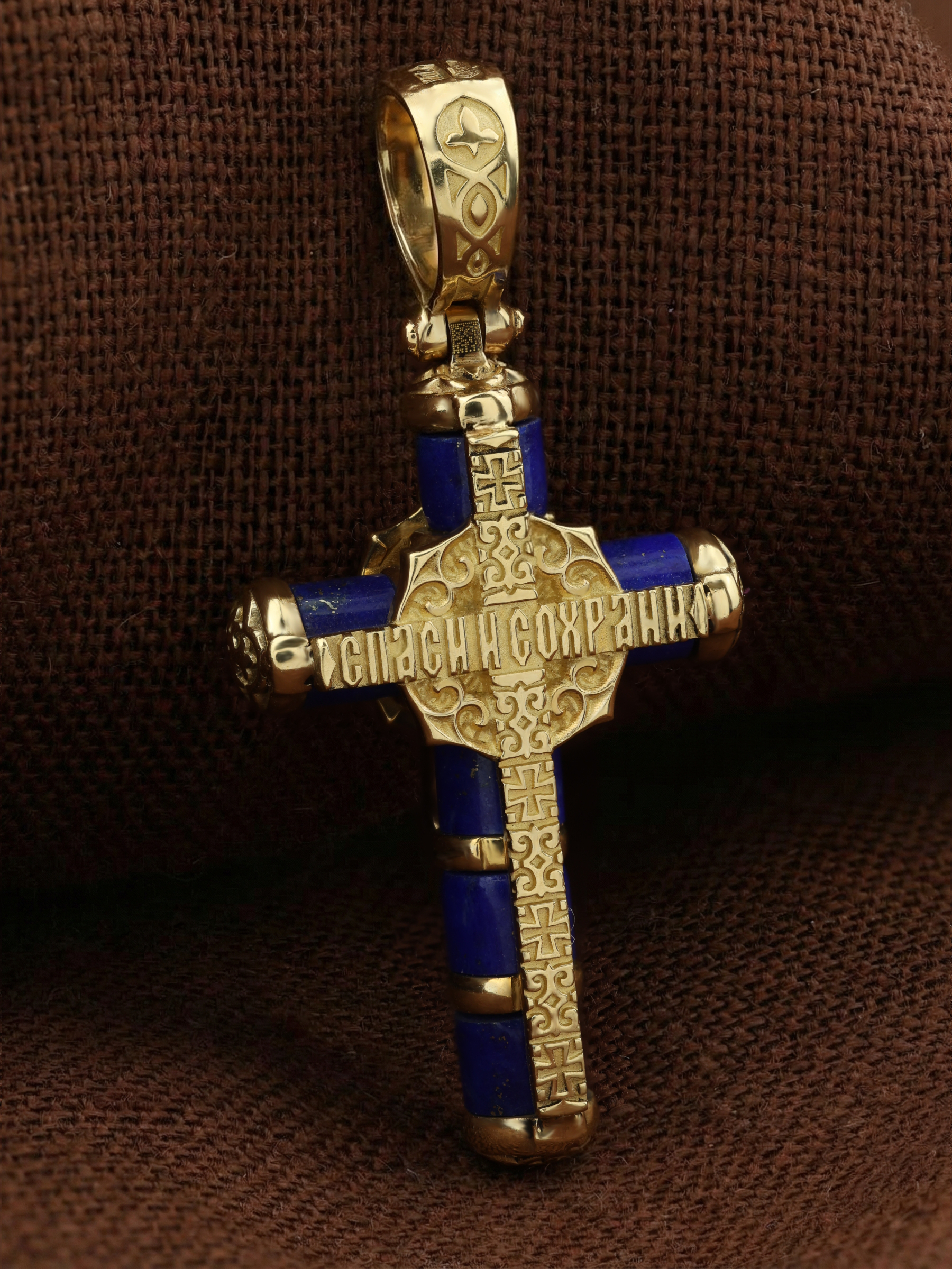 На оборотной стороне креста помещена молитва: «Спаси и сохрани». Крест украшен орнаментом.