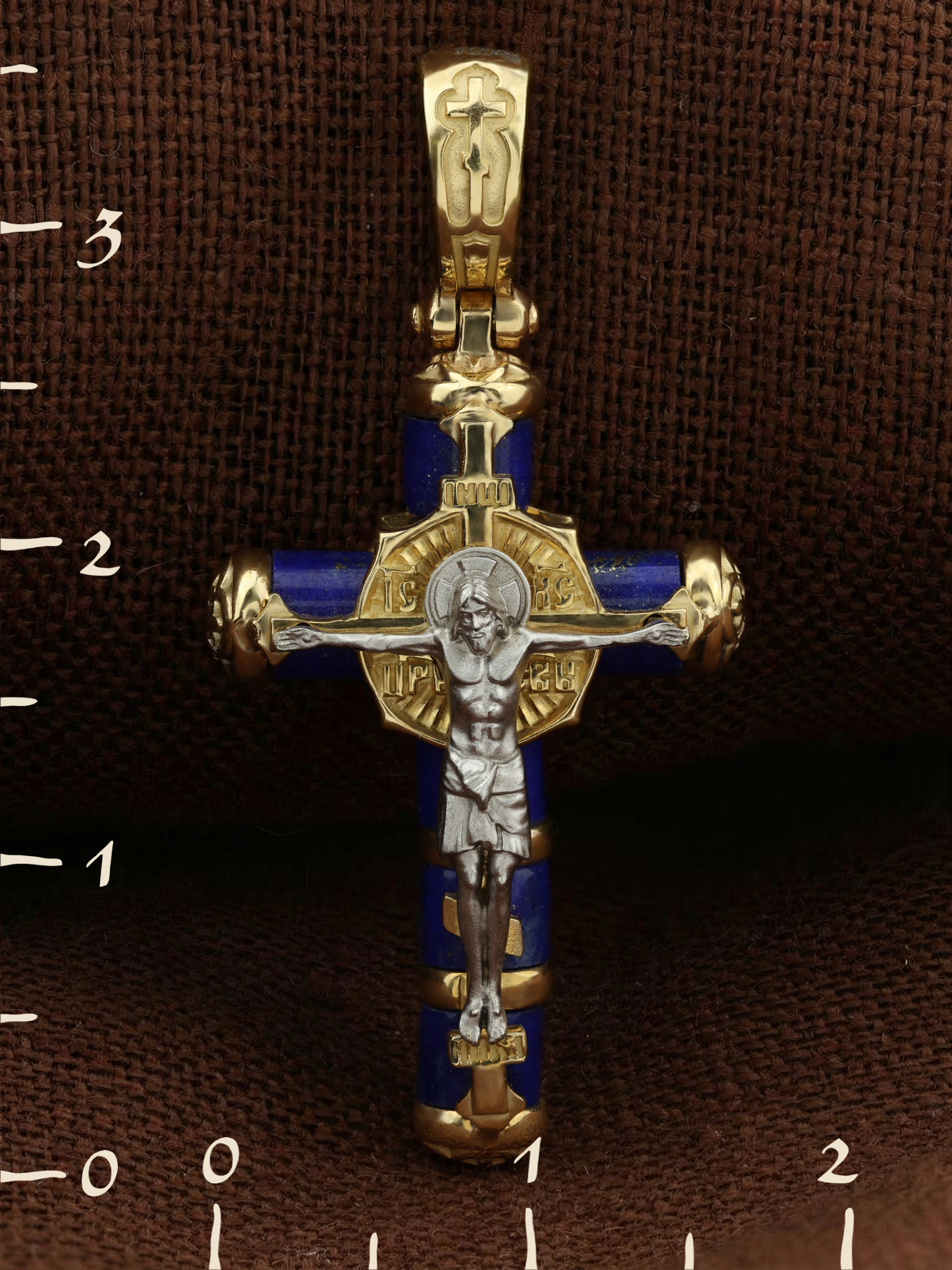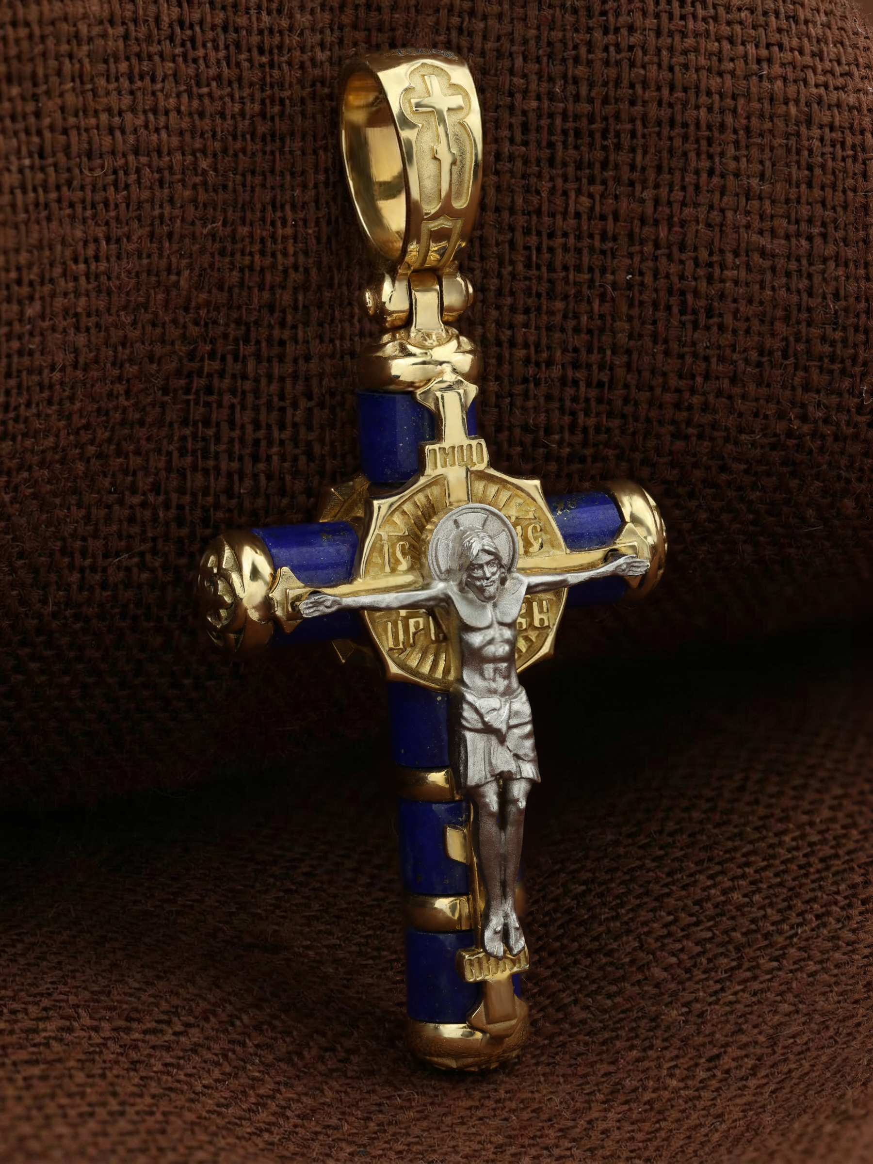 На лицевой стороне креста изображено Распятие Господа и Спасителя нашего Иисуса Христа, отдавшего Себя на смерть, для искупления грехов мира. Крест является символом жертвенной любви всеблагого Бога к падшим людям, всепобеждающим духовным оружием христиан, основанием и средоточием церковной жизни. Верхняя перекладина символизирует титло — табличку, на которой, согласно Евангелию, было начертано: Иисус Назорей Царь Иудейский (IНЦI). Надпись «IС» « ХС» означает Иисус Христос и размещена над поперечной перекладиной. Слева от Распятия изображена Пресвятая Богородица, справа — апостол и евангелист Иоанн Богослов, один из ближайших учеников Иисуса Христа. Возвышение, на котором стоит Крест, символизирует гору Голгофу, на которой произошло Распятие. Под подножием Креста изображена покоящаяся голова (череп) Адама. Под Распятием помещено изображение Духа Святого в виде голубя.