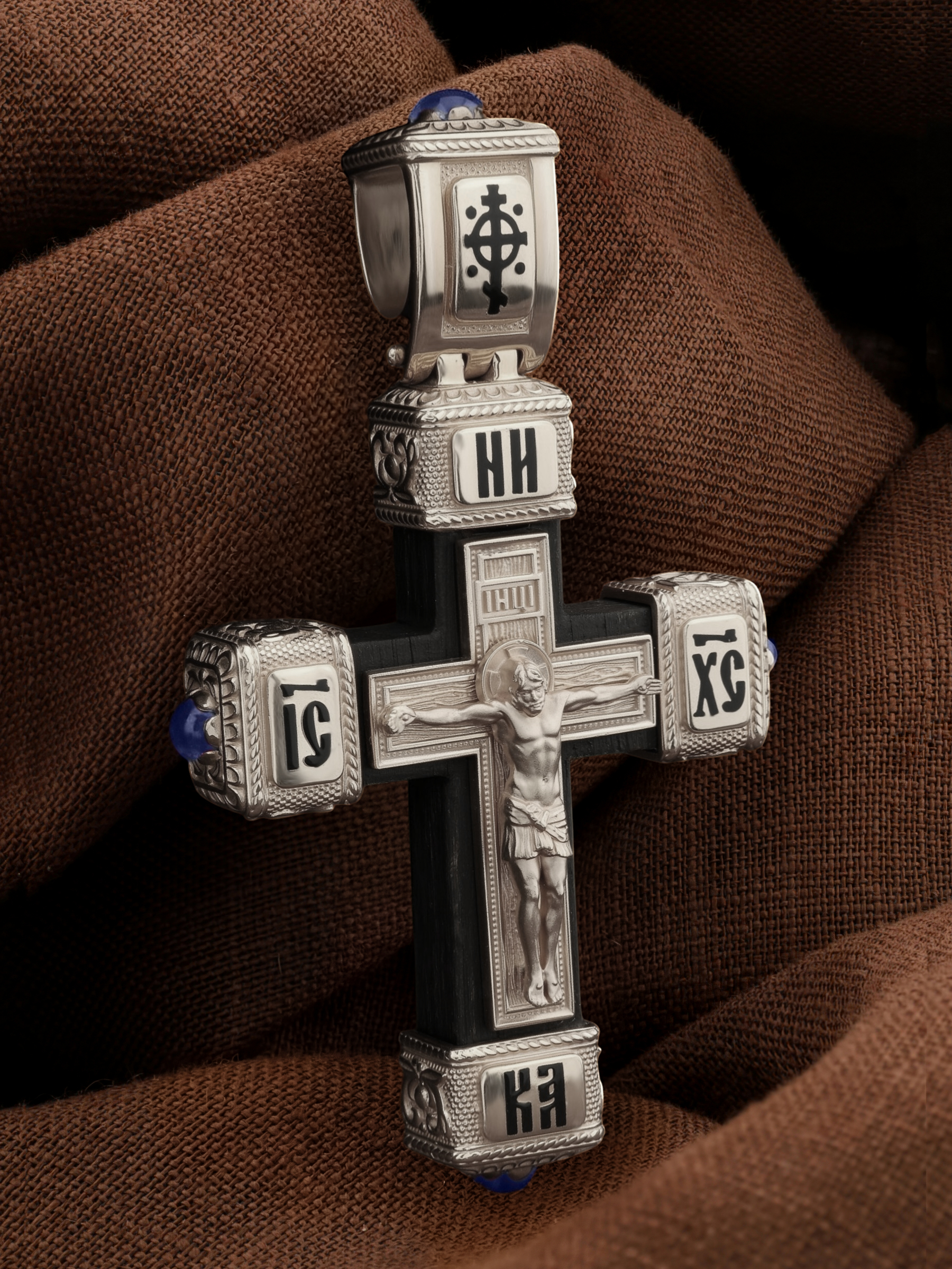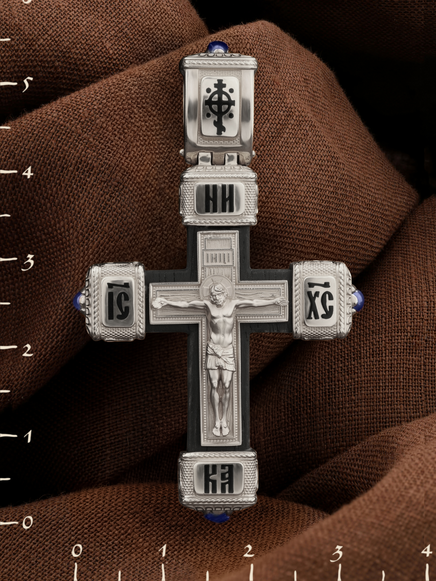 Крест из белого золота c эмаль, сапфиром и эбеновым деревом