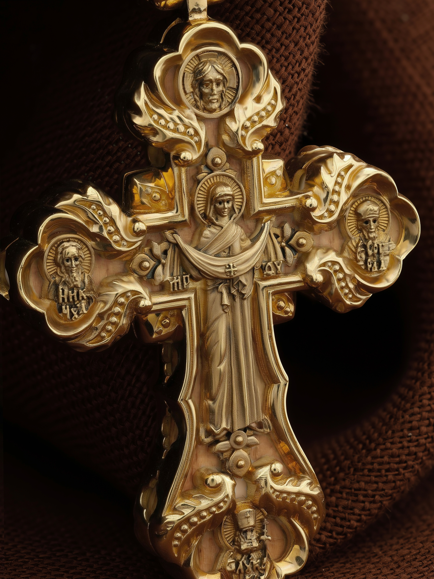 Центральную часть оборотной стороны креста украшает икона «Покров Пресвятой Богородицы». В руках Божьей Матери находится омофор, который она распростерла над людьми, покрывая их от всякого зла. Выше образа изображен Спас Нерукотворный, ниже — Святитель Лука (Войно-Ясенецкий). Слева от Распятия изображен Святитель Николай Чудотворец, архиепископ Мир Ликийских, справа — Преподобный Сергий, игумен Радонежский, Чудотворец. На кулонном кольце помещено изображение шестикрылого Серафима.