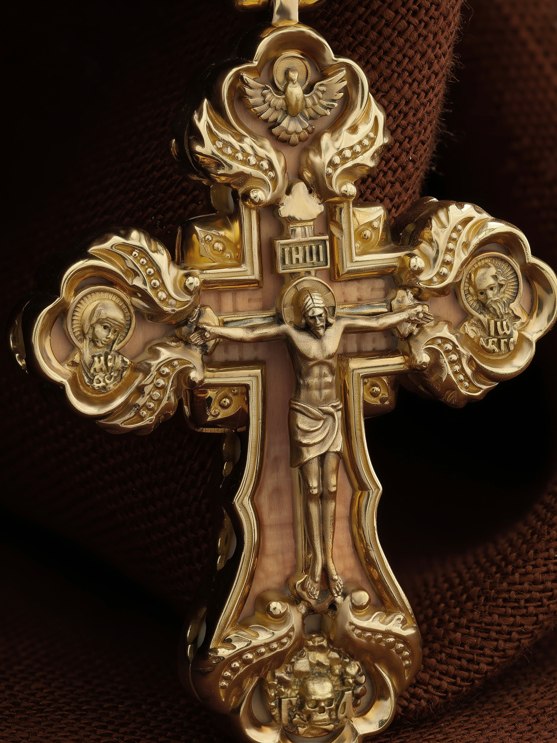 На лицевой стороне креста изображено Распятие Господа и Спасителя нашего Иисуса Христа. Крест- символ спасения и искупления рода человеческого, знамение победы над смертью и адом. Иисус Христос, как искупительная жертва освобождения человечества от власти греха, умер крестной смертью и в третий день воскрес. На верхней табличке, выше головы Иисуса, расположена надпись, составленная Понтием Пилатом — «ИНЦИ». Она означает «Иисус Назорей, Царь Иудейский». Над перекладиной написано сокращенно имя Спасителя «IC» «XC» — Иисус Христос. Ниже перекладины написано слово «НИКА» (греч. — Победитель). Крест стоит на горе камней, символизирующих Голгофу. В ее основании различается череп и надписи «Г.А.» — это голова Адама. Слева от Распятия помещен лик Пречистой Богородицы, скорой помощницы и заступницы рода Христианского. Слева изображен апостол и евангелист Иоанн Богослов, один из ближайших учеников Иисуса Христа. Над Распятием — изображение Духа Святого в виде голубя, сходящего с Небес. На кулонном кольце помещен крест.