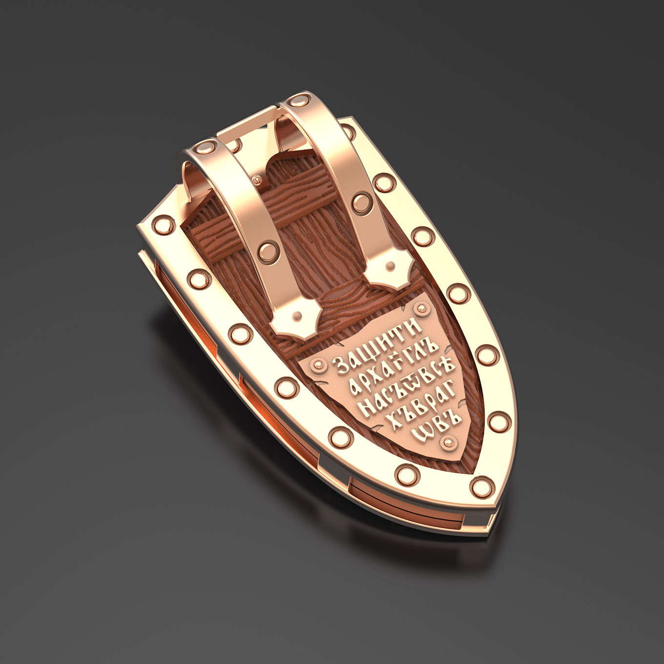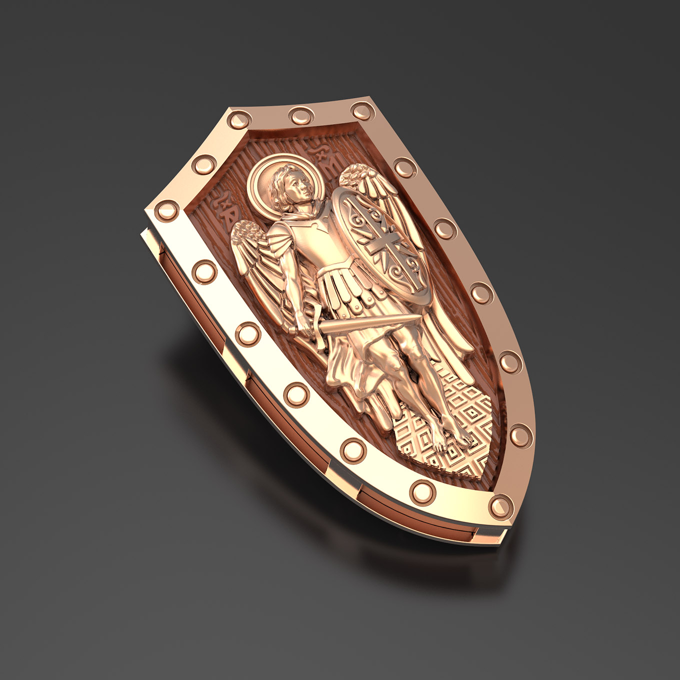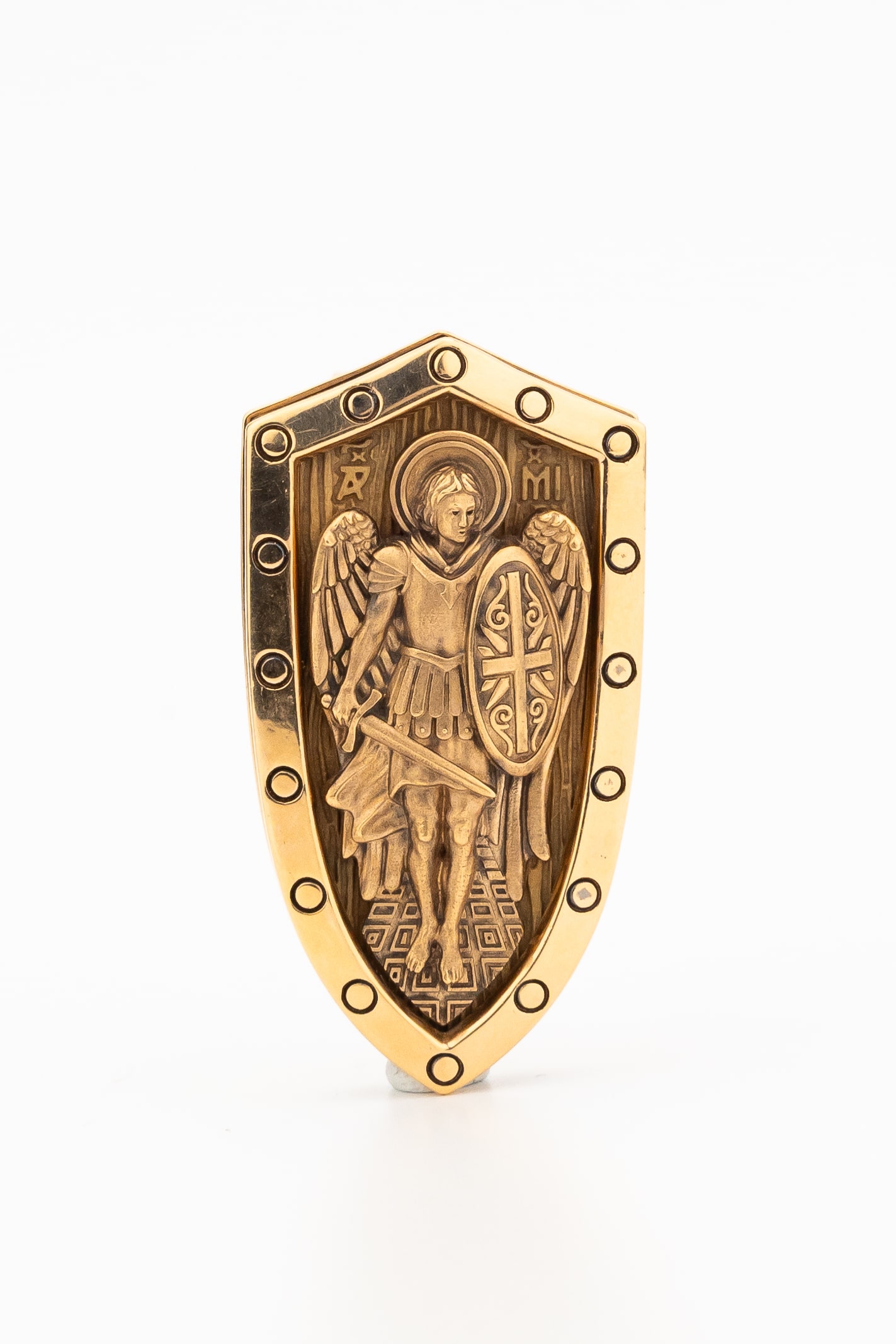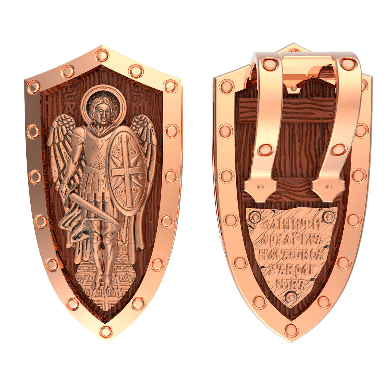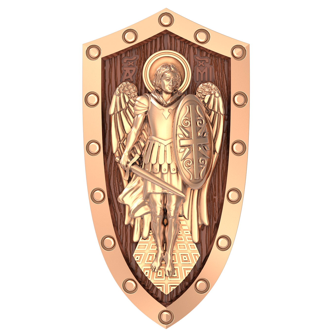 На лицевой стороне образка изображение Архангела Михаила — верного служителя Божия, который низринул с Неба возгордившегося денницу с другими павшими духами. В Православии его называют Архистратигом, что означает глава святого воинства Ангелов и Архангелов. Образок сделан в виде воинского щита. Архангел Михаил изображен в воинственном виде с огненным мечом в правой руке и щитом в левой. Архангел почитается как покровитель воинов и всех верных Богу и ведущих борьбу против сил зла, борец против ересей, а также защитник душ умерших, страж райских врат. С древних времен прославлен своими чудесами Архангел Михаил на Руси. Примеров явления и помощи Архистратига Михаила в русской истории бессчетно. Архангел Михаил не перестает ратоборствовать за славу Творца и Господа всяческих, за дело спасения рода человеческого, за церковь и чад ее. И, согласно, Откровению Иоанна Богослова во время последней битвы небесных и дьявольских сил Михаил и его ангелы опять низвергнут Люцифера вместе с его войском: «Михаил и Ангелы его воевали против дракона, и дракон и ангелы его воевали [против них], но не устояли, и не нашлось уже для них места на небе. И низвержен был великий дракон, древний змий, называемый диаволом и сатаною, обольщающий всю вселенную, низвержен на землю, и ангелы его низвержены с ним» (Откр.12:7−9).