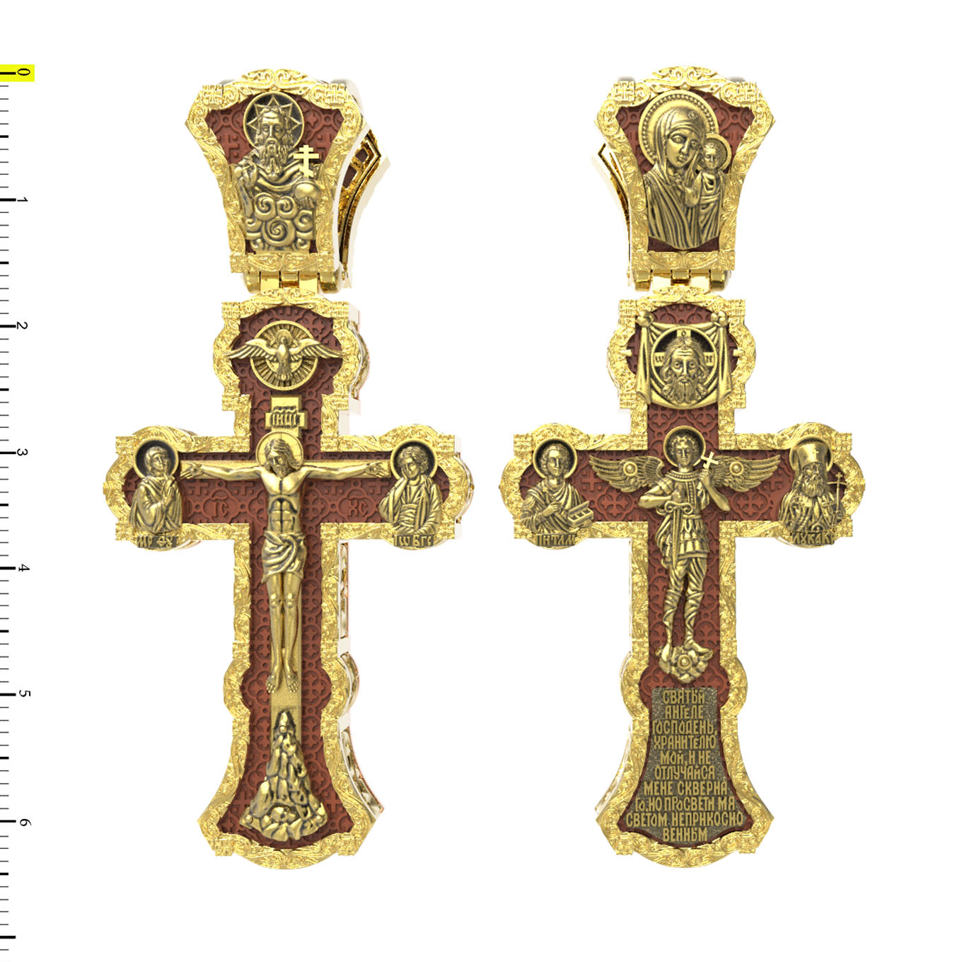 На центральной части оборотной стороны креста изображен Святой Ангел-Хранитель в виде прекрасного юноши держащего в правой руке крест, а в левой — мечь. Ангел-Хранитель — это Ангел приставляемый Богом к человеку при крещении для охраны и помощи в добрых делах. Невидимо пребывая при нас постоянно, он, руководствуя нас ко спасению, не только по нашему желанию таинственно наставляет нас на все доброе и полезное, не только возносит наши молитвы к Богу, но еще и сам от себя охраняют и защищают нас от врагов видимых и невидимых и ходатайствует за нас пред Богом. Ниже образа написана молитва: «Святый Ангеле Господень, Хранитель мой, не отлучайся мене скверного, но просвети мя светом неприкосновенным.» Выше образа изображен Спас Нерукотворный — образ Господа и Спасителя нашего Иисуса Христа, чудесно отпечатавшийся на плате, котором Христос вытер свой лик. Слева — Свя¬той ве¬ли¬ко¬му¬че¬ник и це¬ли¬тель Пан¬те-ле¬и¬мон. Господь даровал удивительную силу его молитве. Ею он исцелял любые болезни, воскрешал мертвых. Справа — Святитель Лука (Войно-Ясенецкий). На кулонном кольце изображена Казанская икона Божией Матери — одна из самых любимых на Руси.