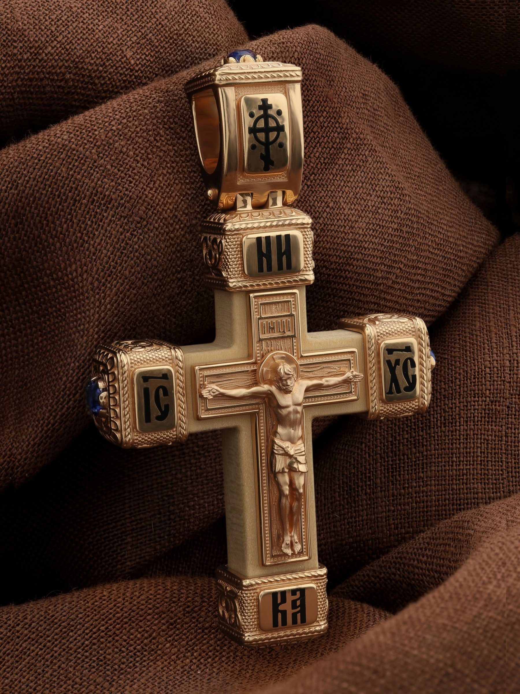 Крест из золота c эмаль, сапфиром и деревом груши