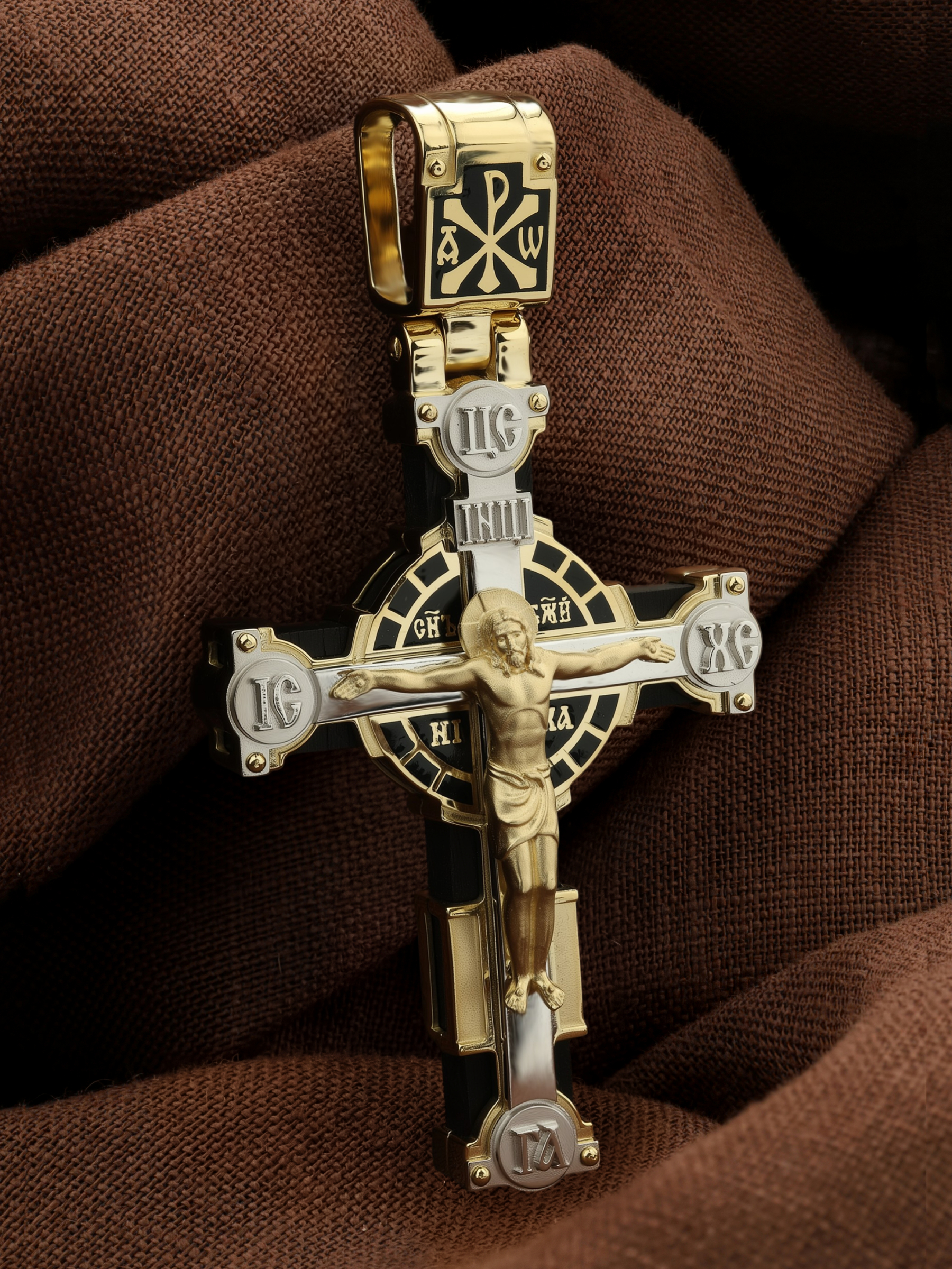 На лицевой стороне креста изображено Распятие Господа и Спасителя нашего Иисуса Христа. Христос, подвергнутый на кресте мучительной казни, своими страданиями искупил нас от древнего греха и даровал нам жизнь вечную. Без Распятия не было бы Воскресения Христова, и поэтому Крест из орудия казни обратился в святыню, в которой действует Благодать Божия. В Голгофе сокрыта непостижимая тайна бесконечной правды и любви Бога. Крест стал символом победы добра над злом, жизни над смертью, напоминанием бесконечной Божьей любви, предметом радости. Воплотившийся Сын Божий Своею кровью освятил крест и сделал его проводником Своей благодати, источником освящения верующих. Через крестную жертву Бог раскрывает нам Свою безмерную любовь и призывает к ответной любви. Над вершиной Распятия помещена надпись «Царь Славы». На верхней табличке, выше головы Иисуса, расположена надпись, составленная Понтием Пилатом — «IНЦI». Она означает «Иисус Назорей, Царь Иудейский». Надпись «IС ХС» означает Иисус Христос помещается на разных сторонах поперечной перекладины креста. Рядом помещены словосочетание «СЫН БОЖИЙ», что означает божественную природу Иисуса Христа и надпись –«НИКА», что означает победитель. Надпись «Г.А.» — голова Адама, грехи которого Христос омыл Своею Кровью, размещена под подножием креста. На православном кресте Христос не умирает, а свободно простирает руки, ладони Иисуса открыты, будто он хочет обнять все человечество, даря им свою любовь и открывая путь к вечной жизни. На кулонном кольце помещен крест Константина — монограмма, известная как «Хи-Ро» («хи» и «ро» — первые две буквы имени Христа по-гречески). Монограмма стала первым общепринятым символом христианства — как знак победы и спасения.