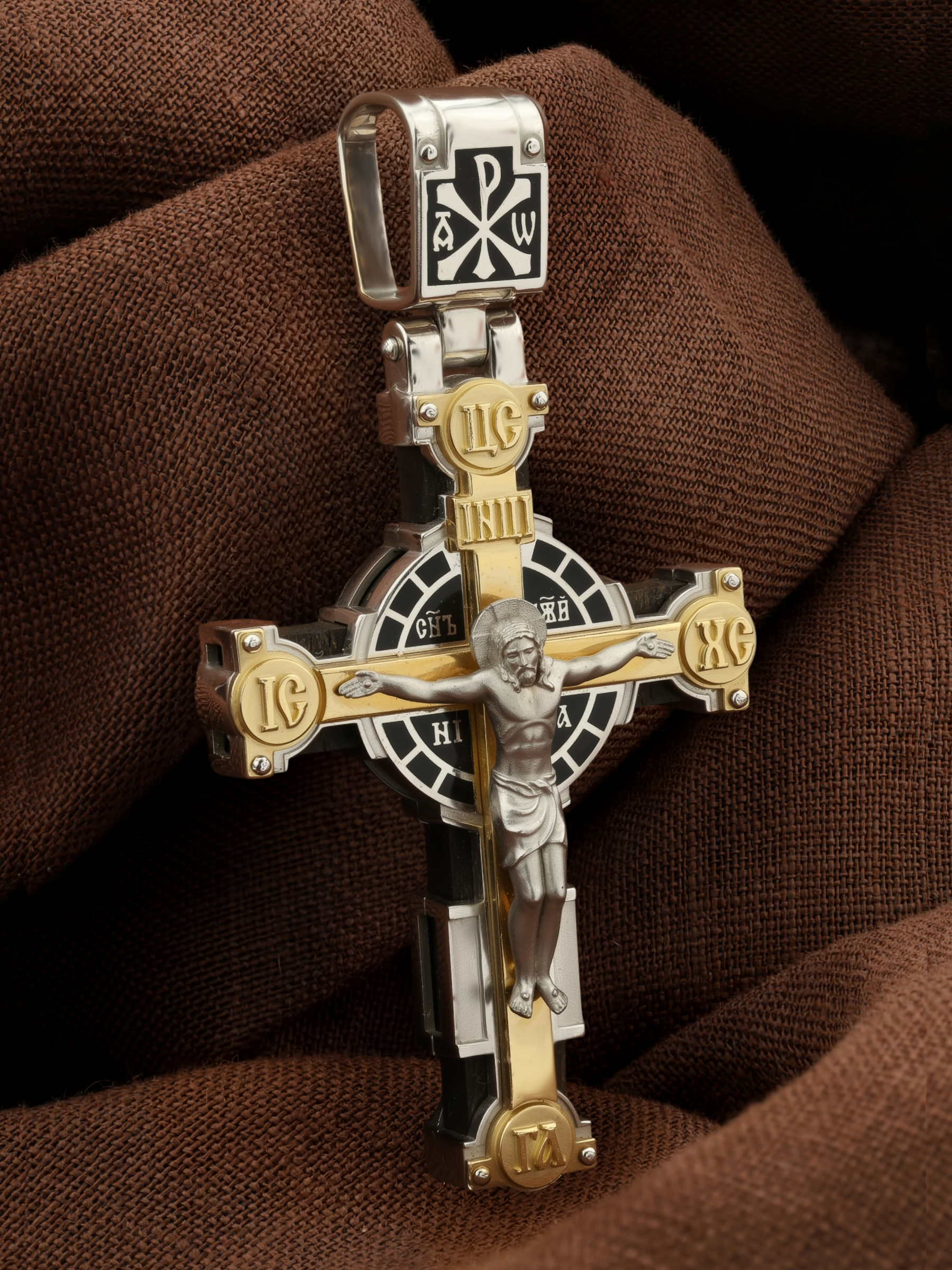 На лицевой стороне креста изображено Распятие Господа и Спасителя нашего Иисуса Христа. Христос, подвергнутый на кресте мучительной казни, своими страданиями искупил нас от древнего греха и даровал нам жизнь вечную. Без Распятия не было бы Воскресения Христова, и поэтому Крест из орудия казни обратился в святыню, в которой действует Благодать Божия. В Голгофе сокрыта непостижимая тайна бесконечной правды и любви Бога. Крест стал символом победы добра над злом, жизни над смертью, напоминанием бесконечной Божьей любви, предметом радости. Воплотившийся Сын Божий Своею кровью освятил крест и сделал его проводником Своей благодати, источником освящения верующих. Через крестную жертву Бог раскрывает нам Свою безмерную любовь и призывает к ответной любви. Над вершиной Распятия помещена надпись «Царь Славы». На верхней табличке, выше головы Иисуса, расположена надпись, составленная Понтием Пилатом — «IНЦI». Она означает «Иисус Назорей, Царь Иудейский». Надпись «IС ХС» означает Иисус Христос помещается на разных сторонах поперечной перекладины креста. Рядом помещены словосочетание «СЫН БОЖИЙ», что означает божественную природу Иисуса Христа и надпись –«НИКА», что означает победитель. Надпись «Г.А.» — голова Адама, грехи которого Христос омыл Своею Кровью, размещена под подножием креста. На православном кресте Христос не умирает, а свободно простирает руки, ладони Иисуса открыты, будто он хочет обнять все человечество, даря им свою любовь и открывая путь к вечной жизни. На кулонном кольце помещен крест Константина — монограмма, известная как «Хи-Ро» («хи» и «ро» — первые две буквы имени Христа по-гречески). Монограмма стала первым общепринятым символом христианства — как знак победы и спасения.