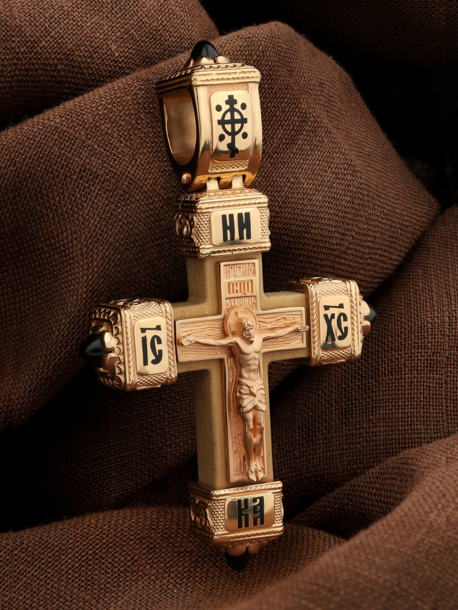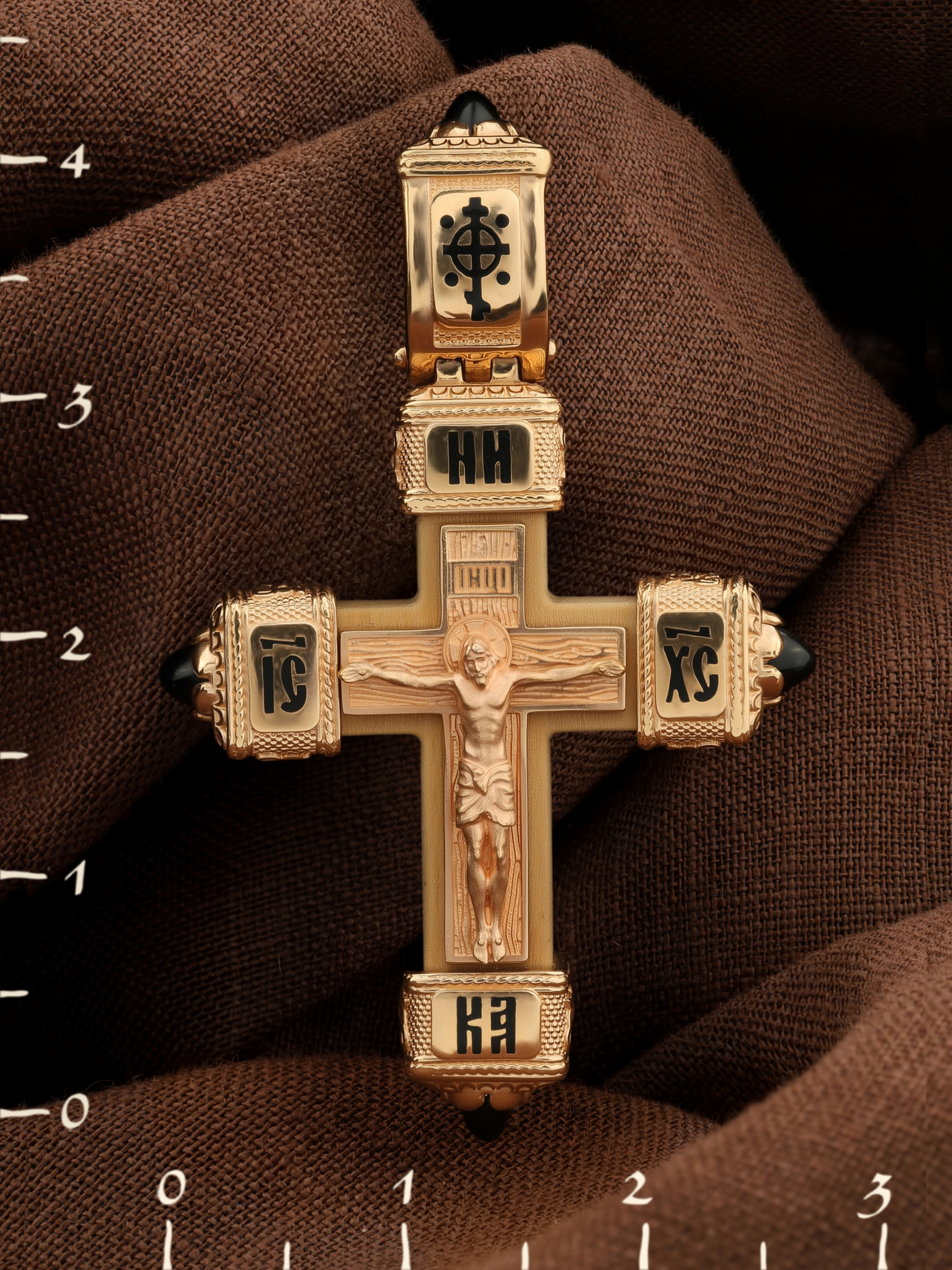 На лицевой стороне креста изображено Распятие Господа и Спасителя нашего Иисуса Христа. Своими крестными страданиями Господь смыл наши грехи, покрыл наш долг перед Богом или, на языке Писания, нас «искупил». В Голгофе сокрыта непостижимая тайна бесконечной правды и любви Бога. Крест стал символом победы добра над злом, жизни над смертью, напоминанием бесконечной Божьей любви, предметом радости. Воплотившийся Сын Божий Своею кровью освятил крест и сделал его проводником Своей благодати, источником освящения верующих. На верхней табличке, выше головы Иисуса, расположена надпись, составленная Понтием Пилатом — «IНЦI». Она означает «Иисус Назорей, Царь Иудейский». Надпись «IC» «ХC», означает Иисус Христос, помещаются на разных сторонах поперечной перекладины креста. Христос в Своей Божественной любви, над которой смерть не властна и которая, страдая, и не страдает в обычном смысле, простирает к людям со Креста Свои объятия, в которые призывается и привлекается весь мир. Поэтому Тело Его не висит, а торжественно покоится на Кресте.