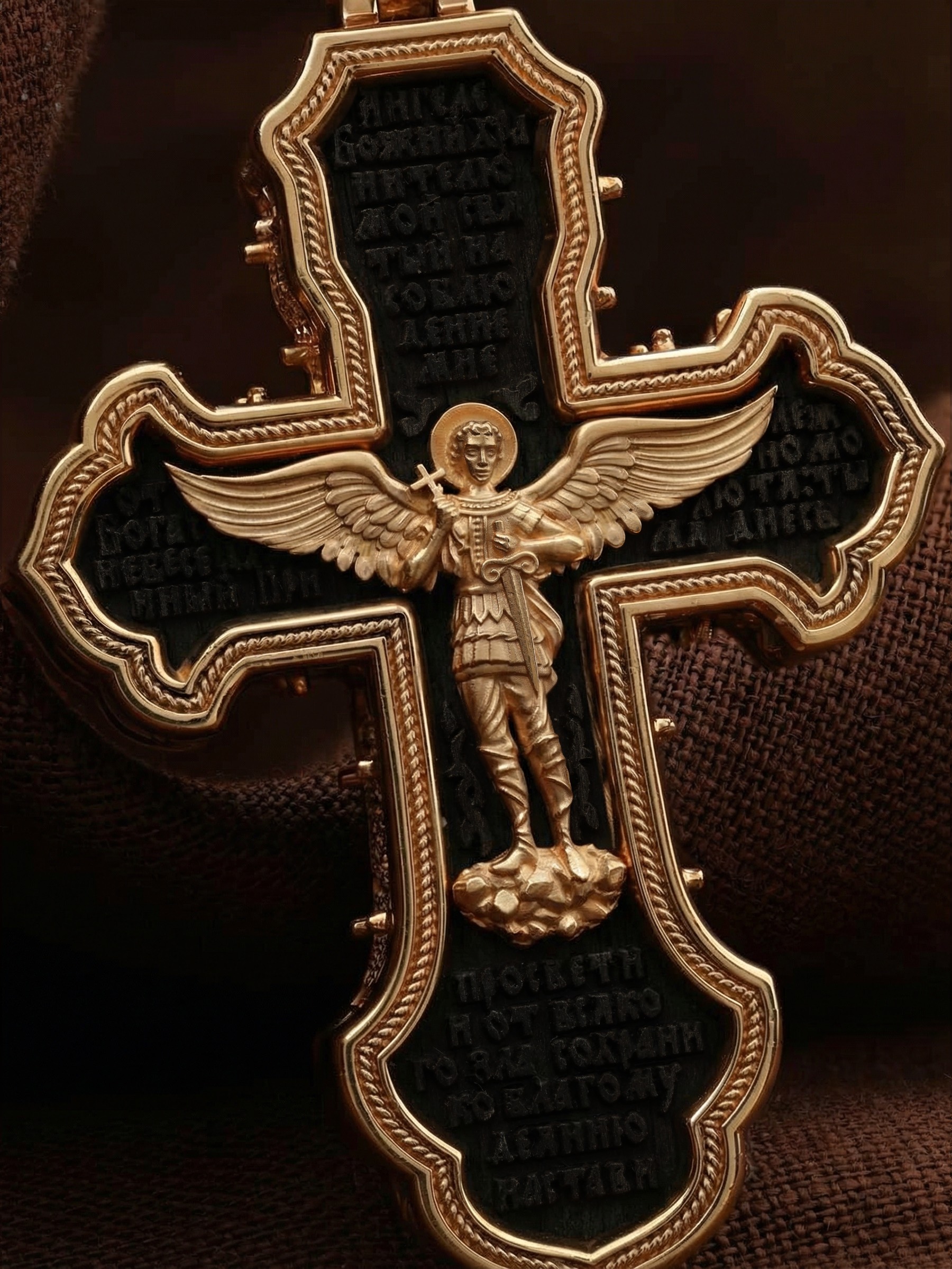 В центре оборотной стороне креста изображен Святой Агнгел-Хранитель в виде юноши держащего в правой руке крест, а в левой — мечь. Агнгел-Хранитель — это Ангел приставляемый Богом к человеку при крещении для охраны и помощи в добрых делах. Он невидимо находится при человеке на протяжении всей его жизни, если человек сохраняет в себе любовь к Богу и истинную веру перед Ним. По сторонам от изображения помещена молитва: «Ангеле Божий, хранителю мой святый, на соблюдение мне от Бога с небесе данный! Прилежно молю тя: ты мя днесь просвети, и от всякаго зла сохрани, ко благому деянию настави…». На кулонном кольце изображена икона Божией Матери «Покров Пресвятой Богородицы».