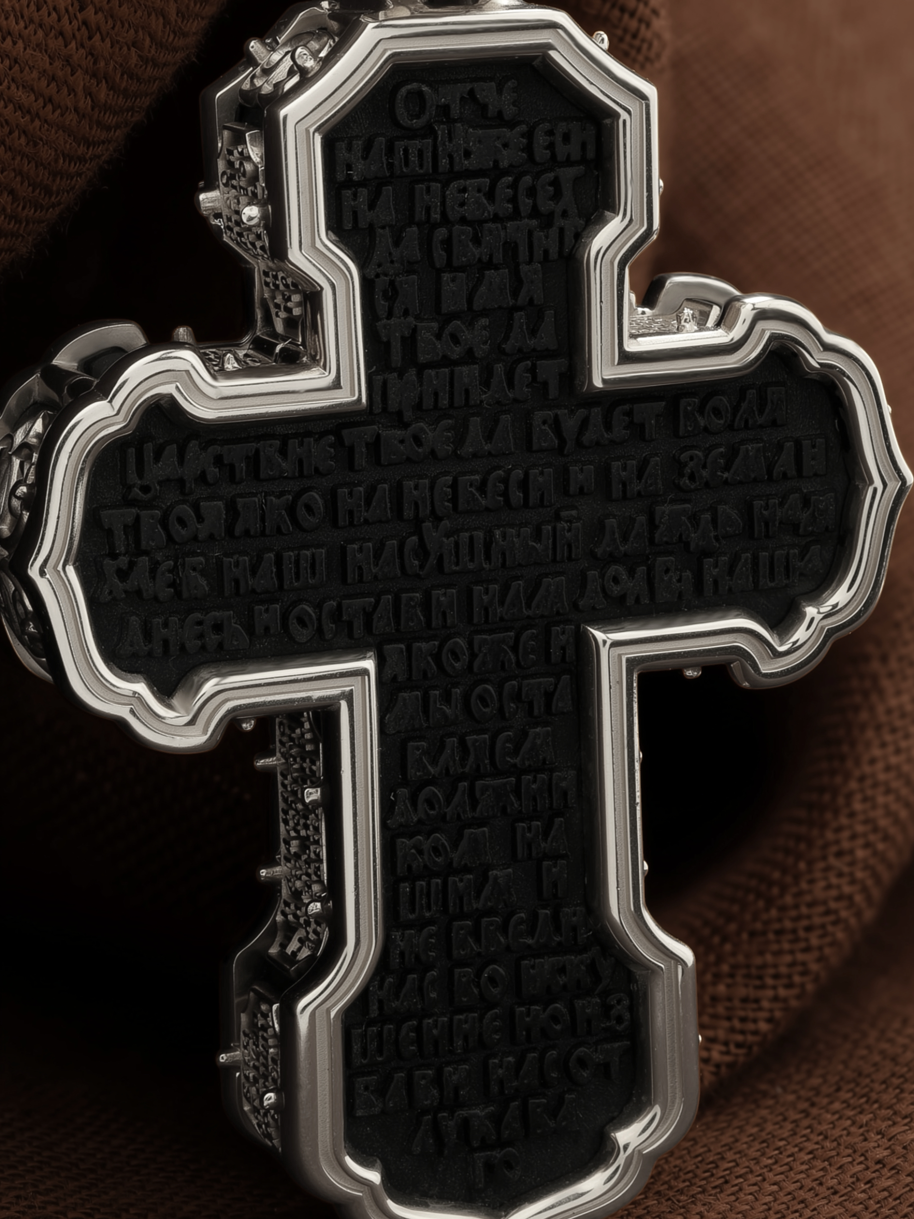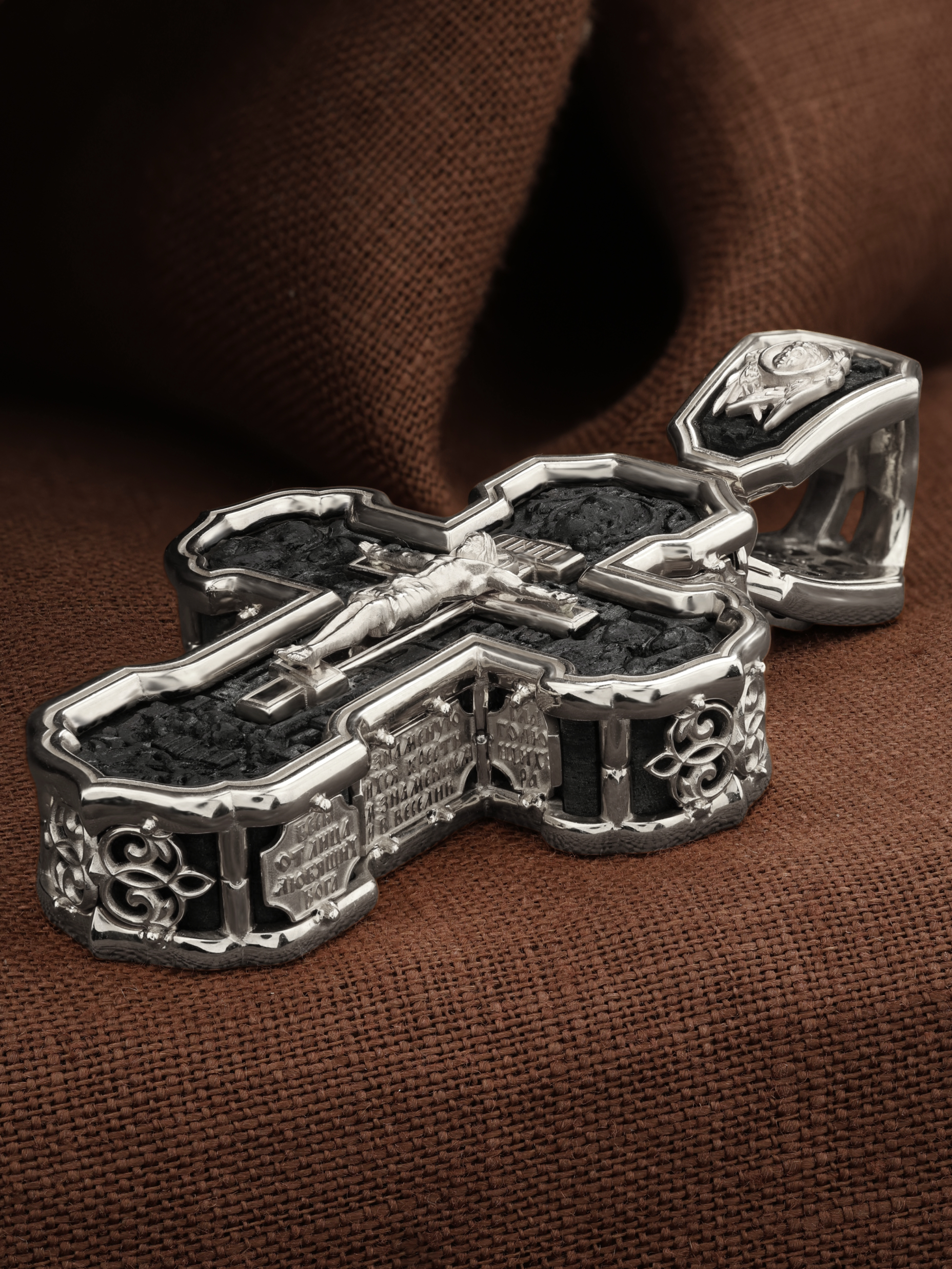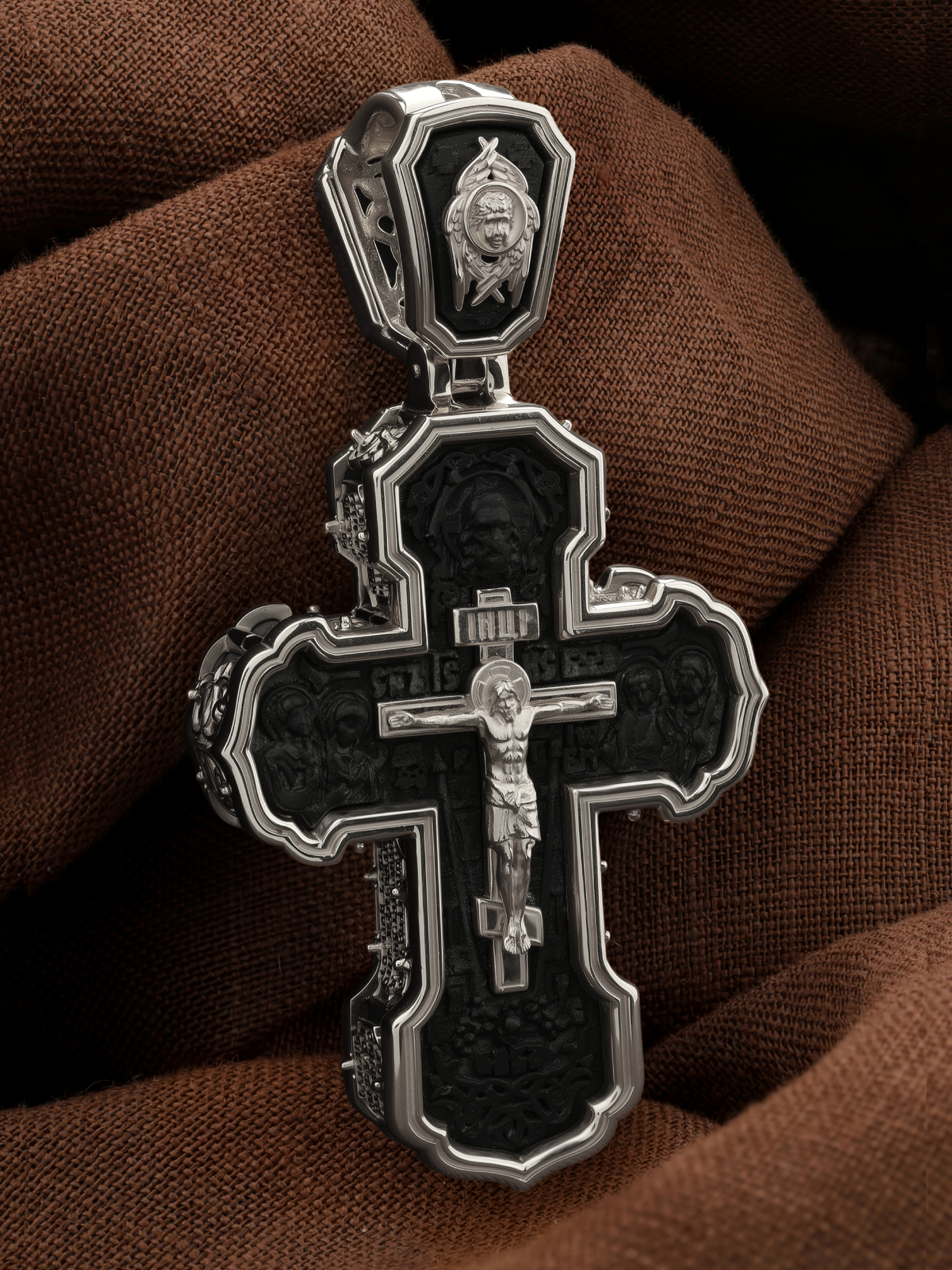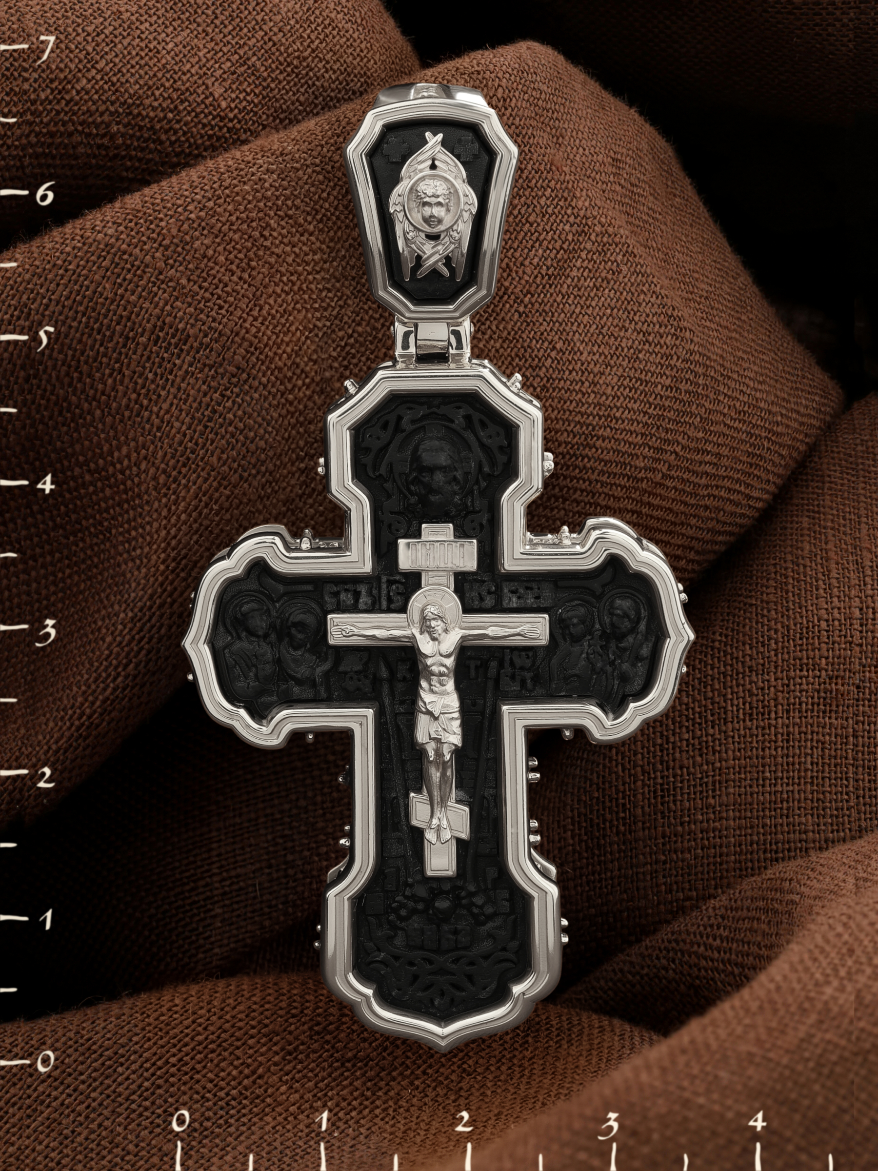 На лицевой стороне креста изображено Распятие Господа и Спасителя нашего Иисуса Христа. Крест- символ спасения и искупления рода человеческого, знамение победы над смертью и адом. Иисус Христос, как искупительная жертва освобождения человечества от власти греха, умер крестной смертью и в третий день воскрес. На верхней табличке, выше головы Иисуса, расположена надпись, составленная Понтием Пилатом — «IНЦI». Она означает «Иисус Назорей, Царь Иудейский». Надпись «IС» « ХС» означает Иисус Христос и помещается на разных сторонах поперечной (большой) перекладины креста. Рядом расположена надпись «Сын Божий». Выше Распятия изображен Нерукотворный образ Господа и Спасителя нашего Иисуса Христа. Слева от Распятия — Пресвятая Богородица и святая мироносица Мария Магдалина с крестом в руке. Справа — апостол и евангелист Иоанн Богослов, один из ближайших учеников Иисуса Христа и сотник Лонгин с крестом в правой руке и копьем — в левой. За крестом высится Иерусалимская стена. Крест стоит на горе камней, символизирующих Голгофу. В ее основании различается череп — это голова Адама. Вдоль креста изображены копие сотника Лонгина и трость с губкой и буквы «К» и «Т». Надпись «МЛРБ» — «место лобное рай бысть» означает, что место лобное стало раем и помещаются в нижней части креста. Рядом — слово «НИКА», что означает «победитель». На православном кресте Христос не умирает, а свободно простирает руки, ладони Иисуса открыты, будто он хочет обнять все человечество, даря им свою любовь и открывая путь к вечной жизни. На кулонном кольце изображен шестикрылый Серафим.