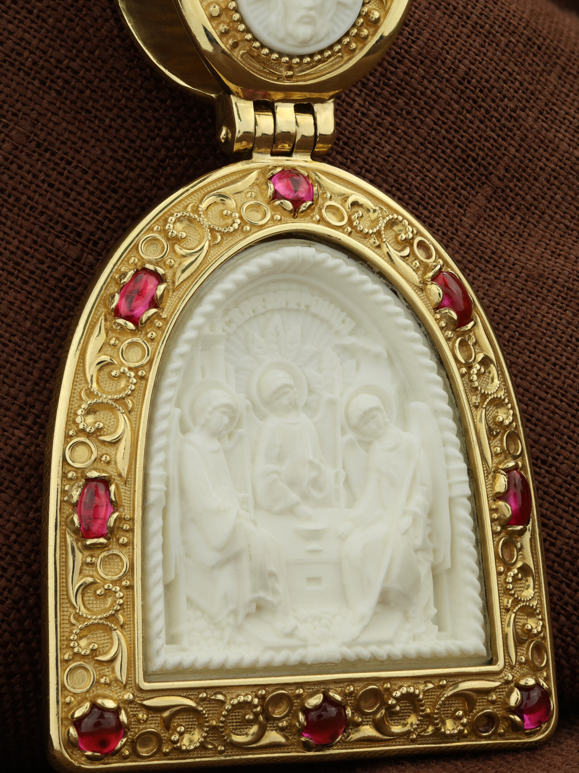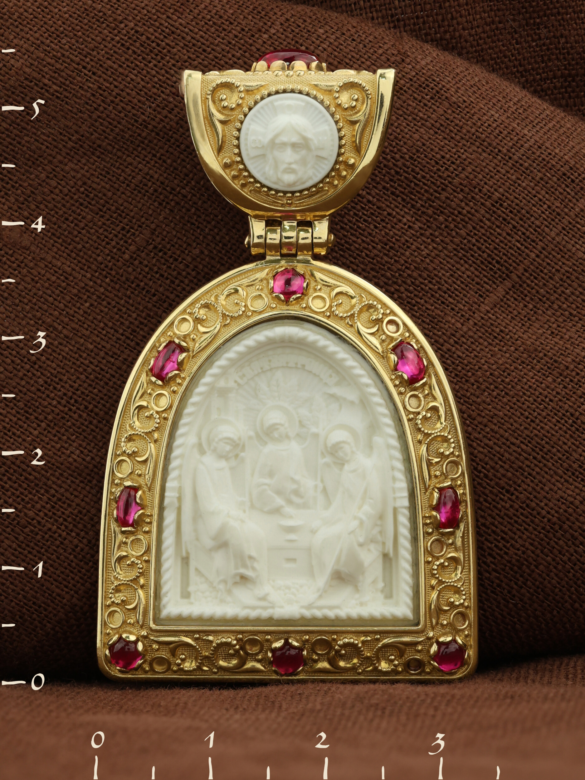 Образок из лимонного золота c эмаль, рубином и бивнем мамонта