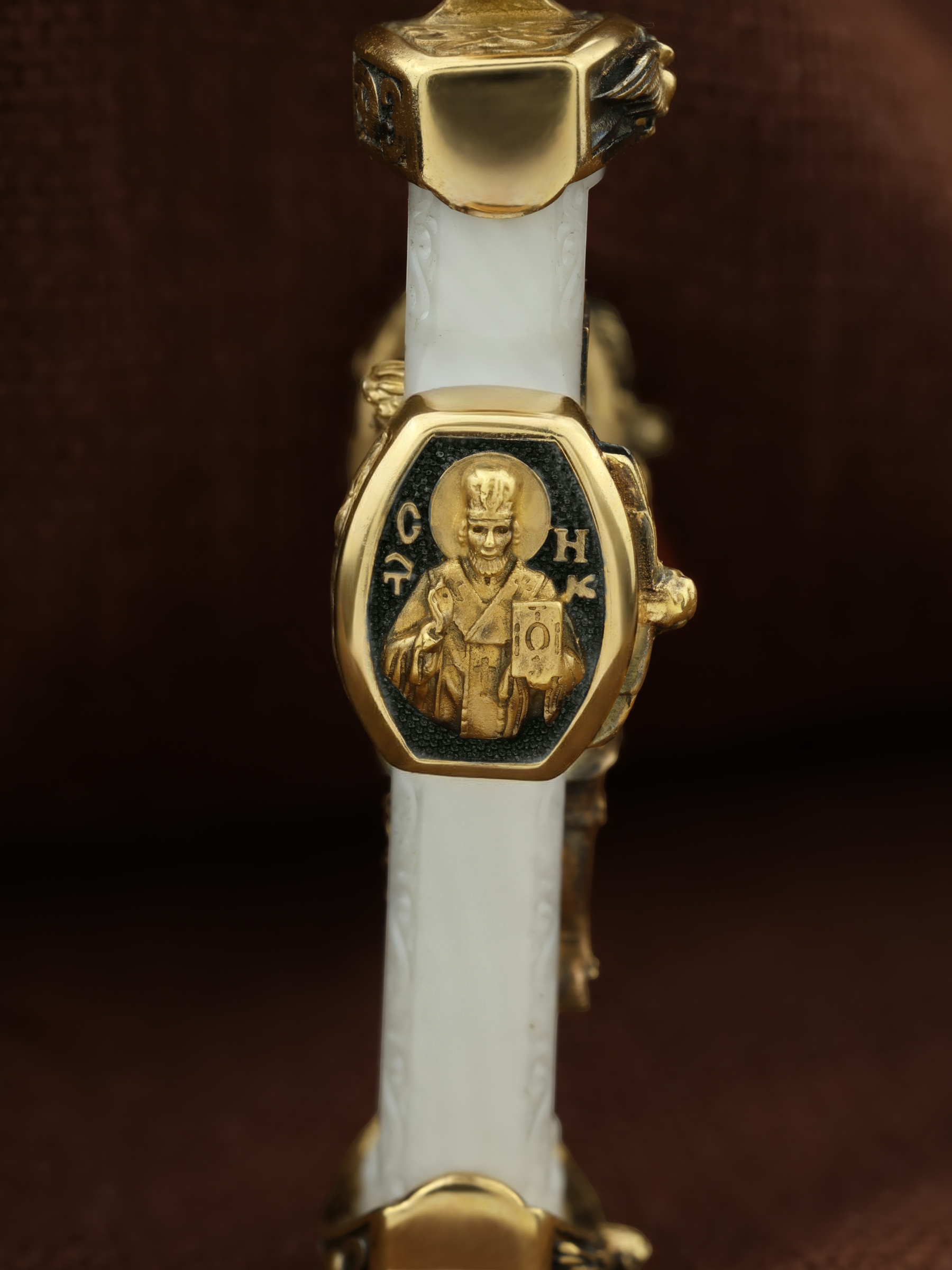 На торце изделия с левой стороны помещена икона Святого Николая Чудотворца — самый почитаемый в Православной Церкви, которого еще называют Николай Угодник за то, что он угодил своей жизнью Богу. Николай Чудотворец, помощник в делах, покровитель учащихся, утешитель обиженных и нуждающихся, целитель самых страшных и тяжелых недугов, предстатель и молитвенник за людей перед Богом. Также Святитель Николай Чудотворец известен своими молитвами за путешественников, когда непрестанный ветер и бушующие волны утихают и корабль заходит в спокойную гавань. На торце изделия с правой стороны — икона Святого Иоанна Крестителя. Святой Иоанн был последним пророком Израиля. Он призывал к покаянию, предвозвещая приближение Царствия Небесного (Мф. 3, 2), и удостоился стать Крестителем Христа. Иисус Христос говорит о нем: «Сей есть о котором написано: «Вот, Я посылаю Ангела Моего пред лицем Твоим, который приготовит путь Твой пред Тобою» (Лк. 7, 27). И еще: «Из рожденных женами нет ни одного пророка больше Иоанна Крестителя» (Лк. 7, 28).