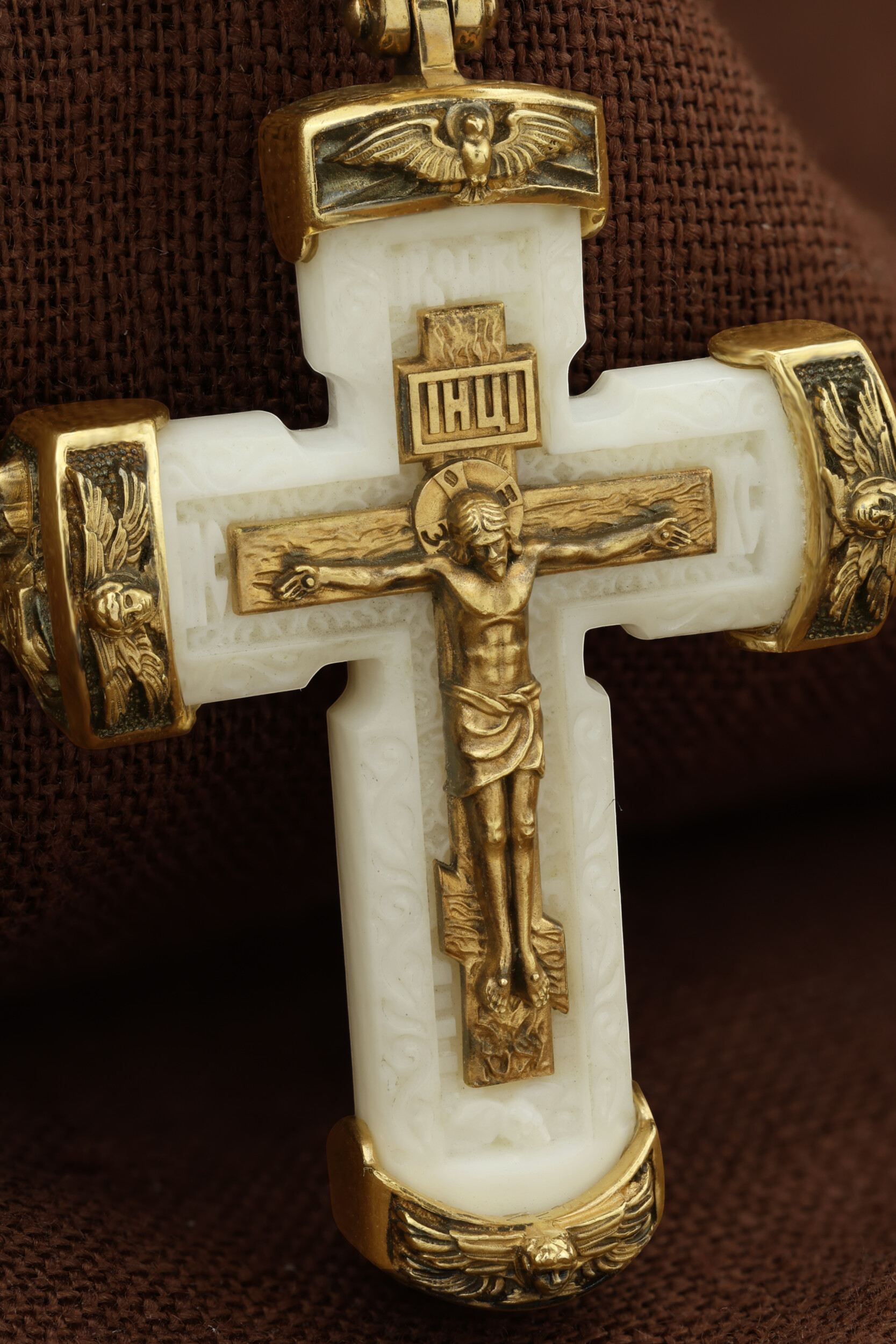 На лицевой стороне креста изображено Распятие, потому что это орудие казни Иисус Христос сделал орудием победы над грехом и смертью. Своими страданиями Он искупил грехи человечества, умерев и сошествовав во ад, победил сатану, освободил души праведников от вечной смерти и открыл им небесные врата рая. Жертва Христа сделала возможным спасение для каждого человека. На православном кресте Христос не умирает, а свободно простирает руки, ладони Иисуса открыты, будто он хочет обнять все человечество, даря им свою любовь и открывая путь к вечной жизни.