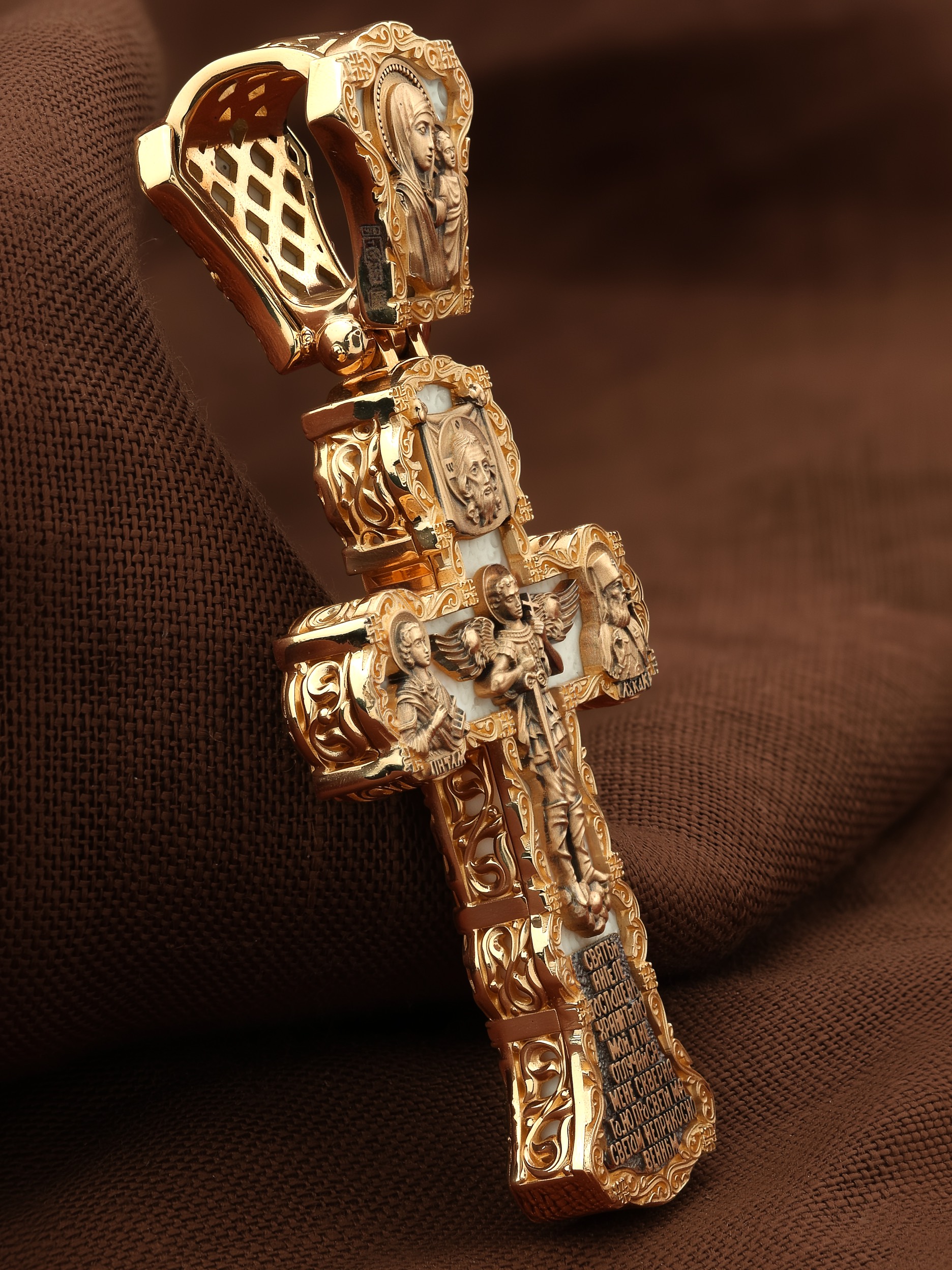 На центральной части оборотной стороны креста изображен Святой Ангел-Хранитель в виде прекрасного юноши держащего в правой руке крест, а в левой — мечь. Ангел-Хранитель — это Ангел приставляемый Богом к человеку при крещении для охраны и помощи в добрых делах. Невидимо пребывая при нас постоянно, он, руководствуя нас ко спасению, не только по нашему желанию таинственно наставляет нас на все доброе и полезное, не только возносит наши молитвы к Богу, но еще и сам от себя охраняют и защищают нас от врагов видимых и невидимых и ходатайствует за нас пред Богом. Ниже образа написана молитва: «Святый Ангеле Господень, Хранитель мой, не отлучайся мене скверного, но просвети мя светом неприкосновенным.» Выше образа изображен Спас Нерукотворный — образ Господа и Спасителя нашего Иисуса Христа, чудесно отпечатавшийся на плате, котором Христос вытер свой лик. Слева — Свя¬той ве¬ли¬ко¬му¬че¬ник и це¬ли¬тель Пан¬те-ле¬и¬мон. Господь даровал удивительную силу его молитве. Ею он исцелял любые болезни, воскрешал мертвых. Справа — Святитель Лука (Войно-Ясенецкий). На кулонном кольце изображена Казанская икона Божией Матери — одна из самых любимых на Руси.