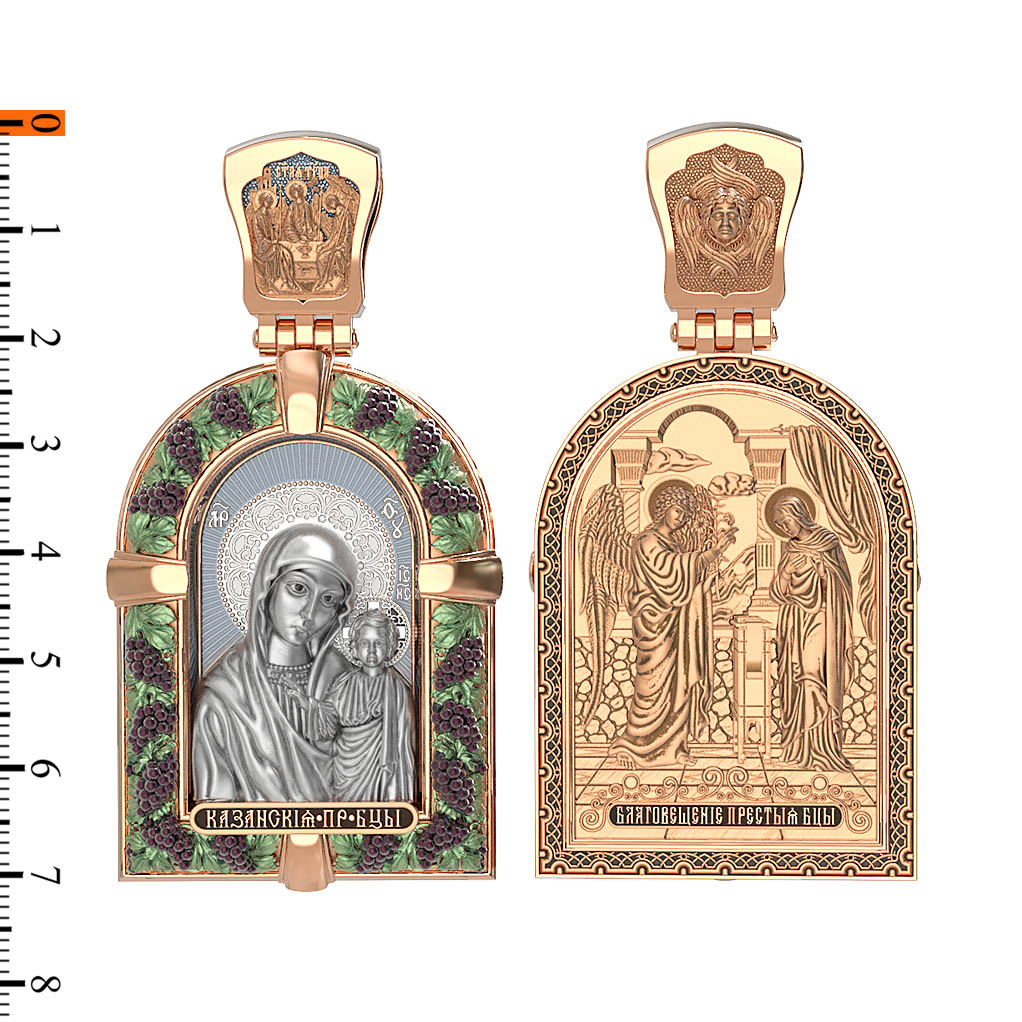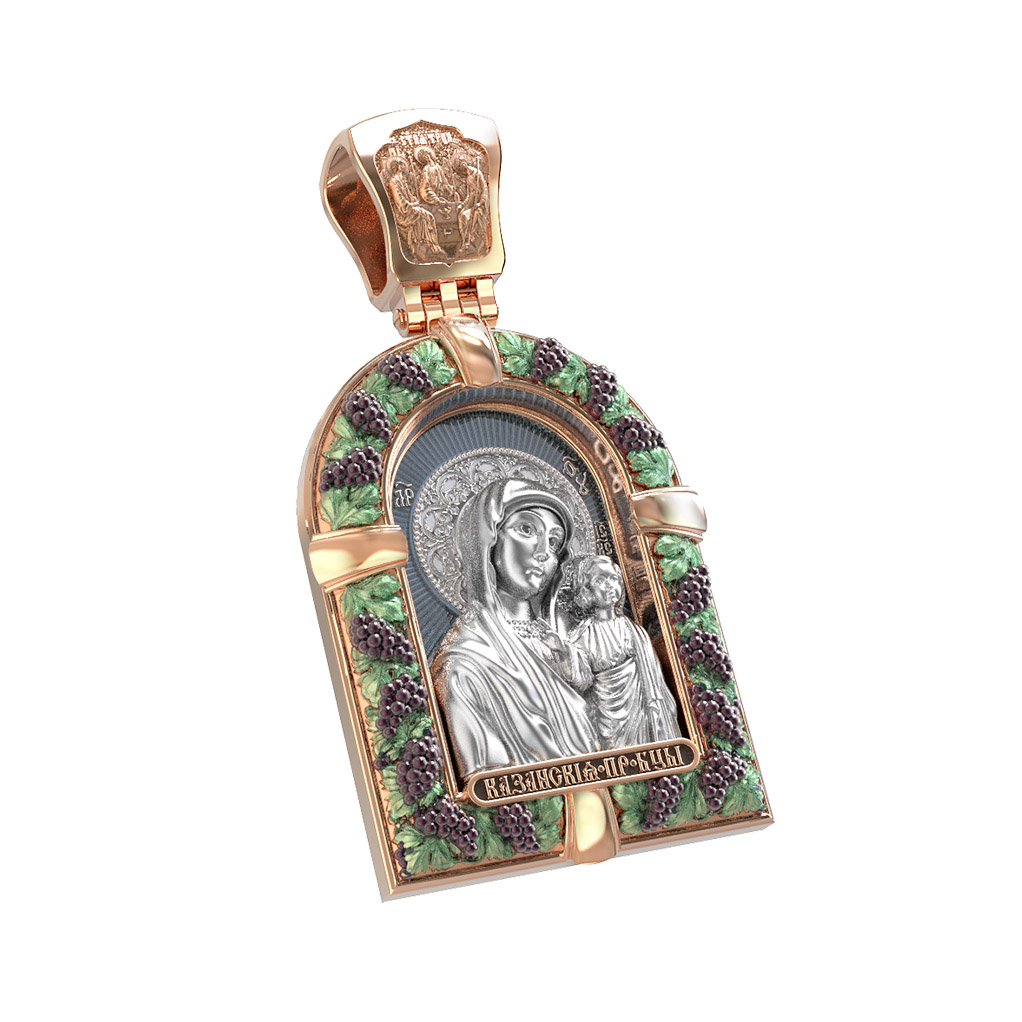 Казанская икона Божией Матери — одна из самых почитаемых в России чудотворных икон Богородицы. Богословское значение Казанской иконы — указать верующим истинный Путь к спасению, который лежит через Христа. Только Божия Матерь имеет настолько сильное дерзновение к Спасителю, что может ходатайствовать перед Ним за всех верных. Именно этот образ дарится новой повенчанной паре, как хранитель очага и семейная реликвия. Молитва перед Казанской иконой Божьей Матери помогает во всех сложных случаях жизни, в болезнях, во всех печалях, невзгодах, скорбях. Уникальная история появления, чудеса, случившиеся по молитвам православных людей возле образа — все это делает Казанскую Богородицу особенной, среди тысяч других икон. Вверху — икона Святой Троицы, на которой запечатлено явление Триединого Бога праотцу Аврааму в виде трех ангелов. Образок обвивает виноградная лоза — один из самых распространенных символических образов христианства. Она является символом Иисуса Христа, Который в Евангелии говорит о Себе: «Я есмь истинная виноградная лоза, и Отец мой — виноградарь». (Ин. 15:1). Поэтому именно из винограда изготавливается вино для Причастия, призванное символизировать Кровь Христову.