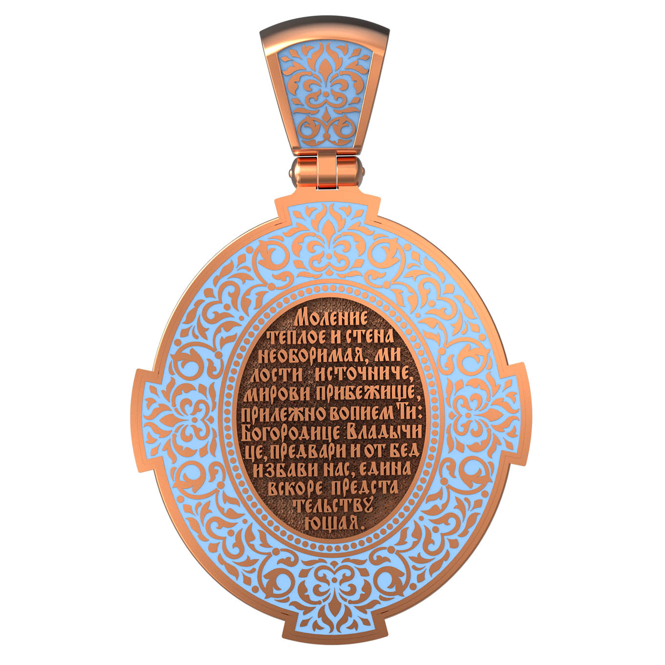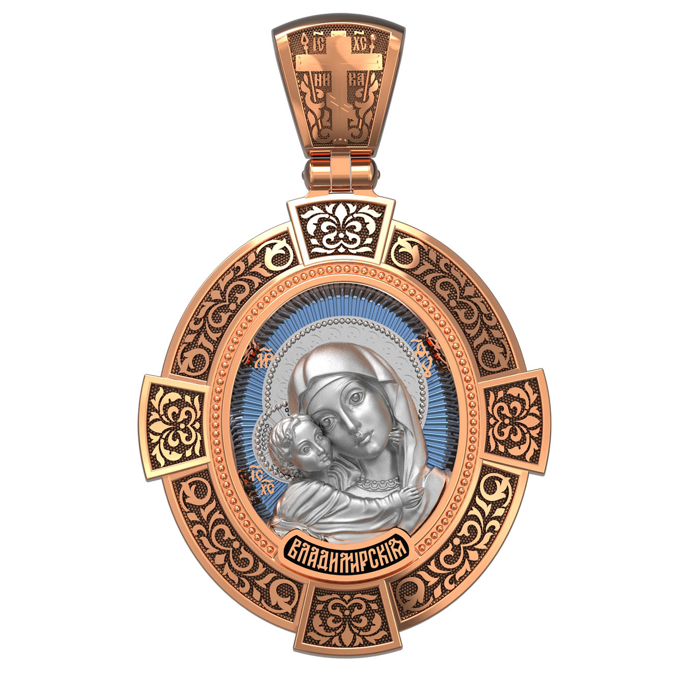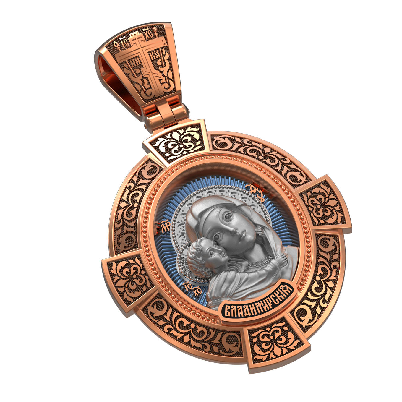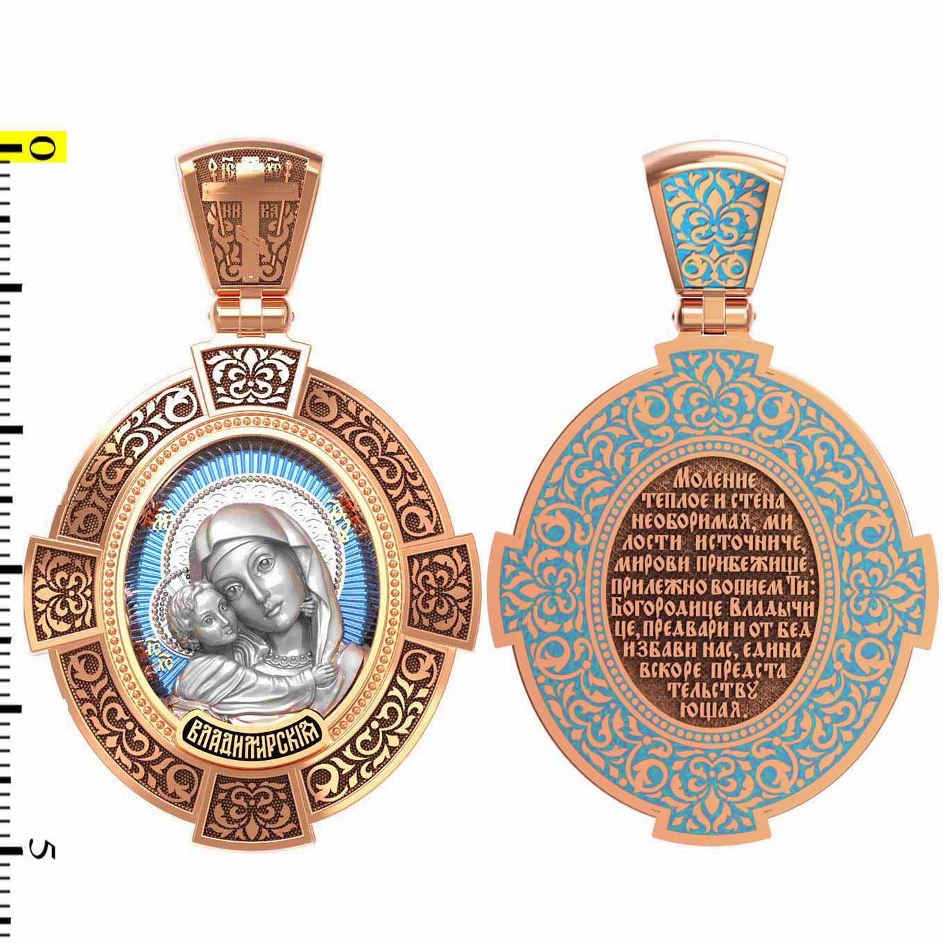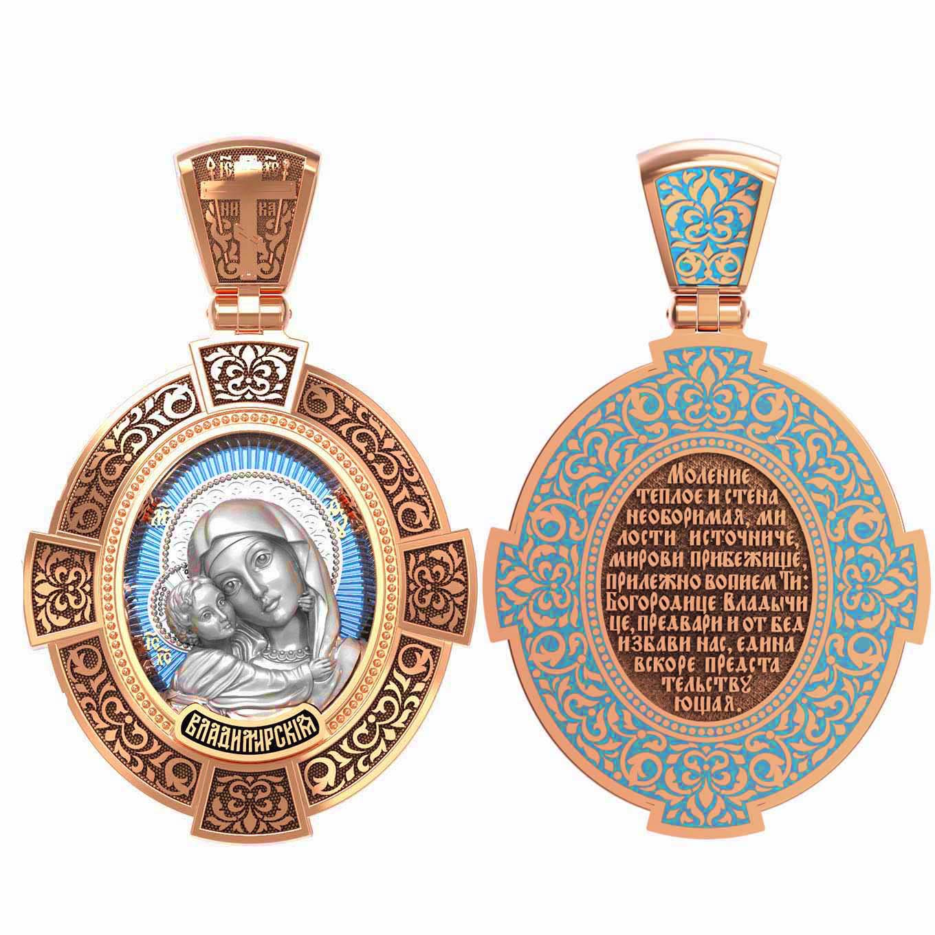 На лицевой стороне образка изображена Владимирская икона Божией Матери — одна из самых чтимых святынь Русской православной церкви. По преданию, икона была написана Святым апостолом и евангелистом Лукой во время земной жизни Богородицы. Дева Мария, увидев Свое изображение, молвила: «Отныне ублажат Мя вси роди. Благодать Рождшегося от Меня и Моя с сим образом да будет». Образ написан в лирическом иконографическом типе «Умиление». Младенец припал щекой к щеке Матери и тянется к ней правой рукой, другой нежно обнимая за шею. Икона вплоть до V века находилась в Иерусалиме, затем была перевезена в Византию. На Русь икона была привезена в 1131 г. За прошедшие столетия святыня неоднократно переезжала из Владимира в Москву и обратно, не раз спасая страну от захватчиков. Русская Православная Церковь установила троекратное празднование Владимирской иконе Божьей Матери. Каждый из дней празднования связан с избавлением русского народа от порабощения иноплеменниками по молитвам ко Пресвятой Богородице. В последующие века у иконы происходили многие важные исторические события: подписание актов, принятие присяги значимых государственных деятелей и возведение на престол. На кулонном кольце изображен Спас Нерукотворный — образ Господа и Спасителя нашего Иисуса Христа, чудесно отпечатавшийся на плате, котором Христос вытер свой лик.